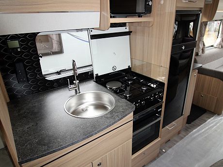 Interior design upgrades on the Bailey Pegasus caravans include standard 'Goldhawk' soft furnishings scheme complete with four scatter cushions and Bailey light oak furniture finish. Italian design curved locker doors and branded Perspex kitchen splashback with chrome detailing, plus a new circular stainless steel kitchen sink and drainer