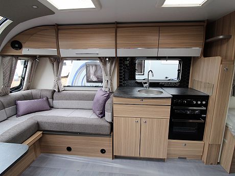 Interior design upgrades on the Bailey Pegasus caravans include standard 'Goldhawk' soft furnishings scheme complete with four scatter cushions and Bailey light oak furniture finish. Italian design curved locker doors and branded Perspex kitchen splashback with chrome detailing, plus a new circular stainless steel kitchen sink and drainer