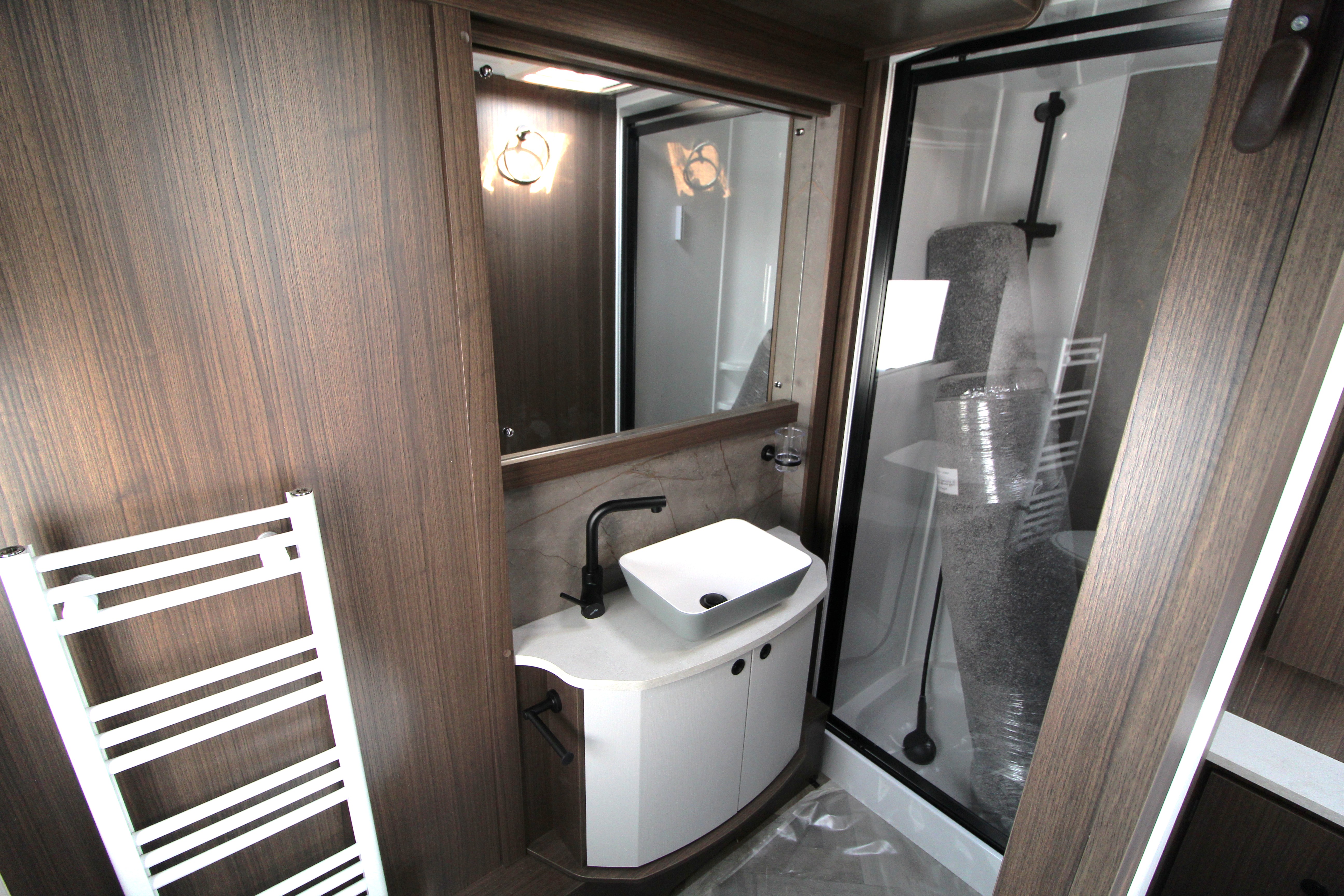 NEW Shaped shower ith black salon style doors in the 545 and 845 Xtra