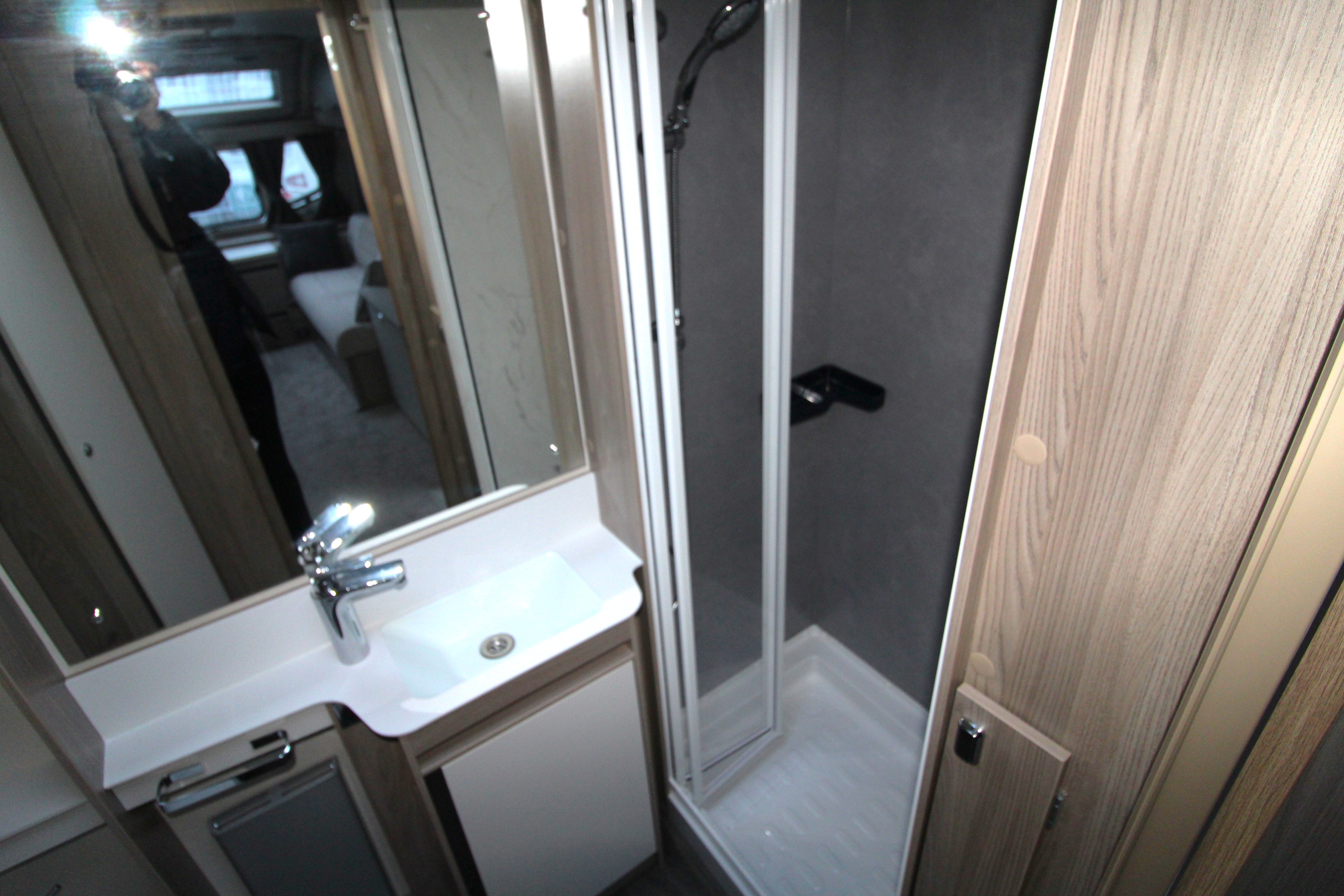 Washroom Redesigned washroom incorporating shower console and durable shower tray. Power shower Ecocamel Jetstorm showerhead with on/off button for a powerful shower that uses less water. Toilet Thetford toilet with electric flush and 18 litre wheeled waste tank. Boutique touches Stylish handleless furniture, chrome effect swivel spout vanity tap, additional towel ring (model specific), shower hanging rail (model specific), and towel rail above radiator (model specific).