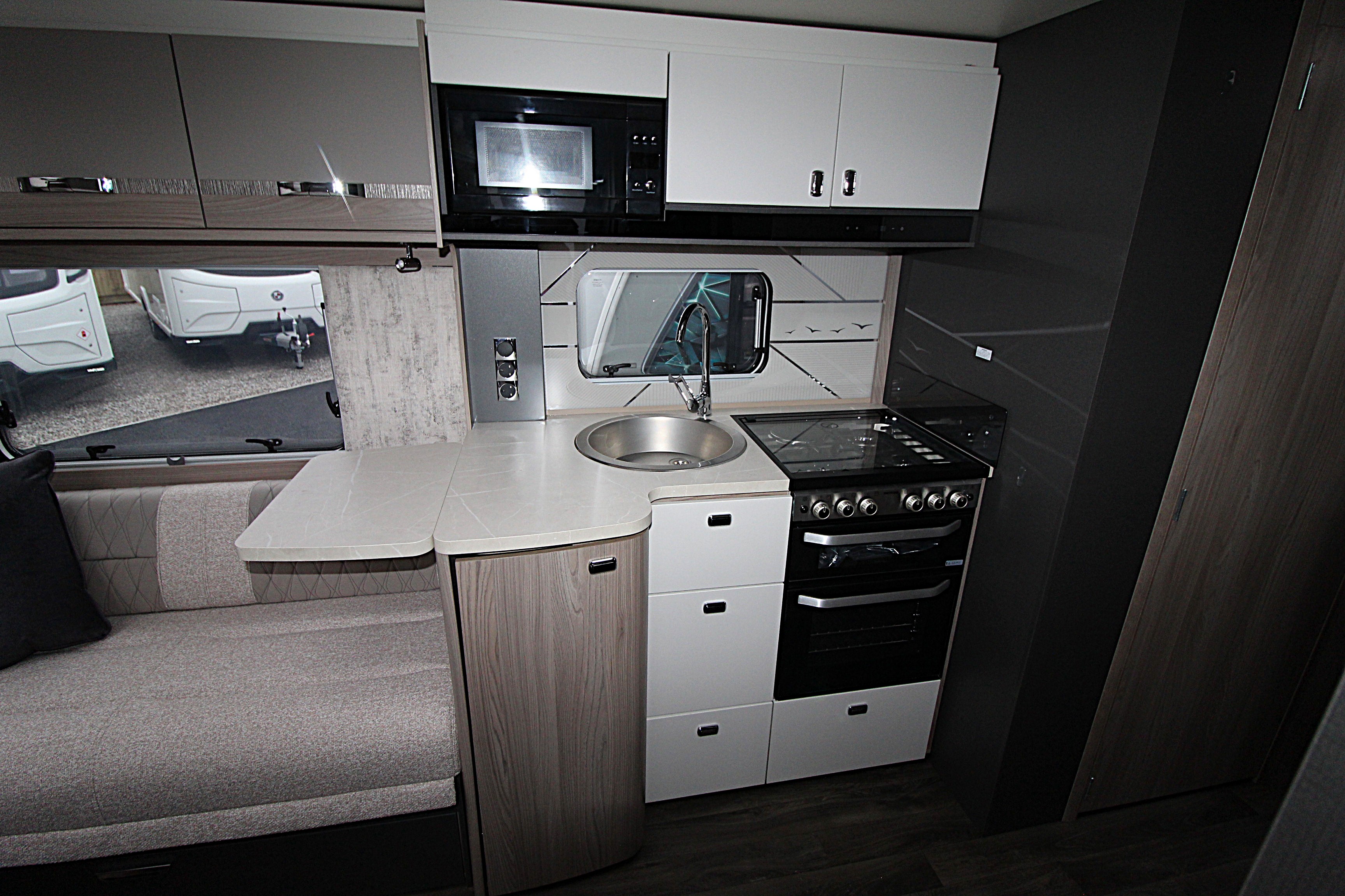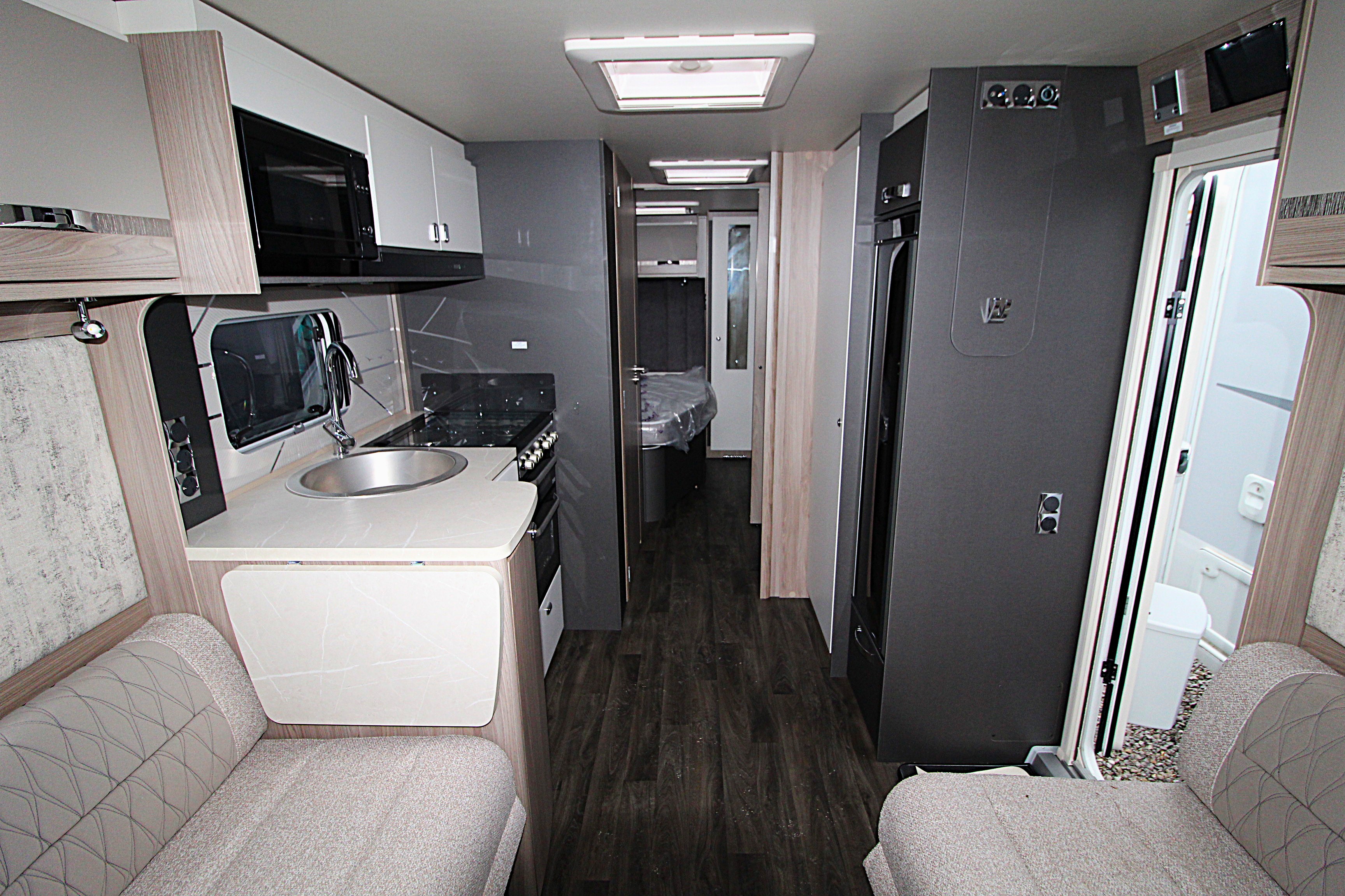 Challenger Grande excels in delivering a welcoming and spacious caravan interior. The extra width allows for a wider opening central window, a larger front bed make-up and exterior access lockers
