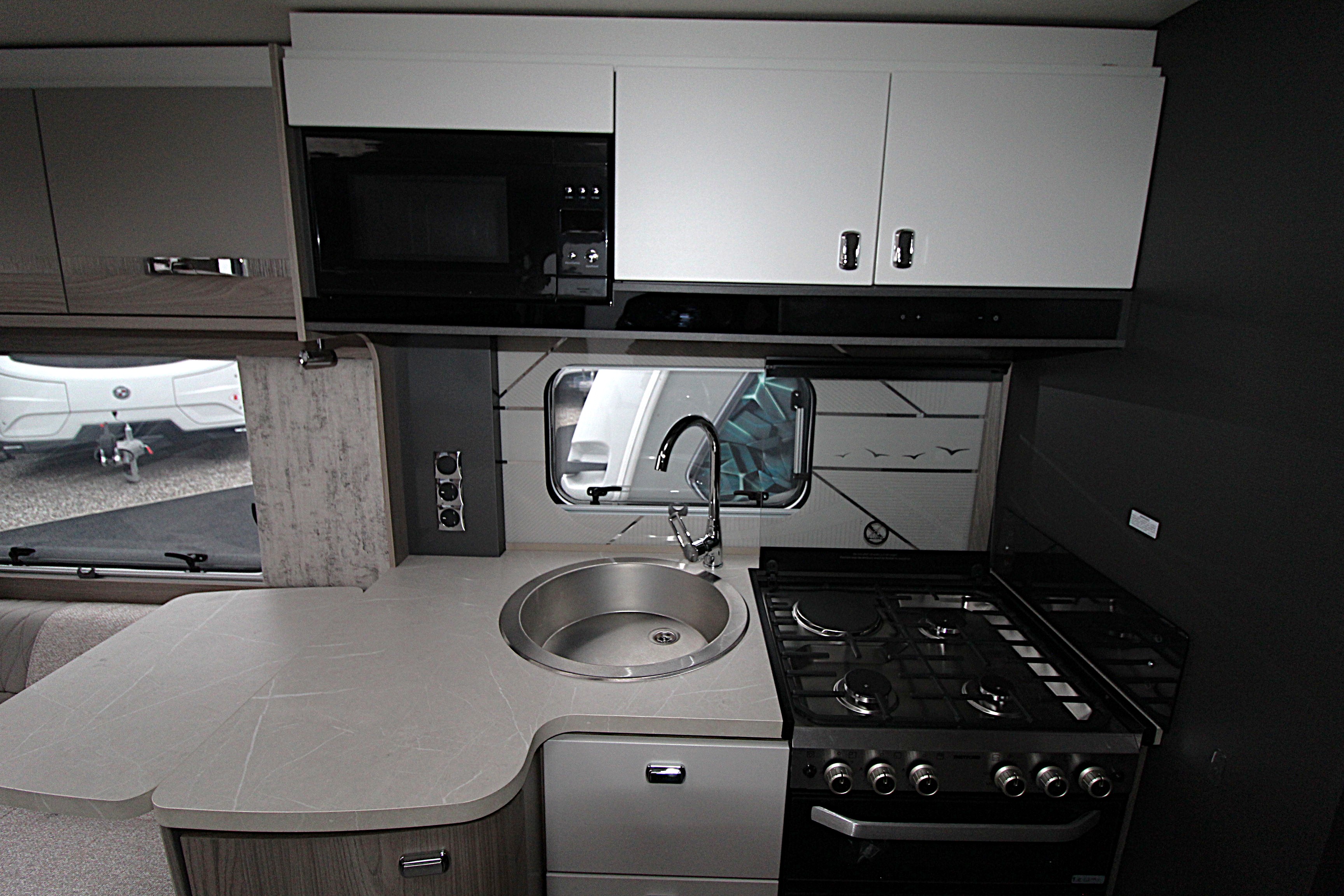 Challenger Grande excels in delivering a welcoming and spacious caravan interior. The extra width allows for a wider opening central window, a larger front bed make-up and exterior access lockers.