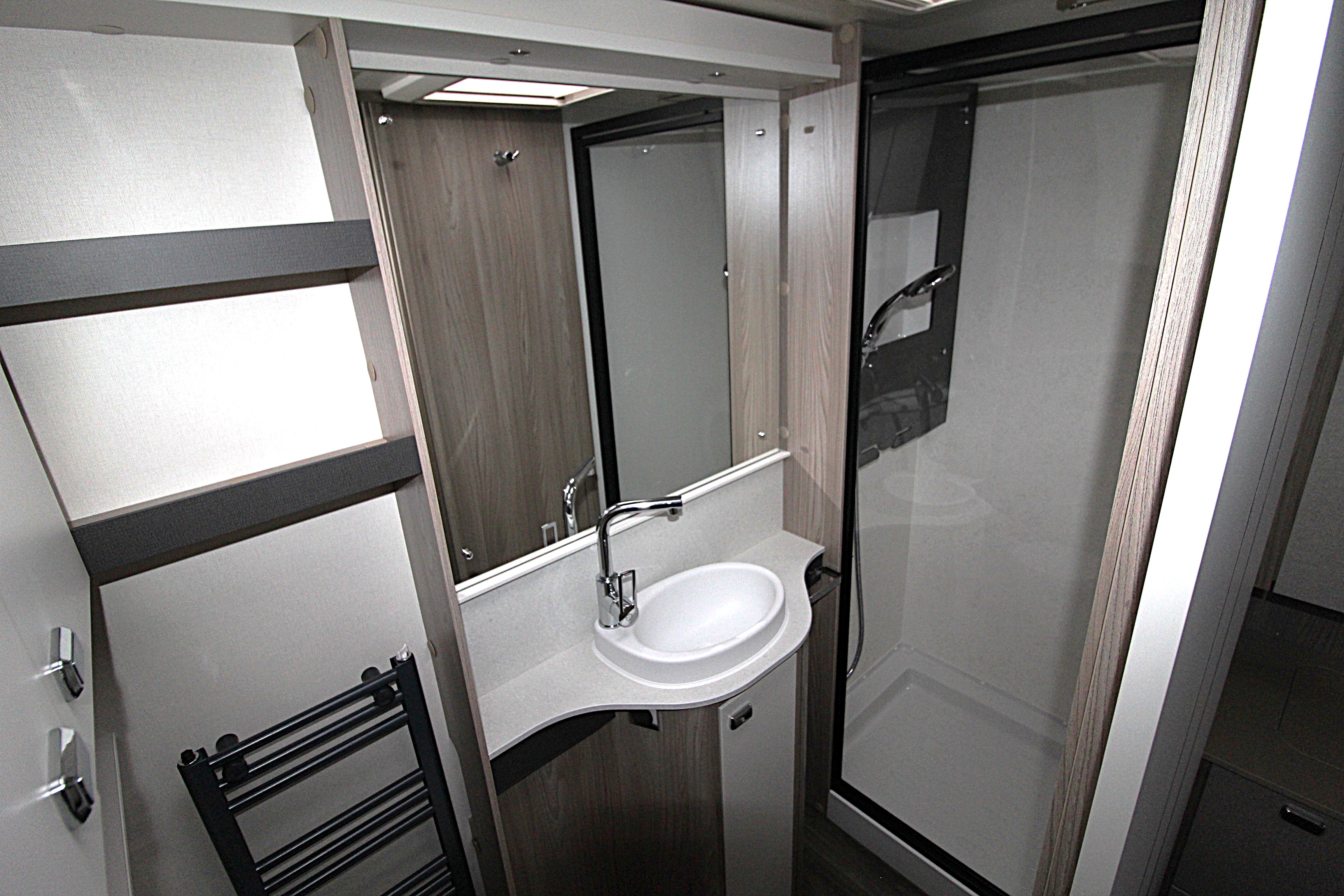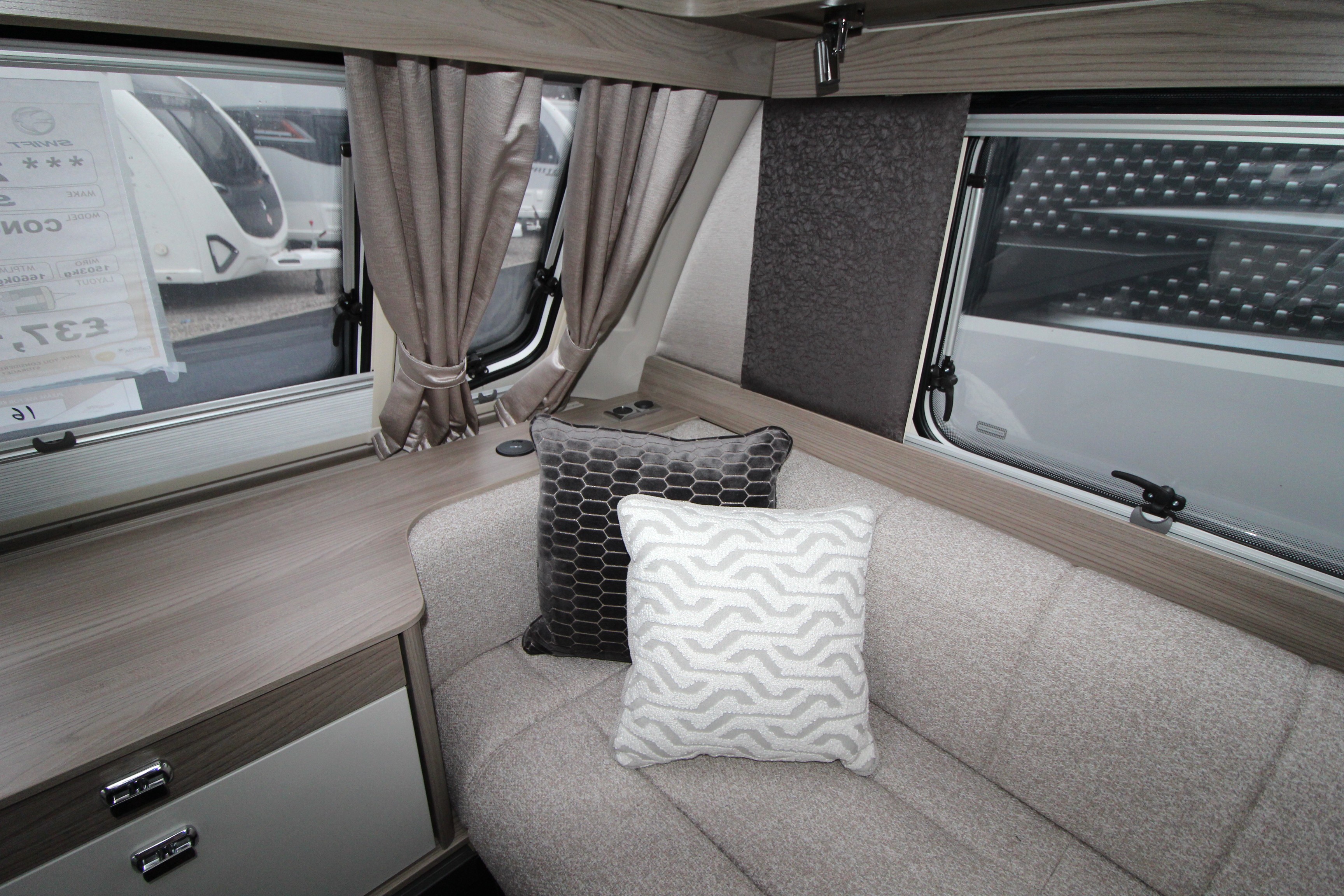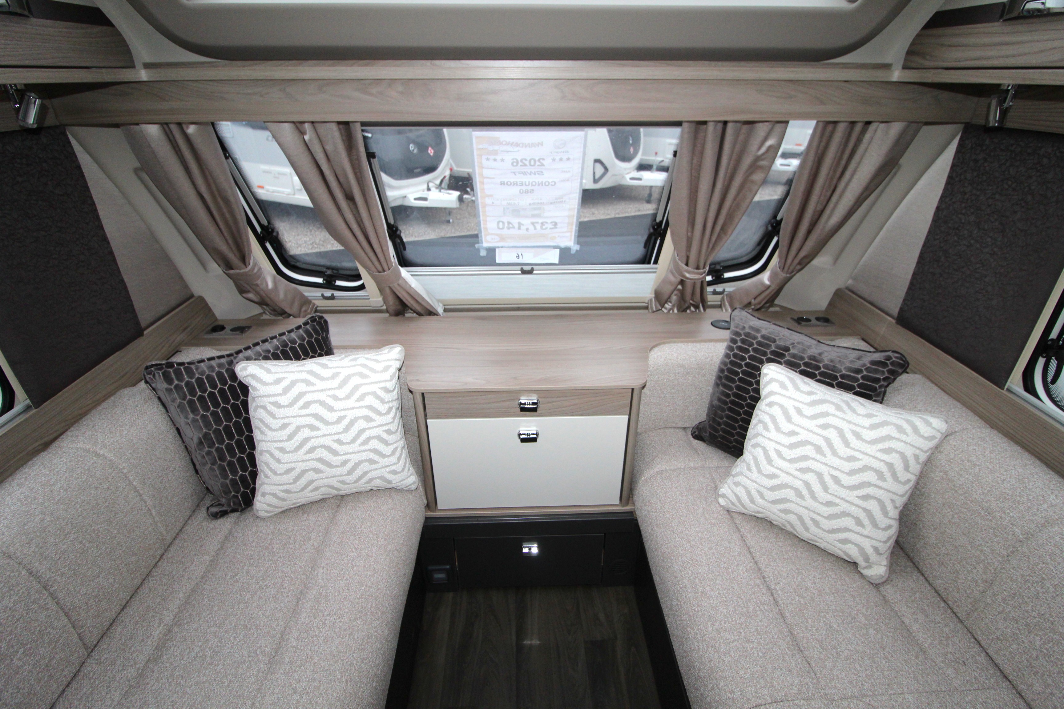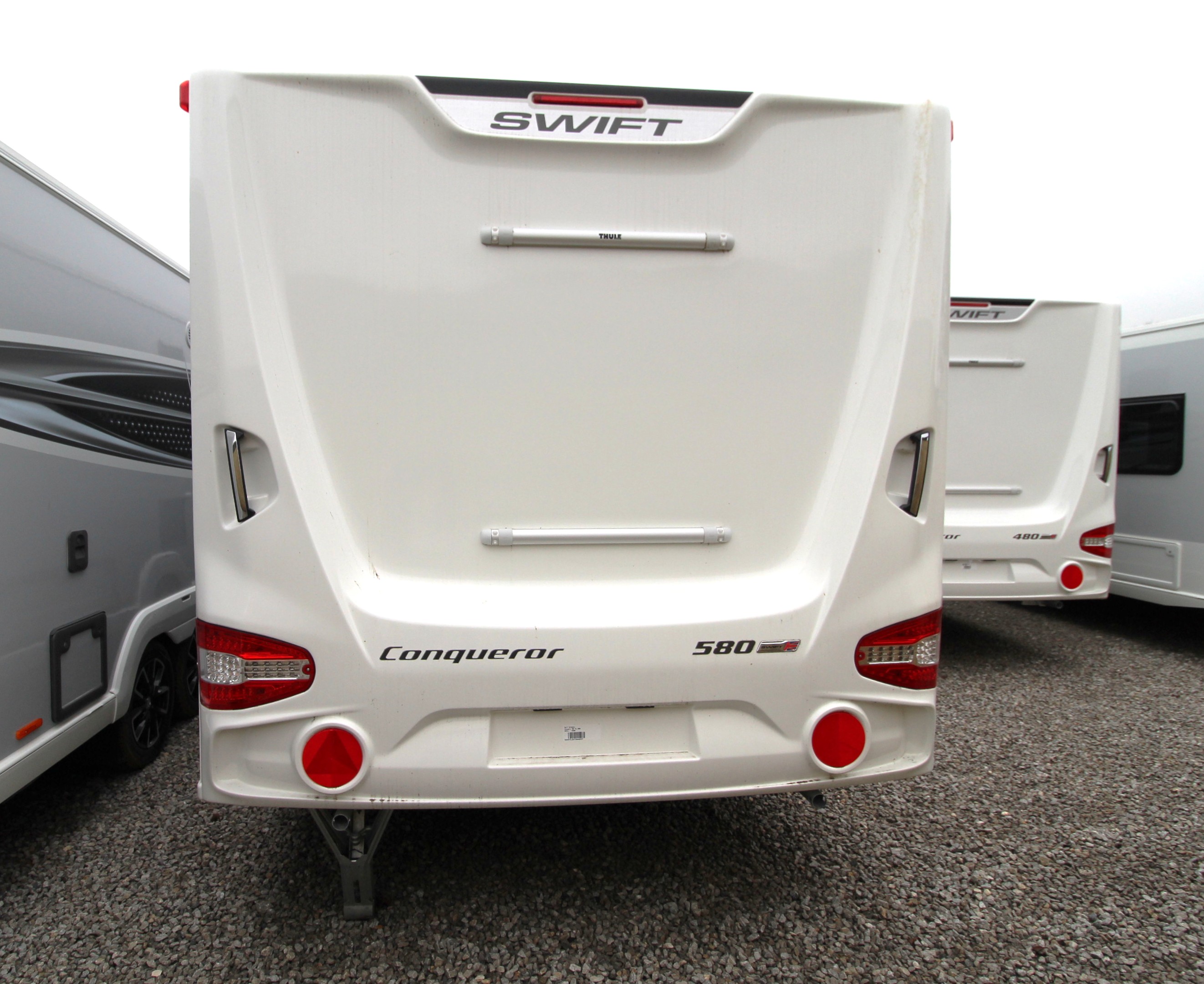 The Swift Conqueror 580 is a four berth, open plan layout featuring a transverse island bed and full width end washroom.