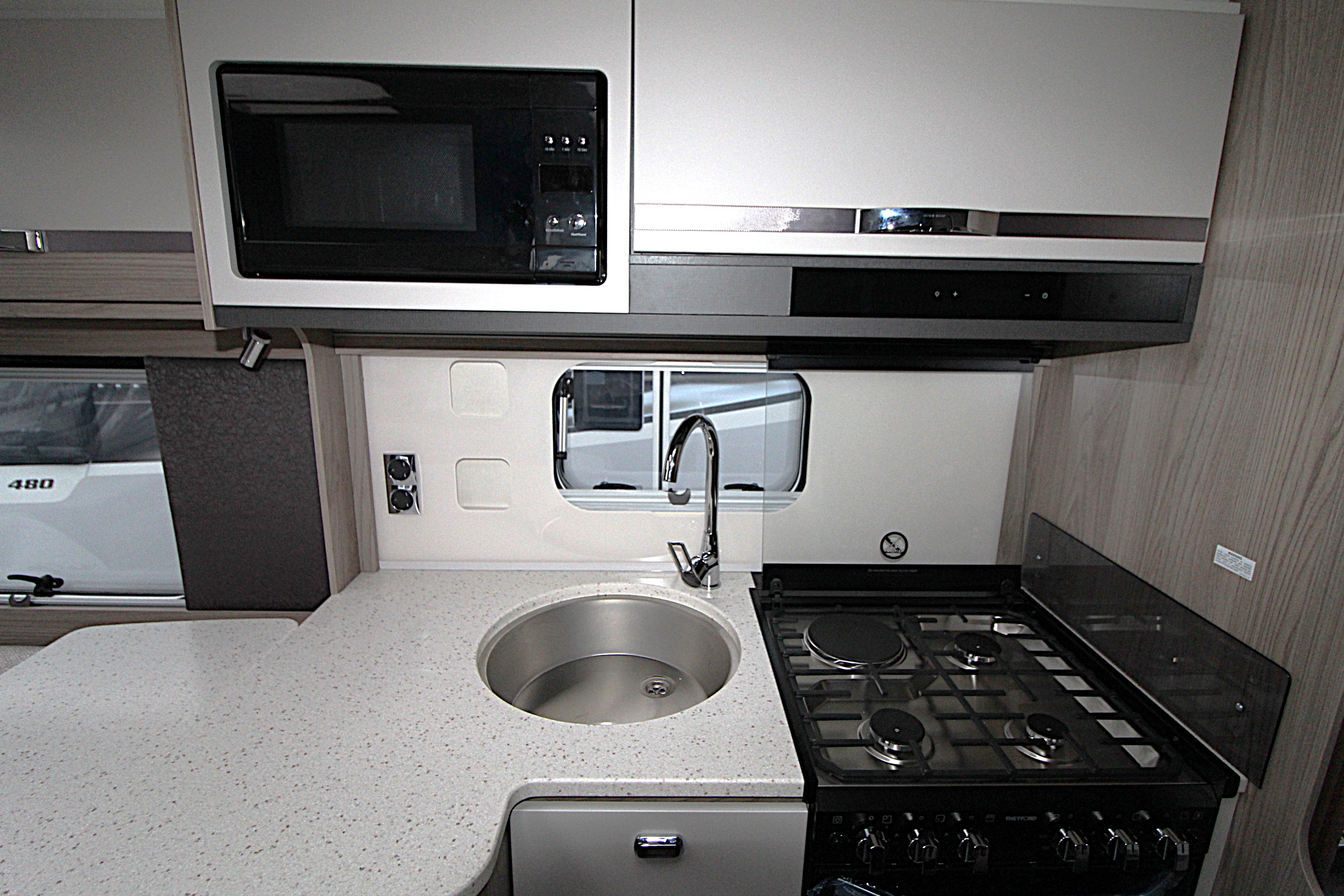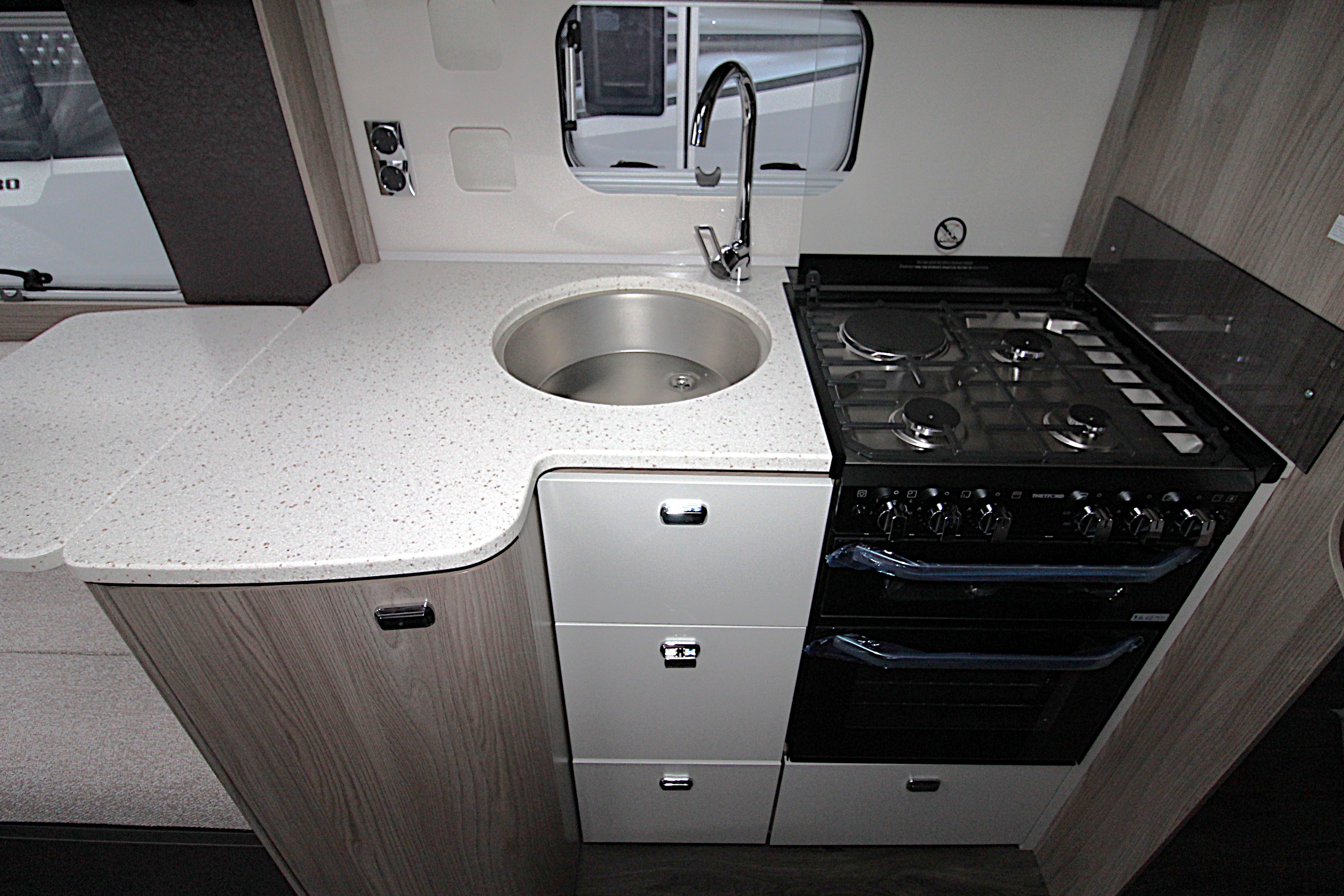 Thetford oven/grill with three burner gas hob and one electric hotplate. Hob features cast iron frets and a glass lid with auto gas shut-off functionality.