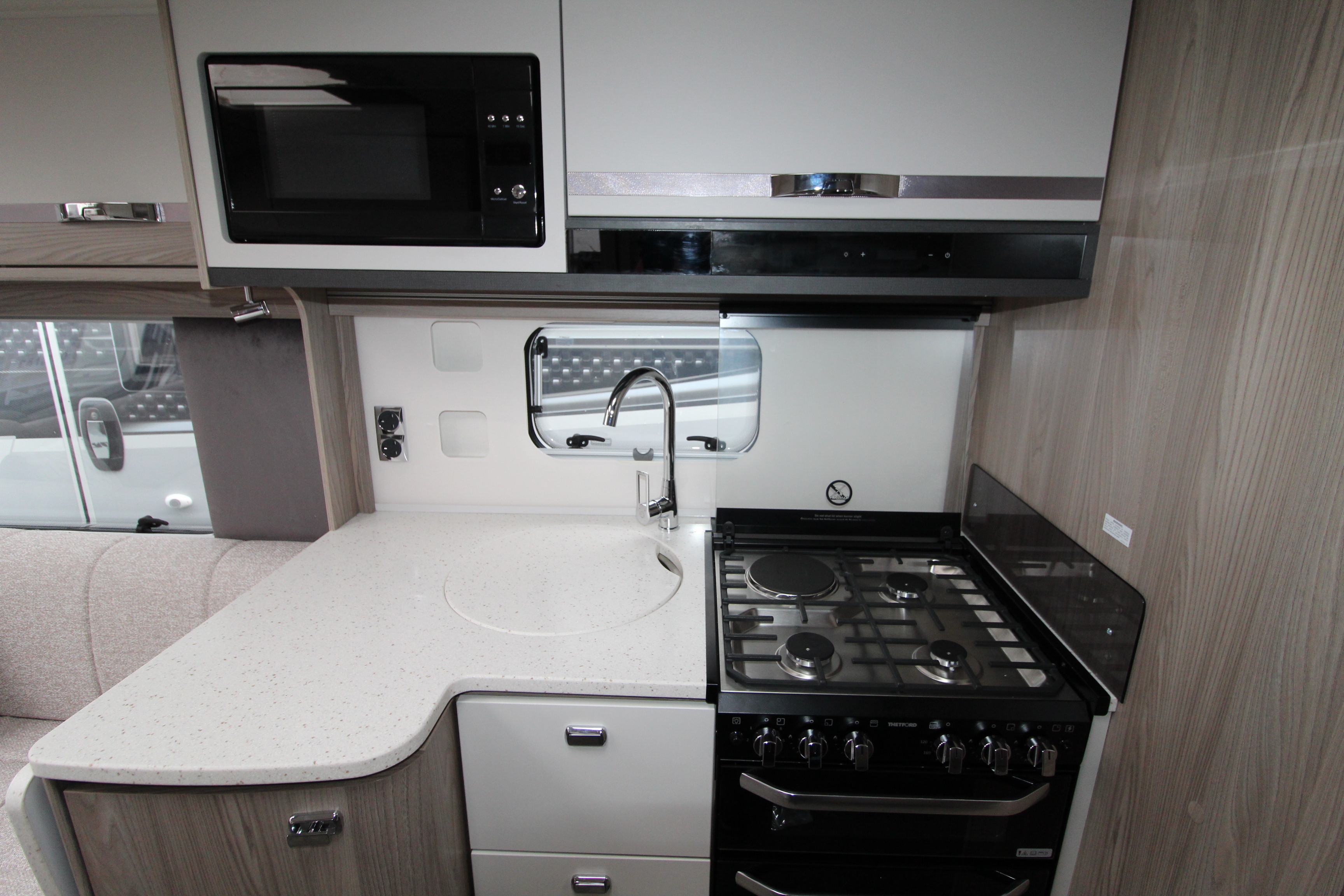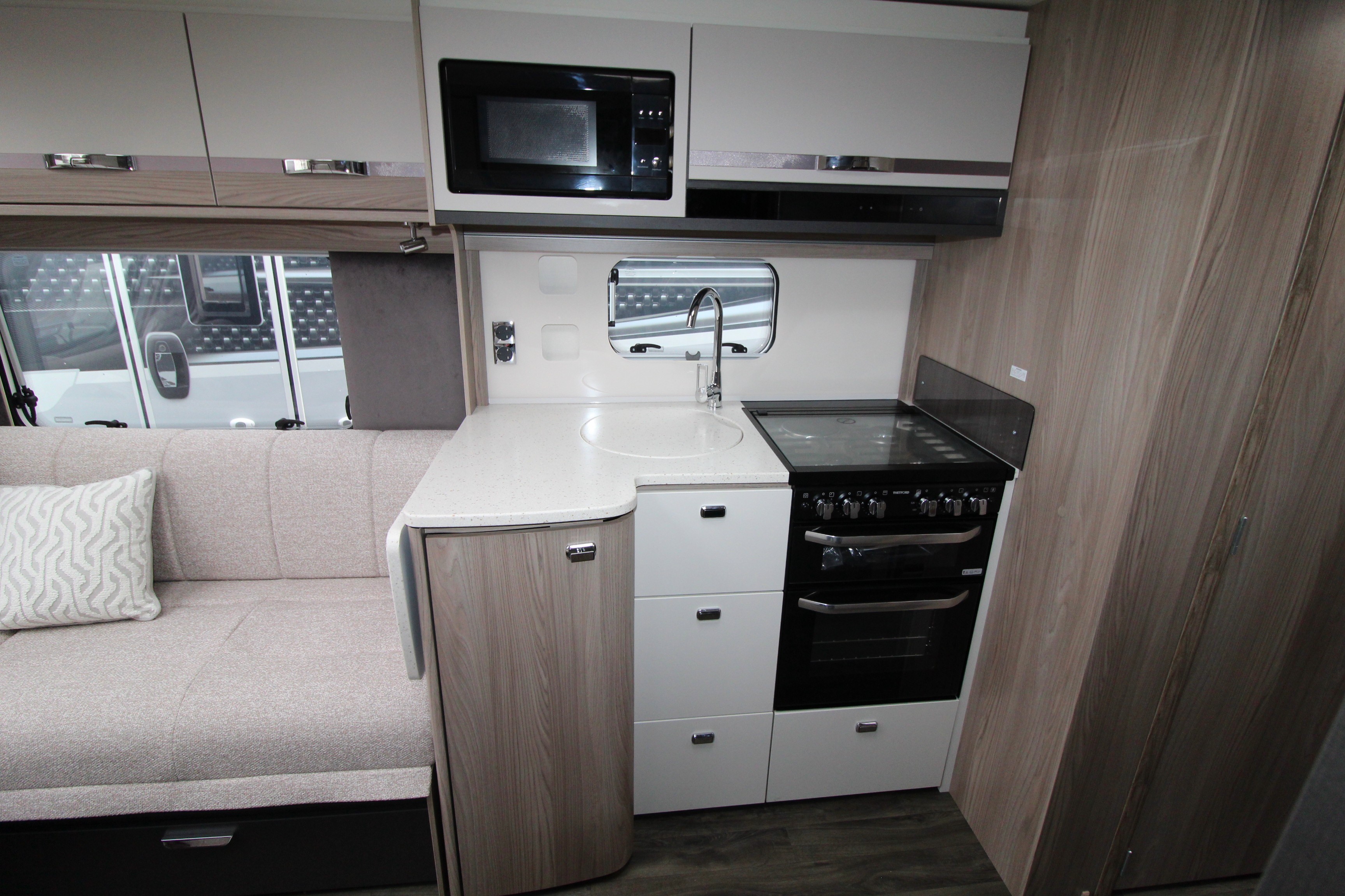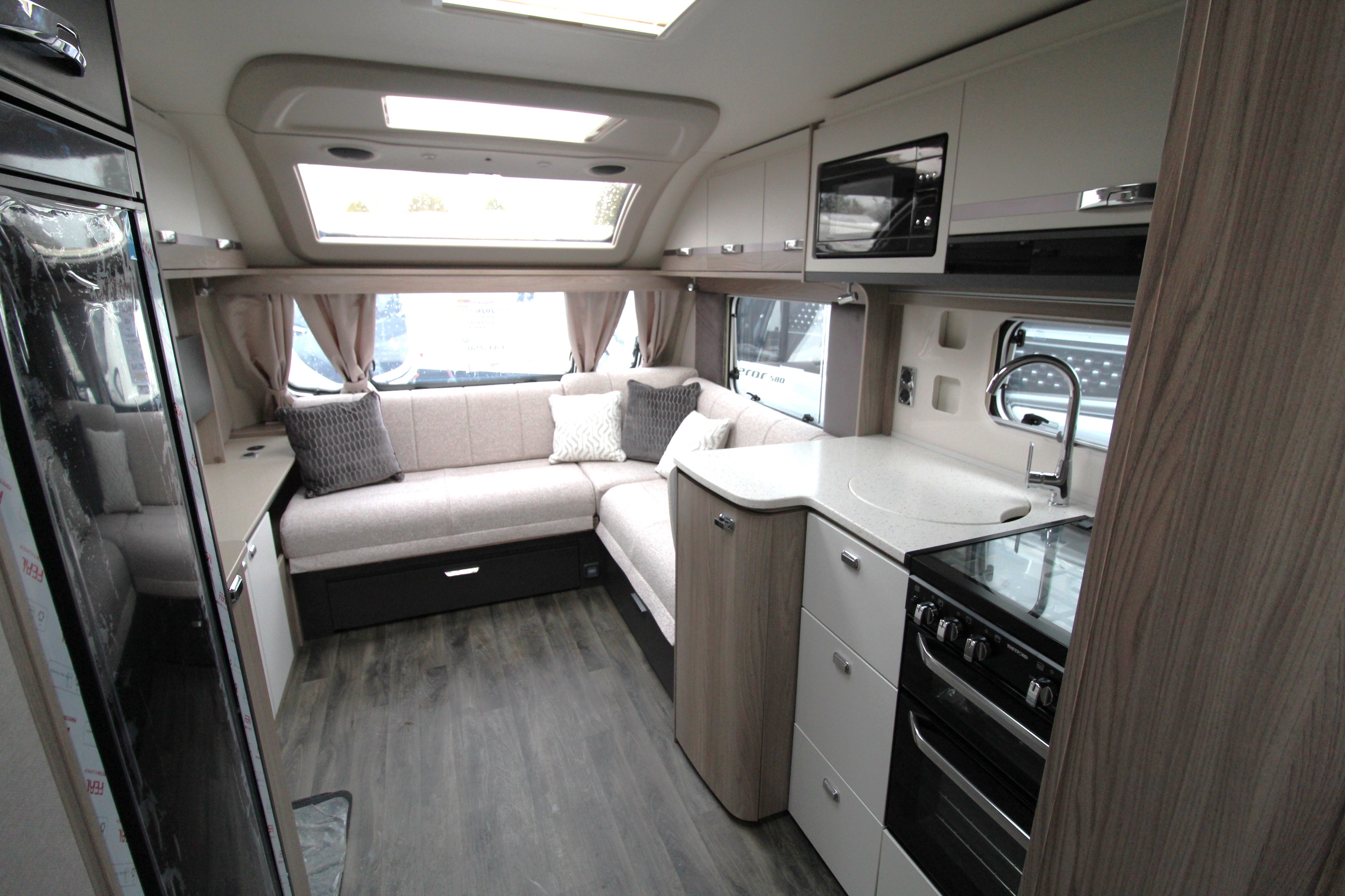 The Swift Conqueror 650L Grande is an 8ft wide, twin axle, four berth caravan presenting an L-shape lounge area, centre washroom and transverse island bed to the rear. This 7.98m length caravan is ideal for the touring family who like the privacy divide the centre washroom offers.