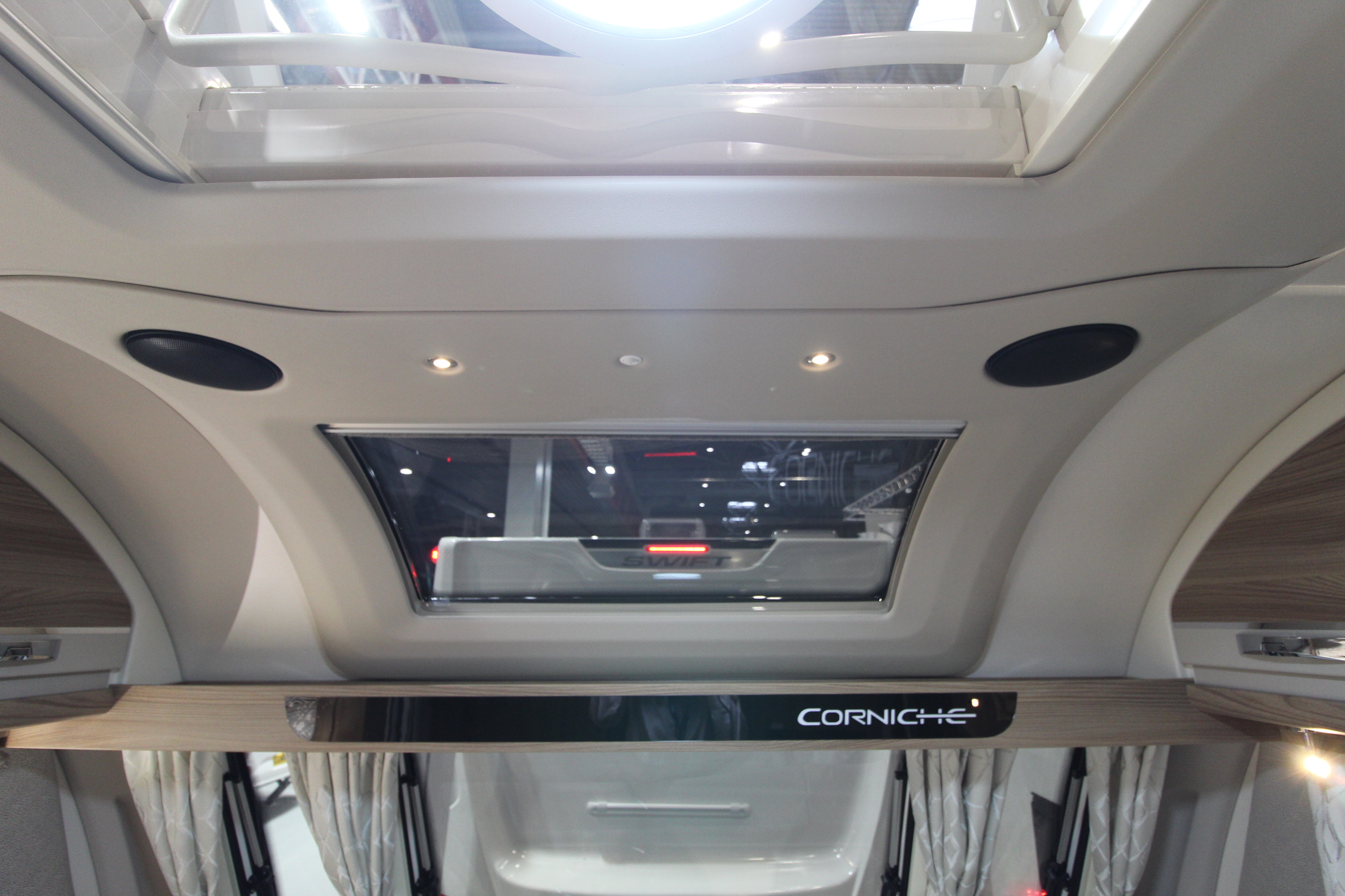 The Corniche 19/8 is a four-berth 8’ wide model that benefits from a fixed bed to the rear and a centre washroom, with a spacious front lounge, all of which gives the impression of having three separate rooms. The front lounge can easily accommodate a family of four can be used as additional sleeping space either by converting the double bench seats into a double bed or using them as single beds. There is a well equipped central kitchen which includes a great deal of worktop and storage space plus plenty of modern features and fittings. The Corniche 19/8's washroom has a seperate shower cubicle, a centre vanity sink with illuminated mirror and a cassette toilet.