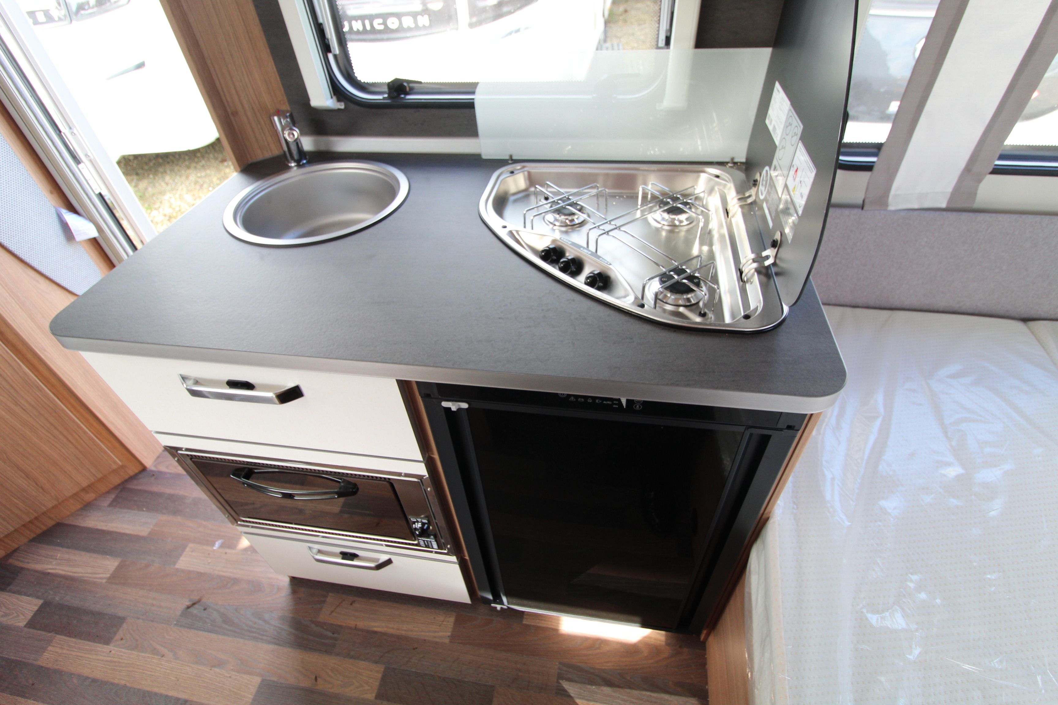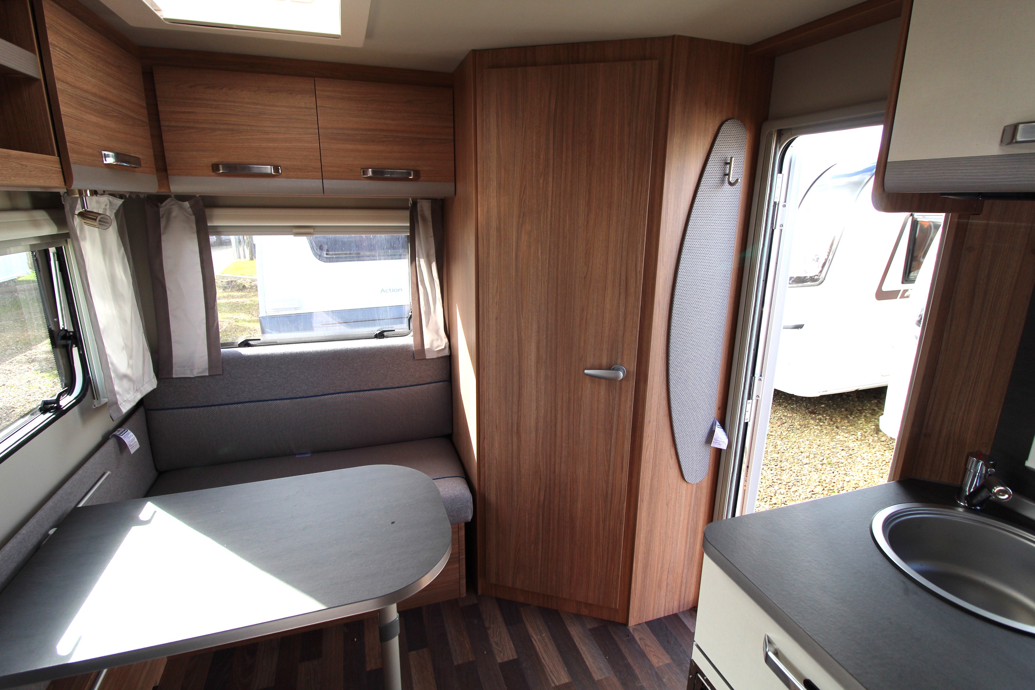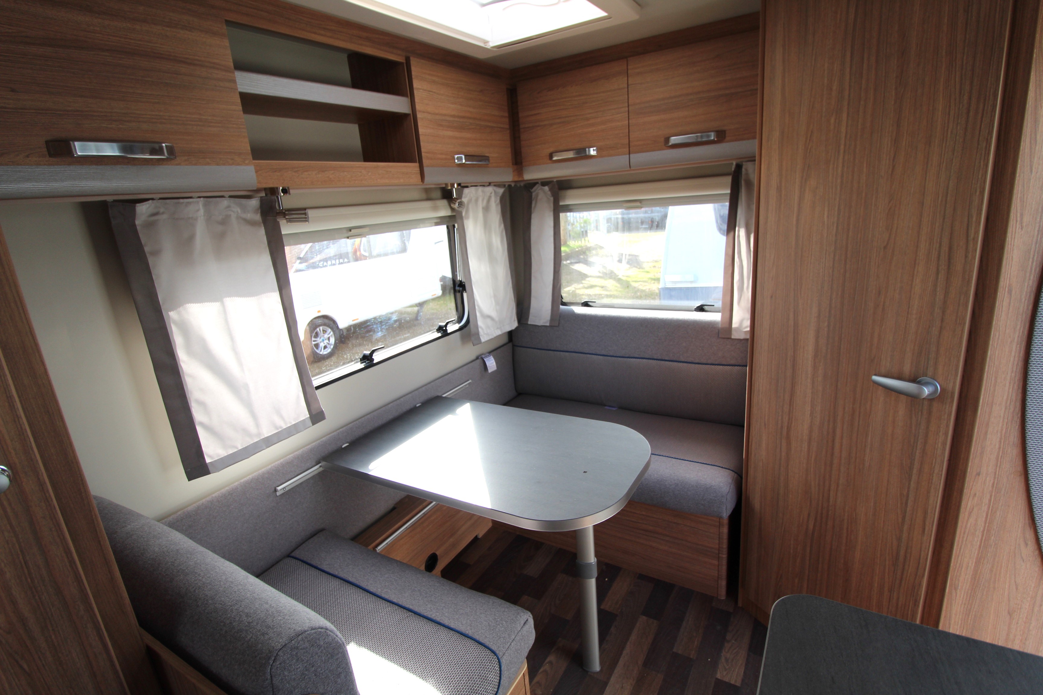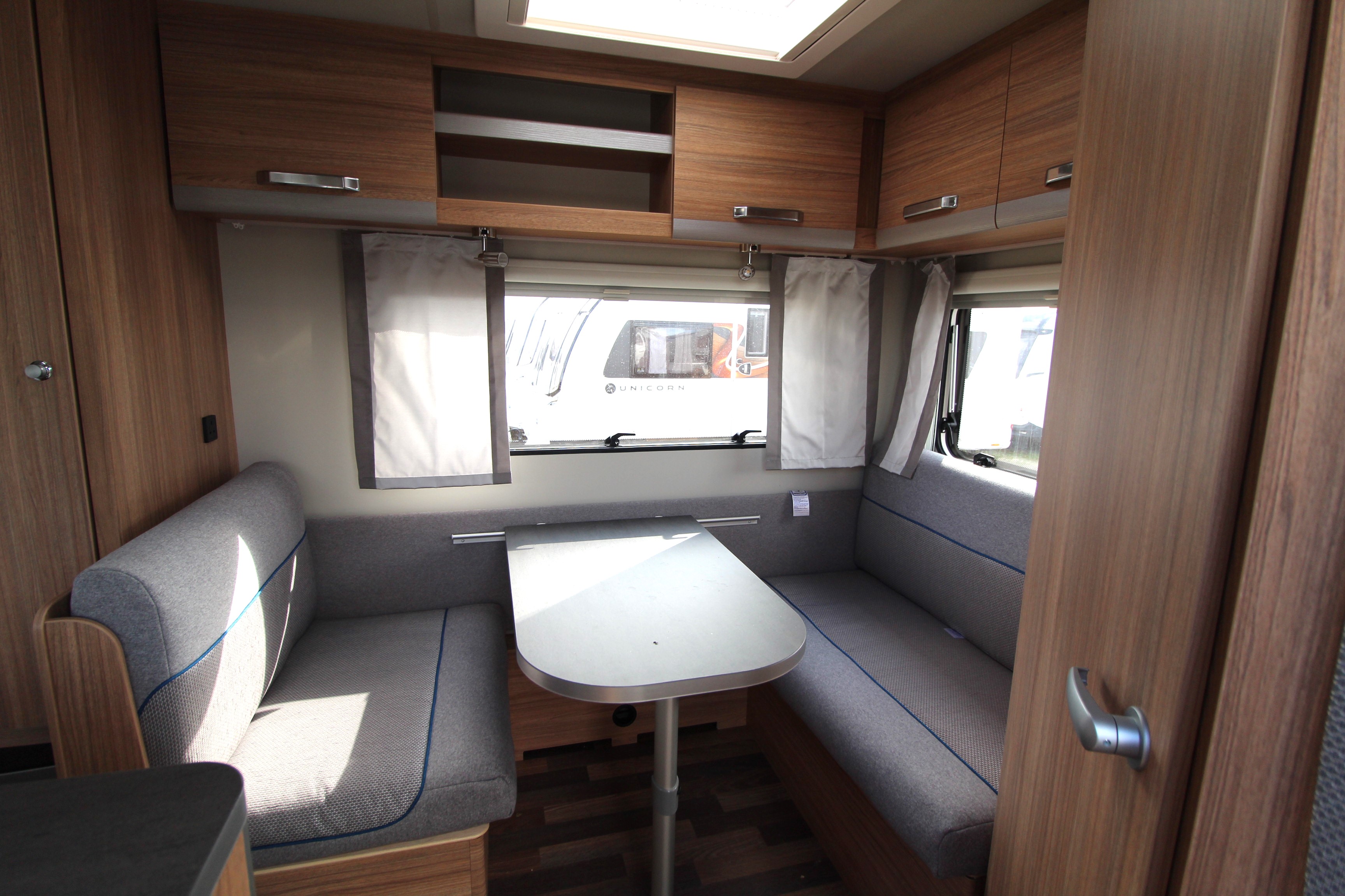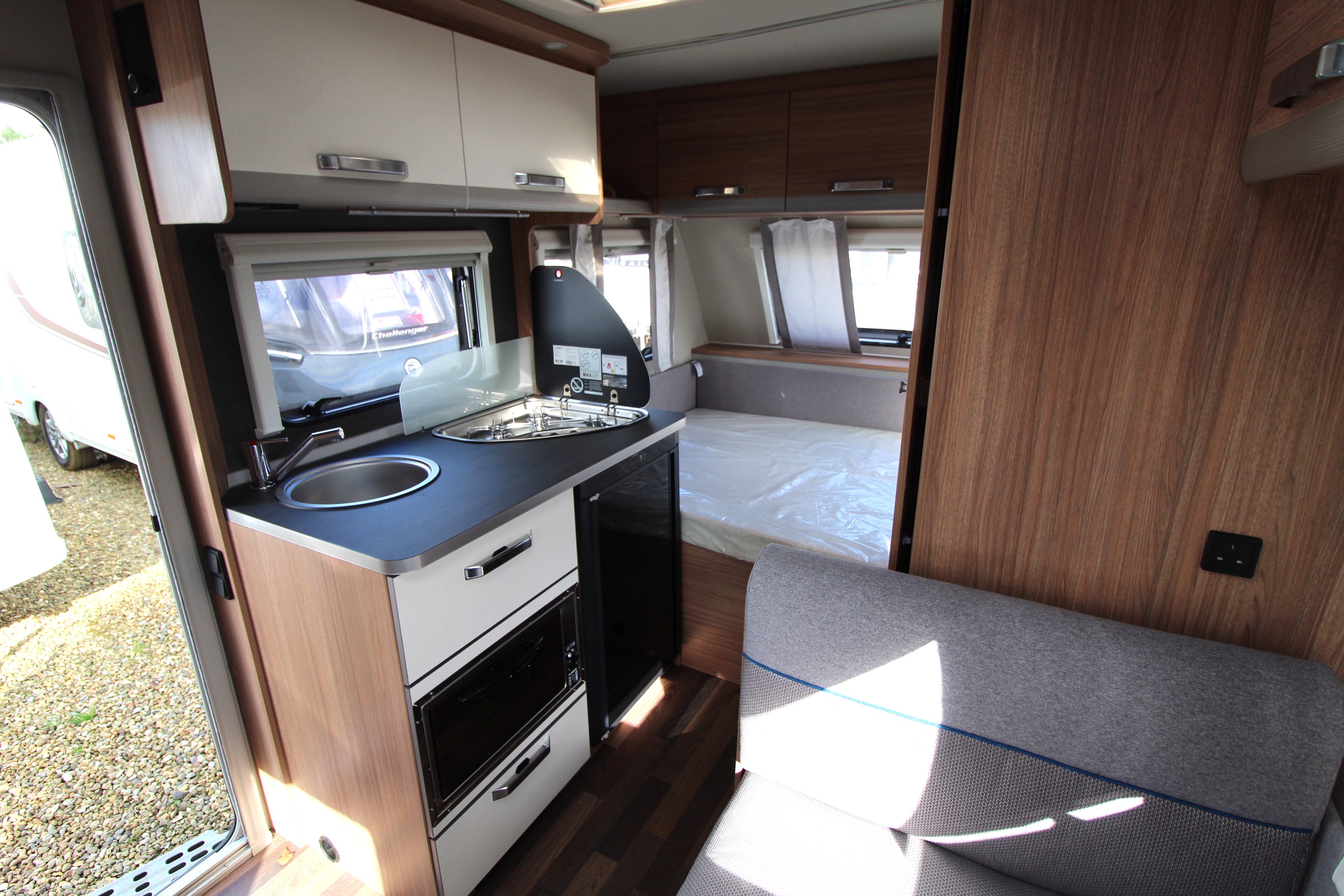 Offering twin bench parallel seating around a dining table, kitchen with 3 burner gas hob, combi oven/grill and undercounter fridge, rear transverse double bed and combined washroom with washbasin, cassette toilet and shower hose facility.
