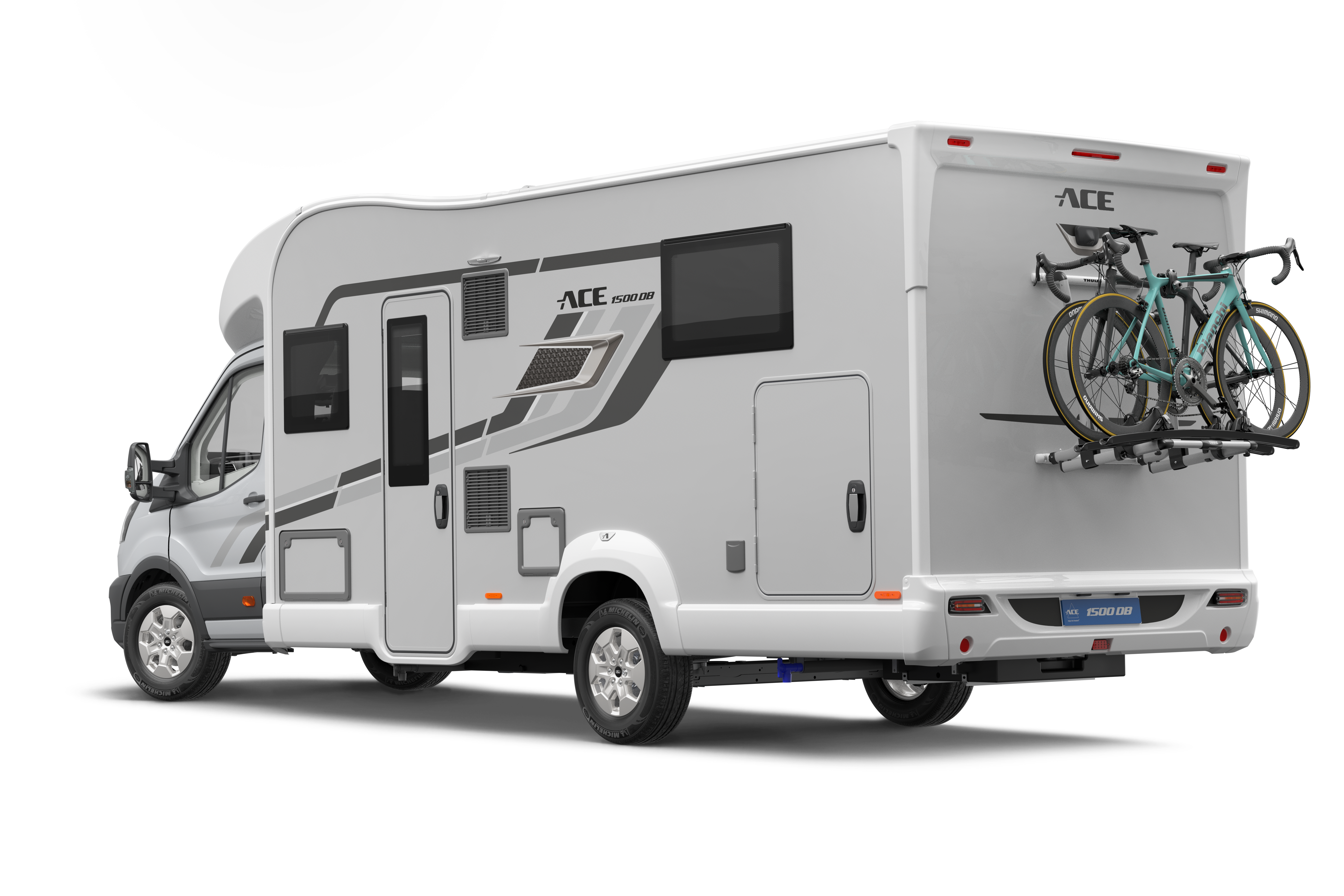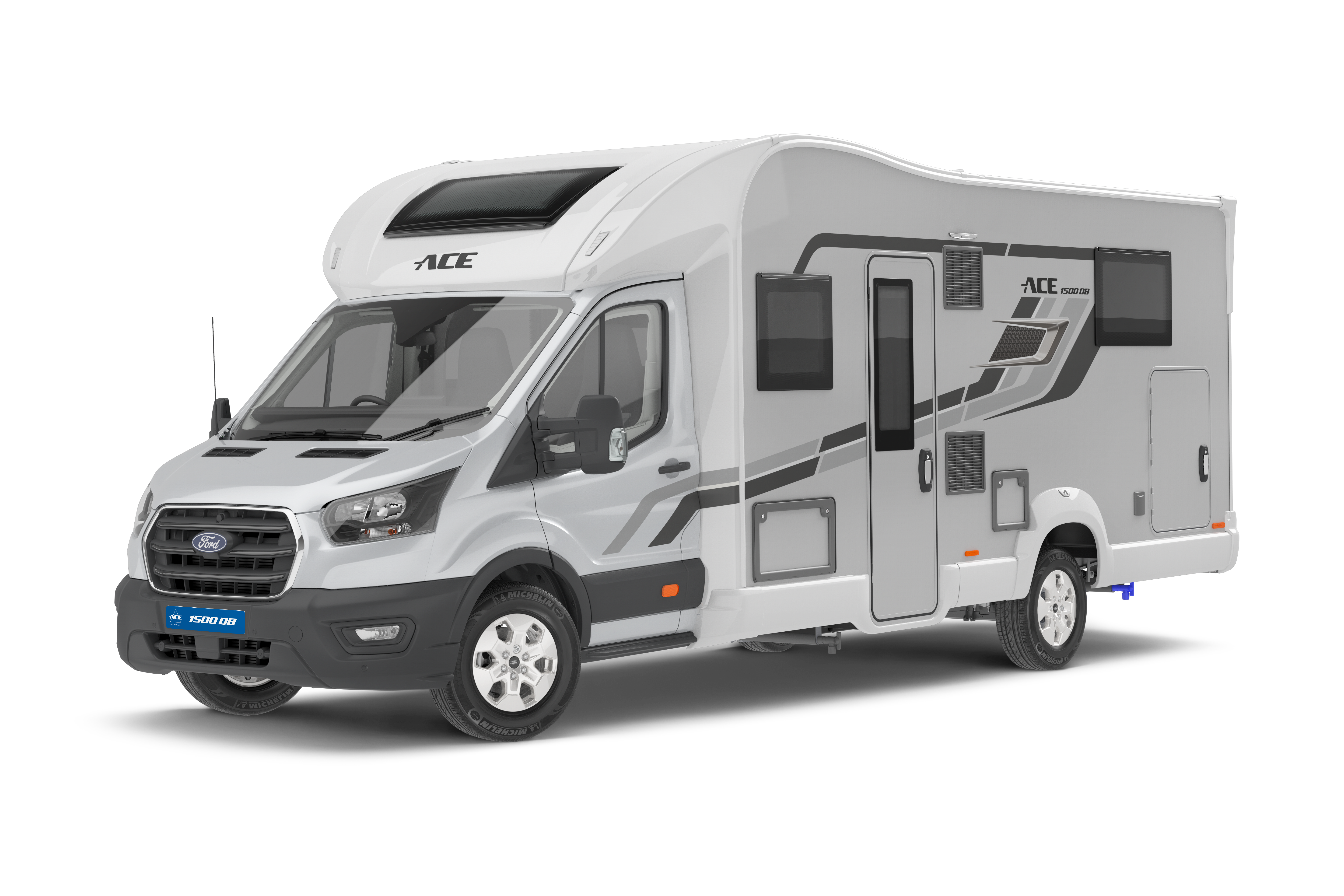 The ACE 1500 DB is a 7.85m, fully loaded four-berth coach built motorhome presenting a spacious layout with centre washroom and island bed to the rear.