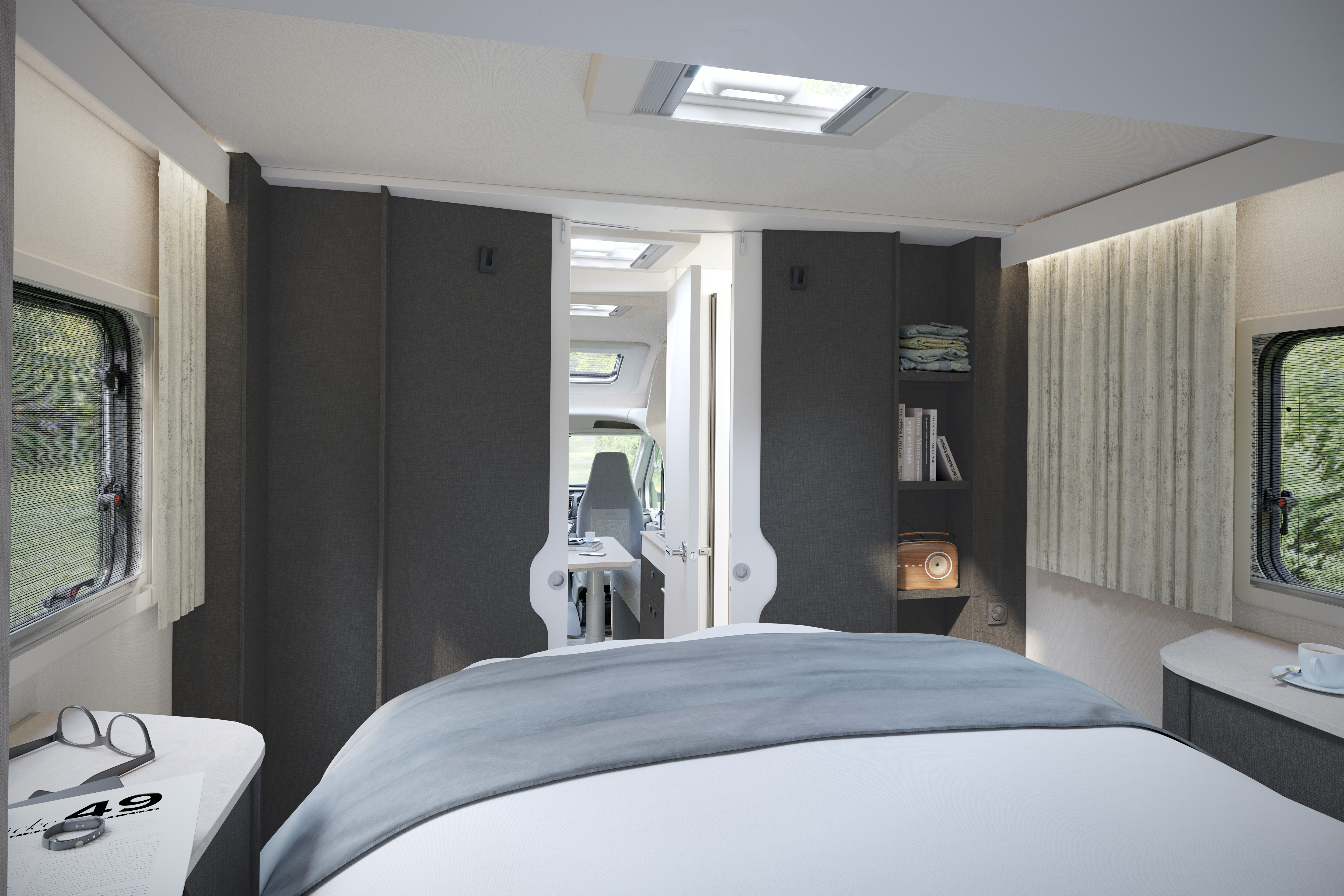 - Exterior access locker door into front bed box (2-berth only)
