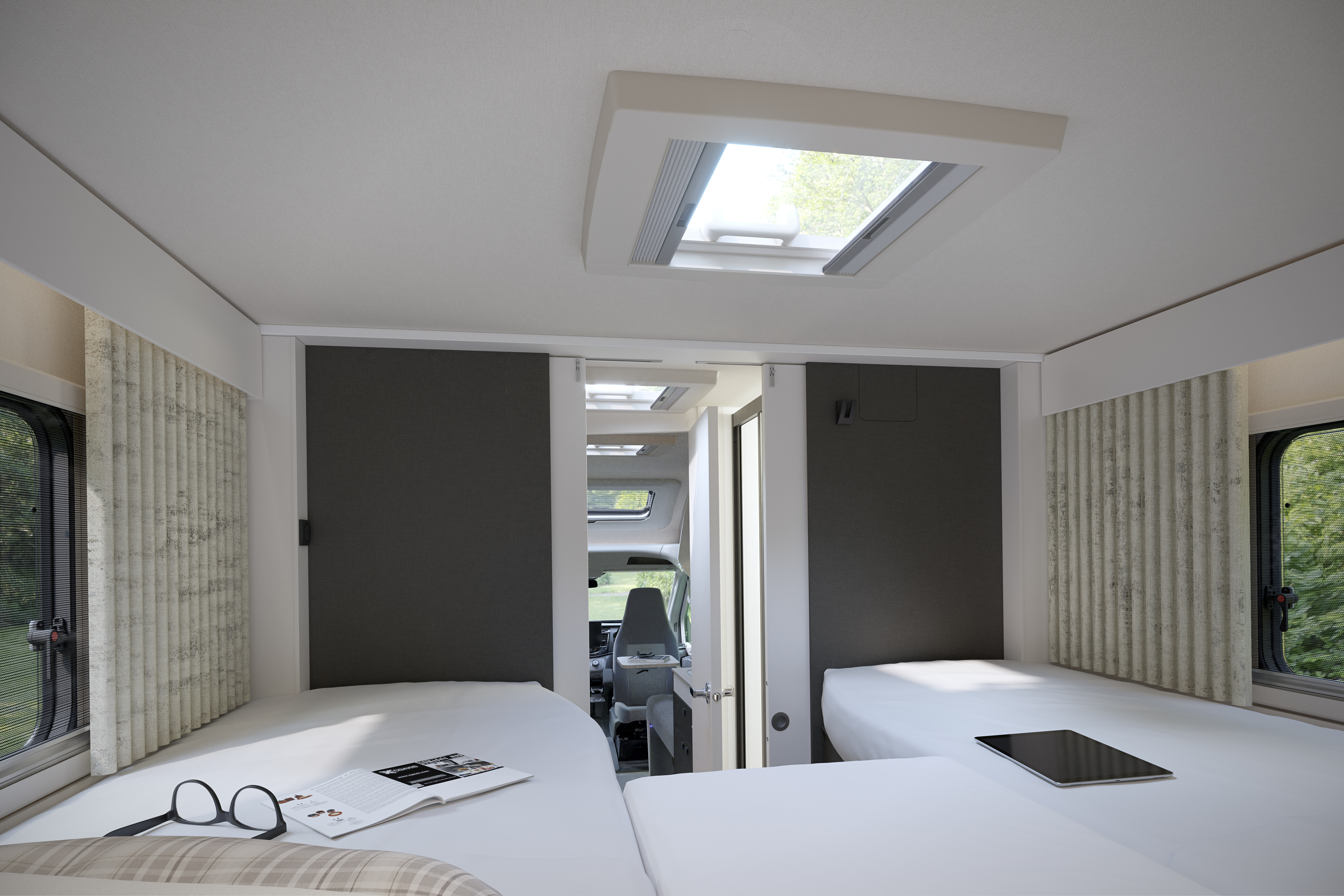 - Exterior access locker door into front bed box (2-berth only)
