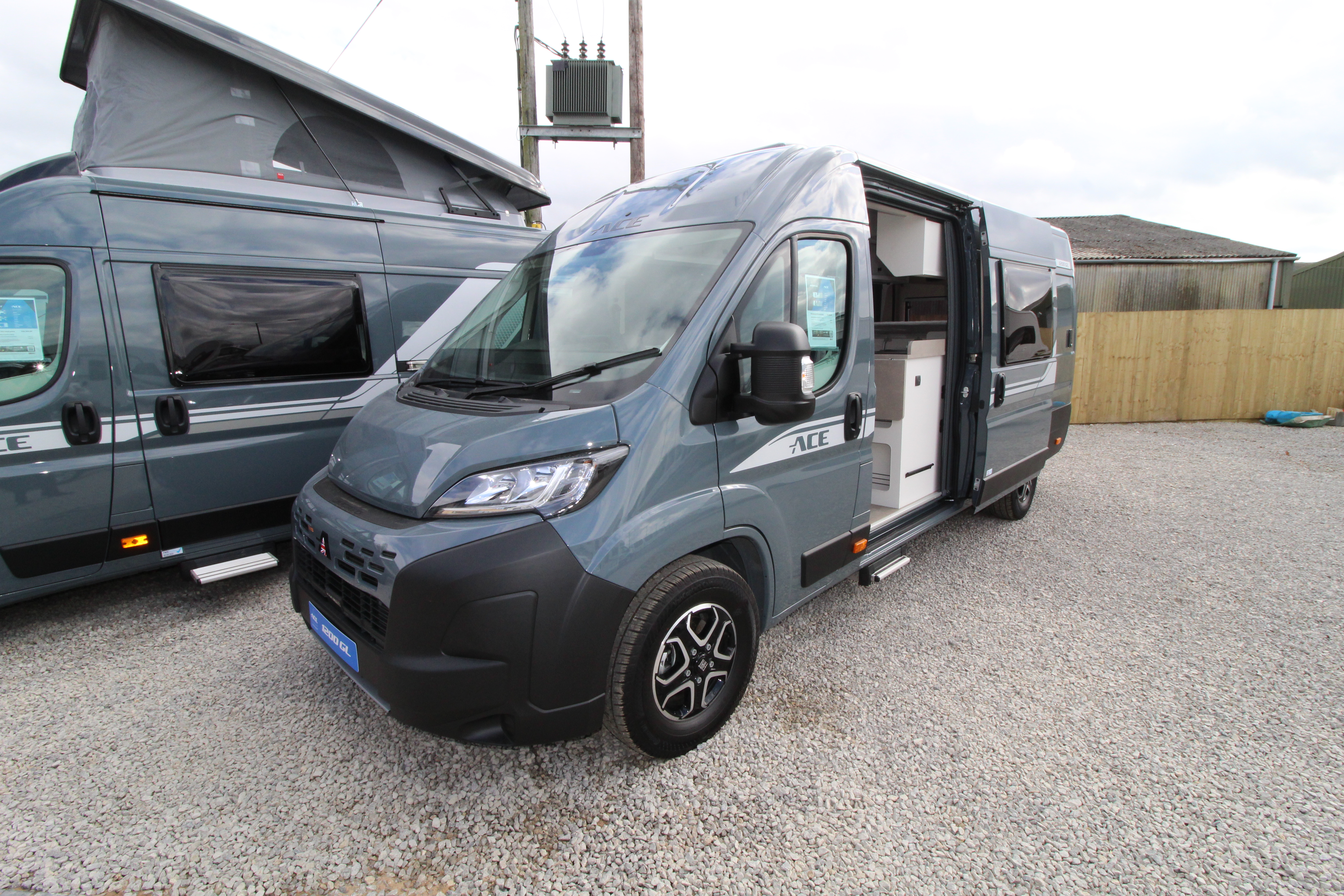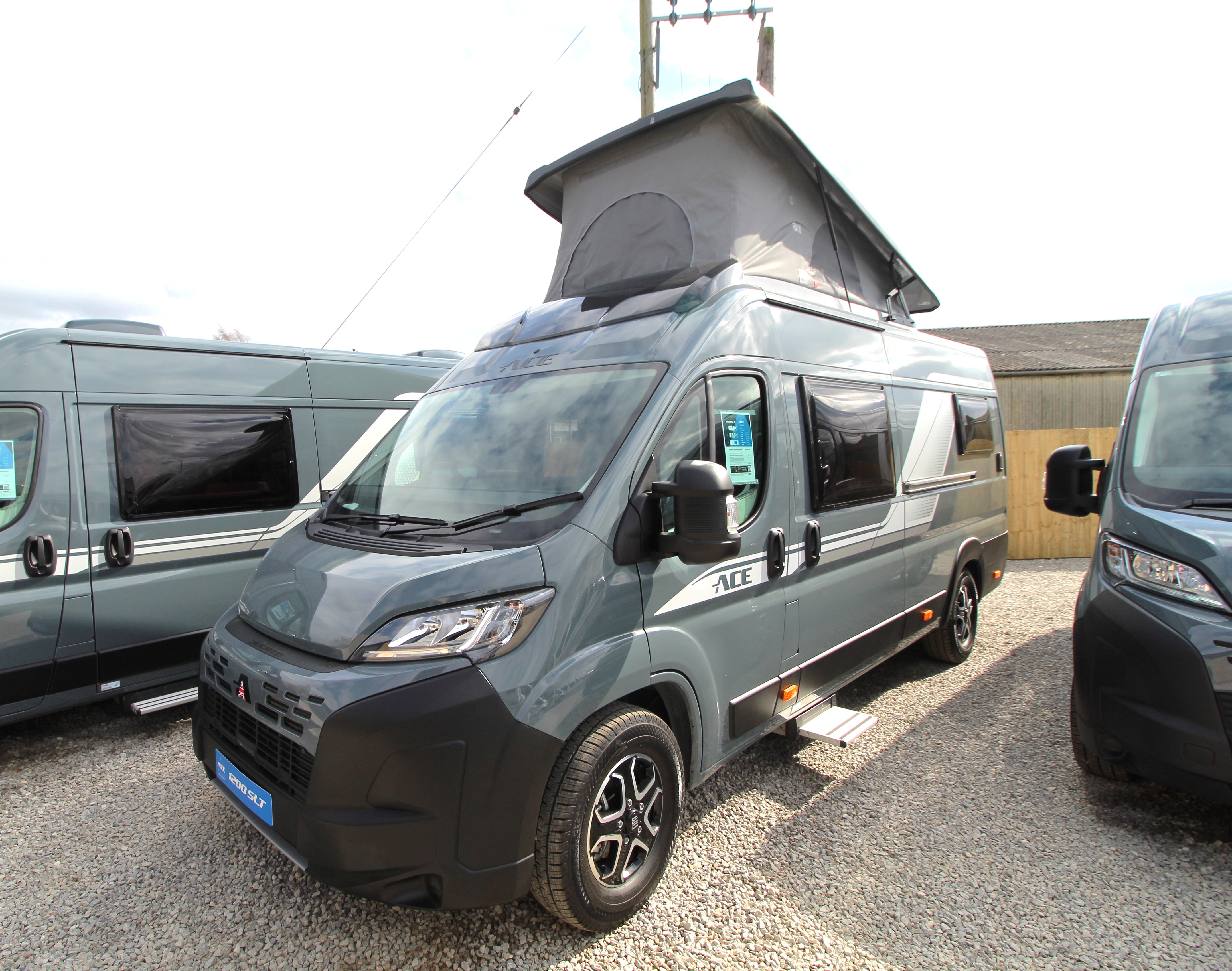 The ACE 1200 GLT is a 6.36m, fully loaded four-berth campervan complete with ‘pop-top’ roof and a transverse double bed over the large garage.