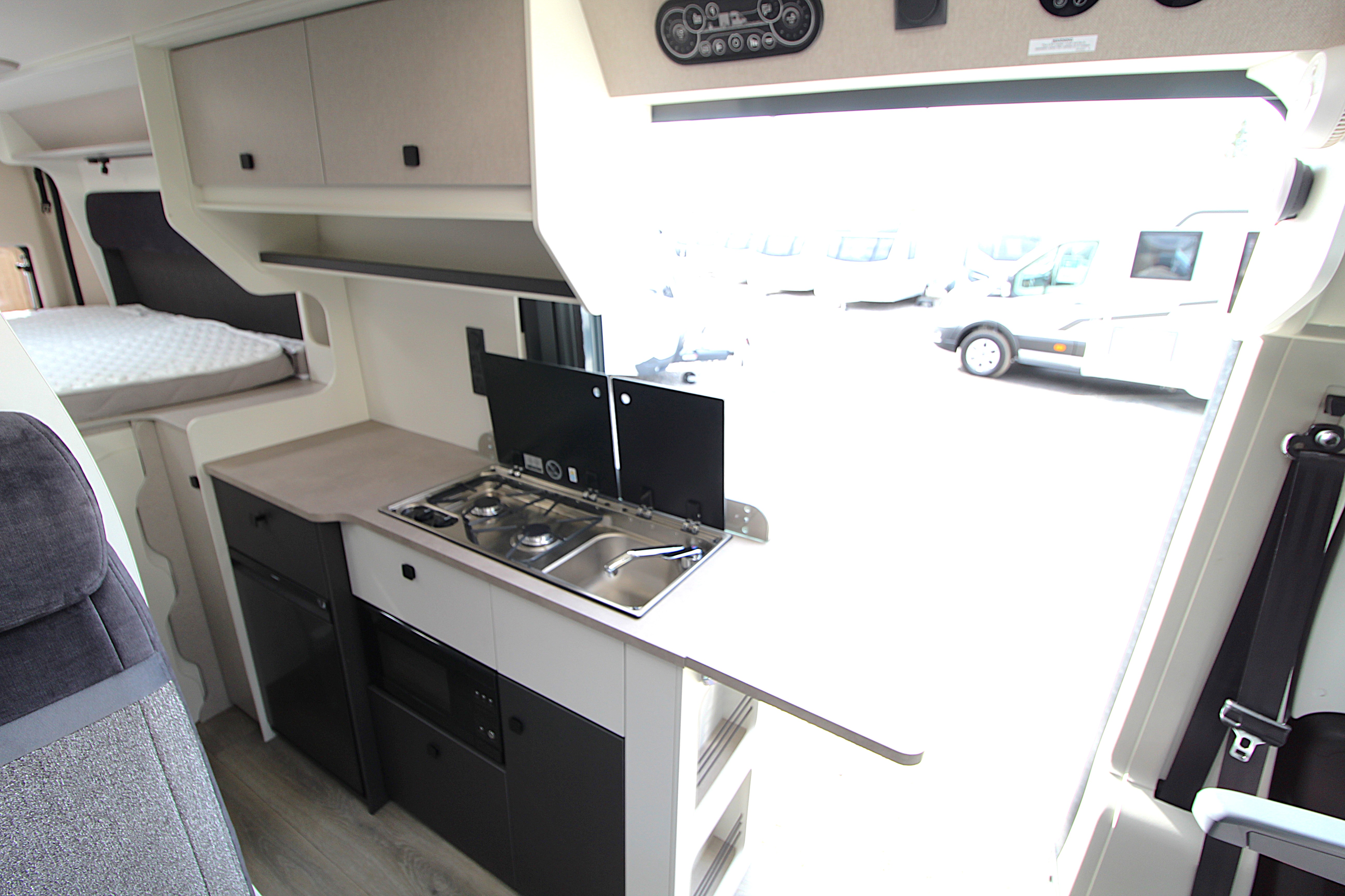- Combination Dometic two-burner stainless steel hob and sink with glass lids