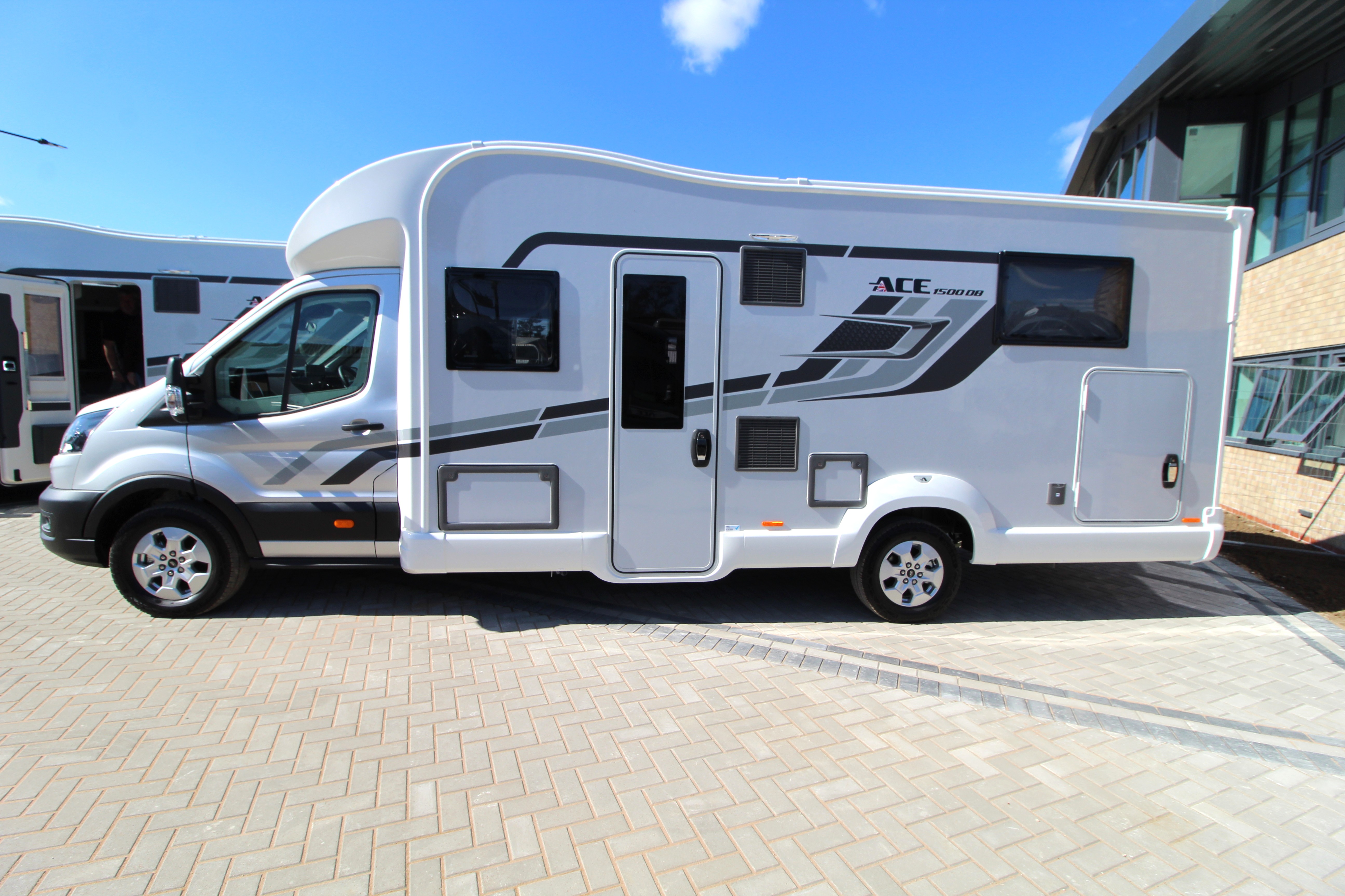 The ACE 1500 DB is a 7.85m, fully loaded four-berth coach built motorhome presenting a spacious layout with centre washroom and island bed to the rear.