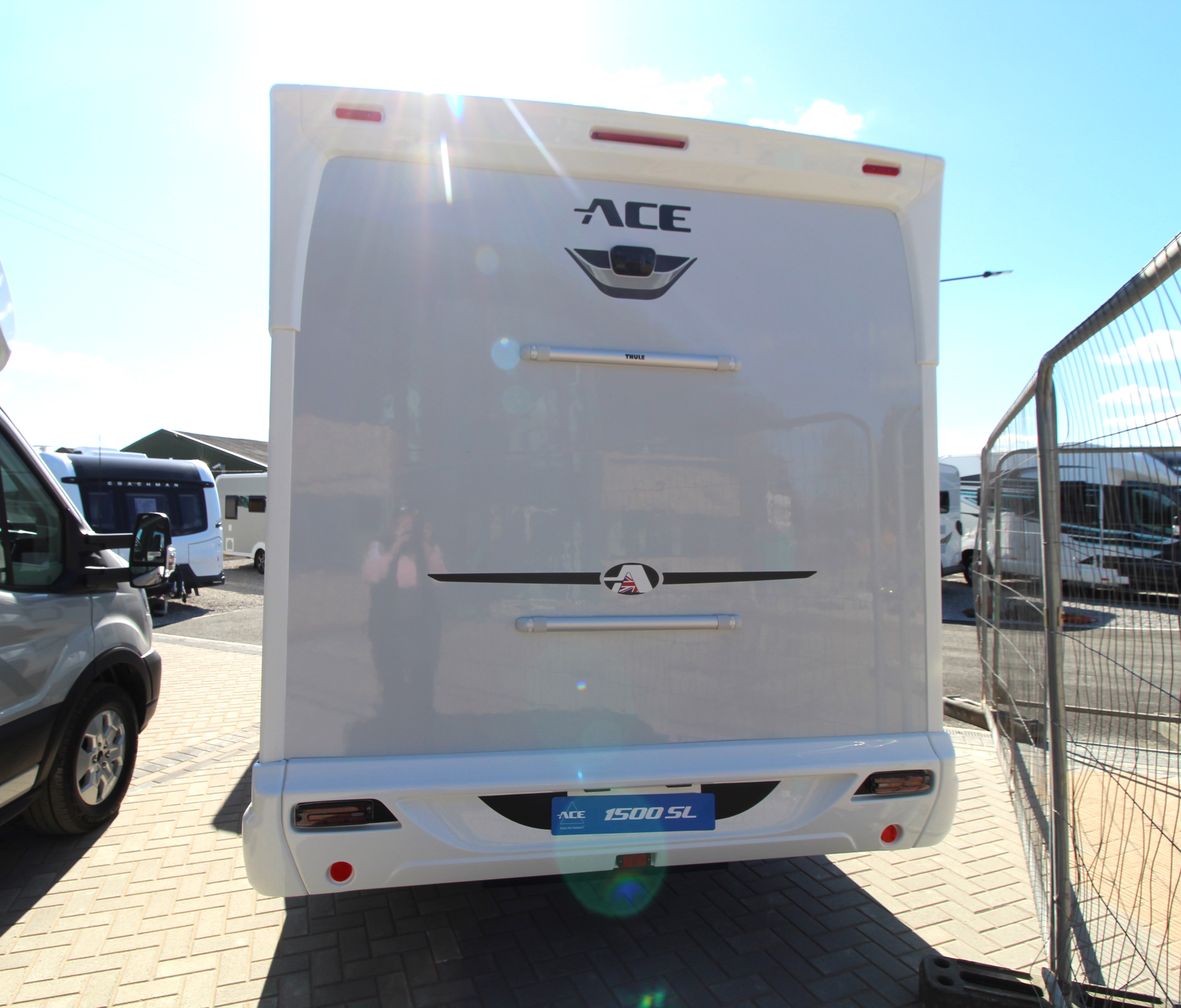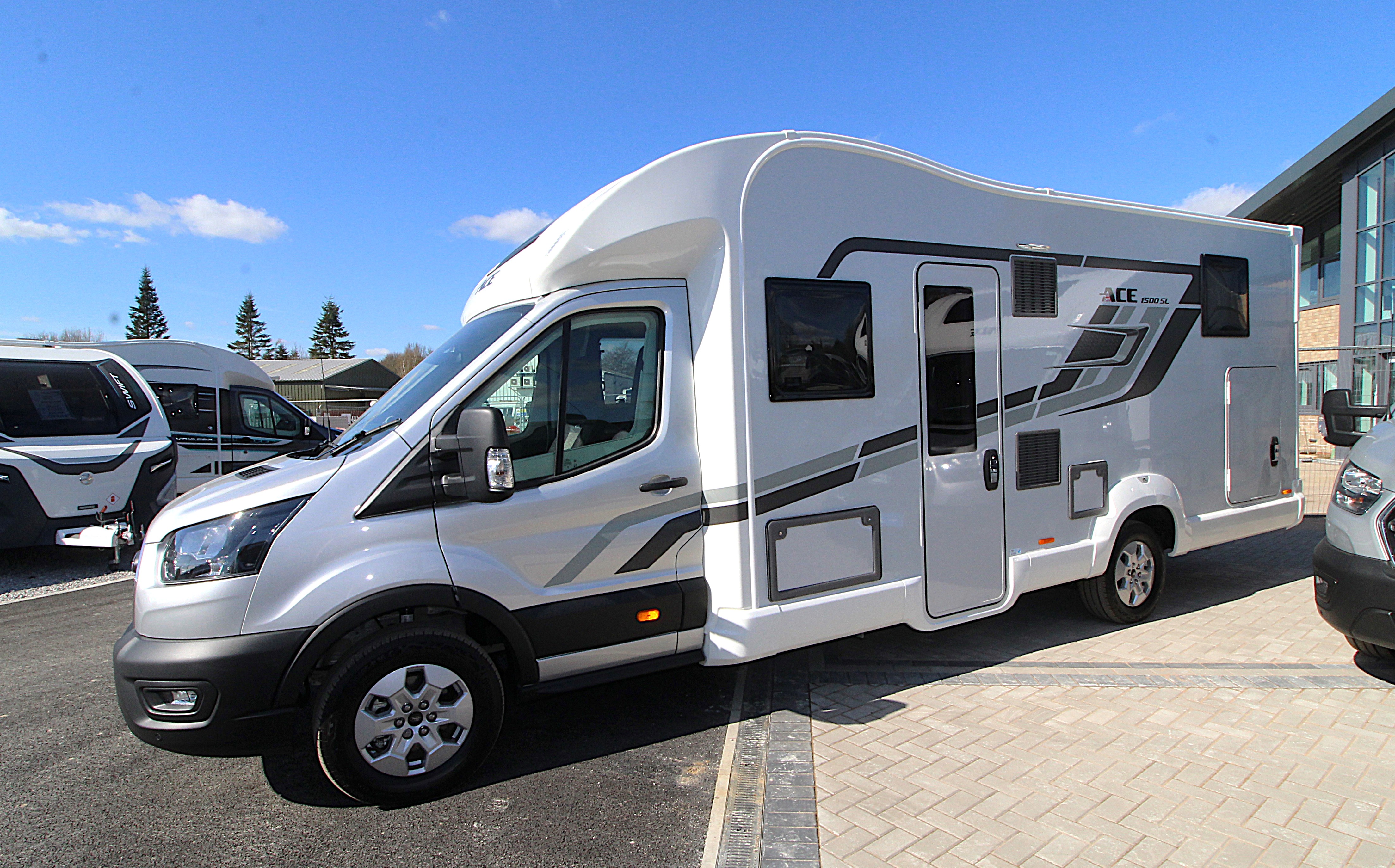 The ACE 1500 SL is a 7.85m, fully loaded four-berth coach built motorhome presenting a spacious layout with centre washroom and fixed single beds to the rear.