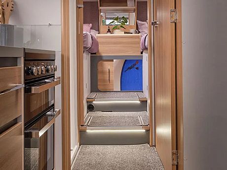 The Bailey Adamo 75-4T motorhome hosts a generous front lounge with side facing sofas, which provides travelling seats for two people and can be converted into a double bed to sleep two. A well-equipped centre kitchen provides plenty of worktop and storage space, adjacent to which is a tall fridge/freezer.