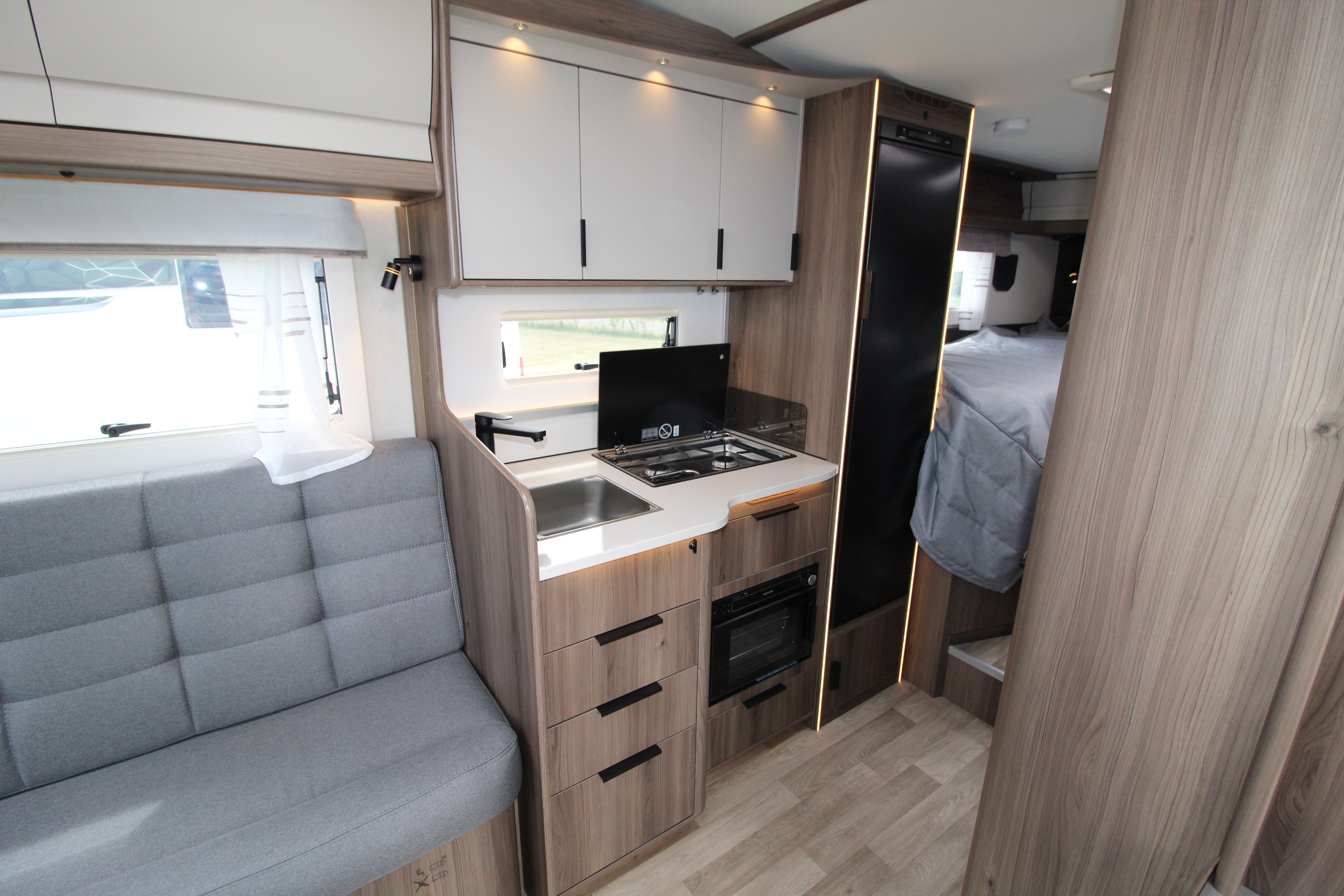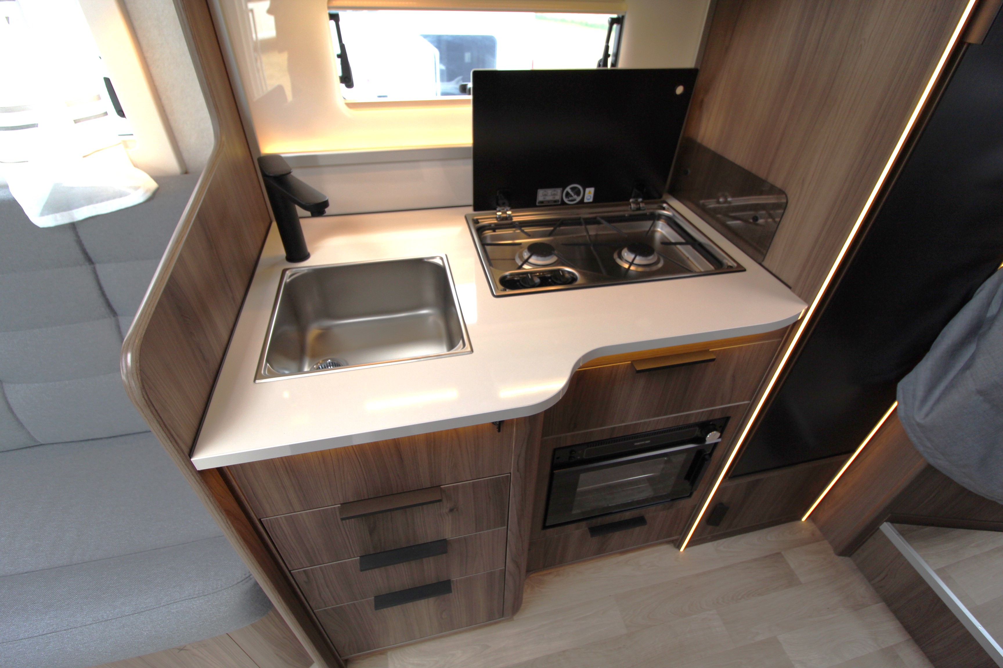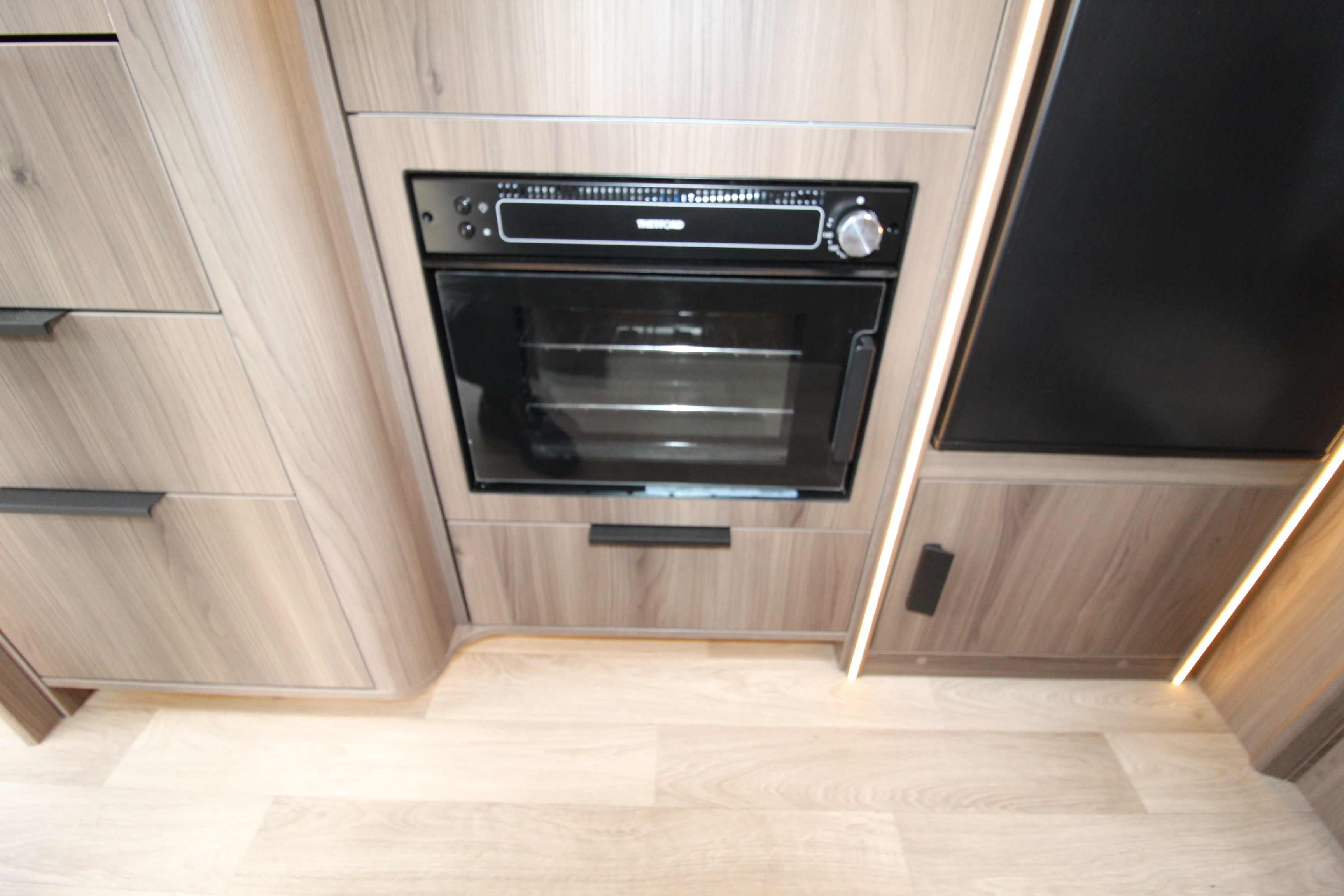 From the dual-fuel hob and Thetford oven to soft-close storage and ambient lighting, the Sportivo kitchen blends premium finishes with everyday convenience.
