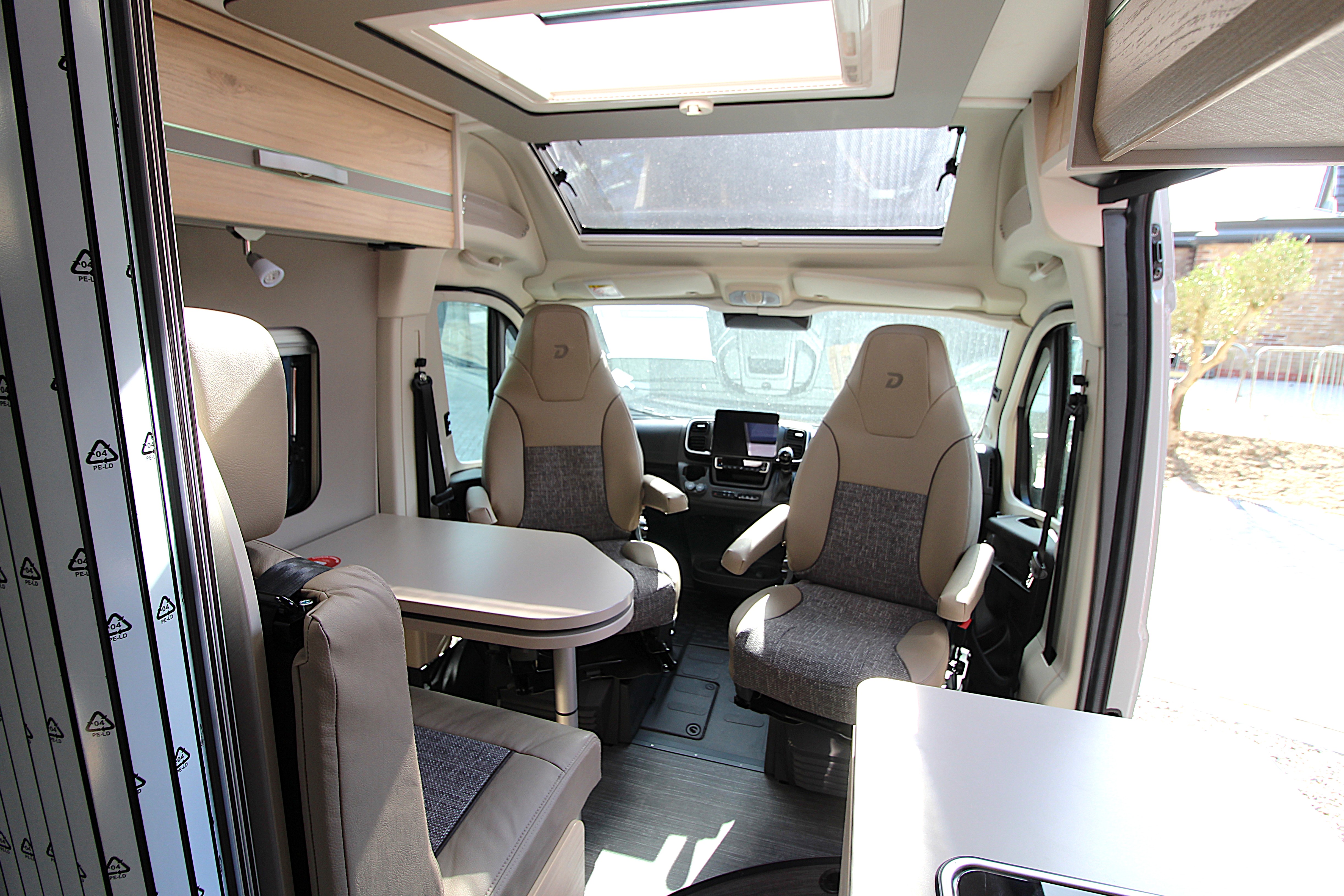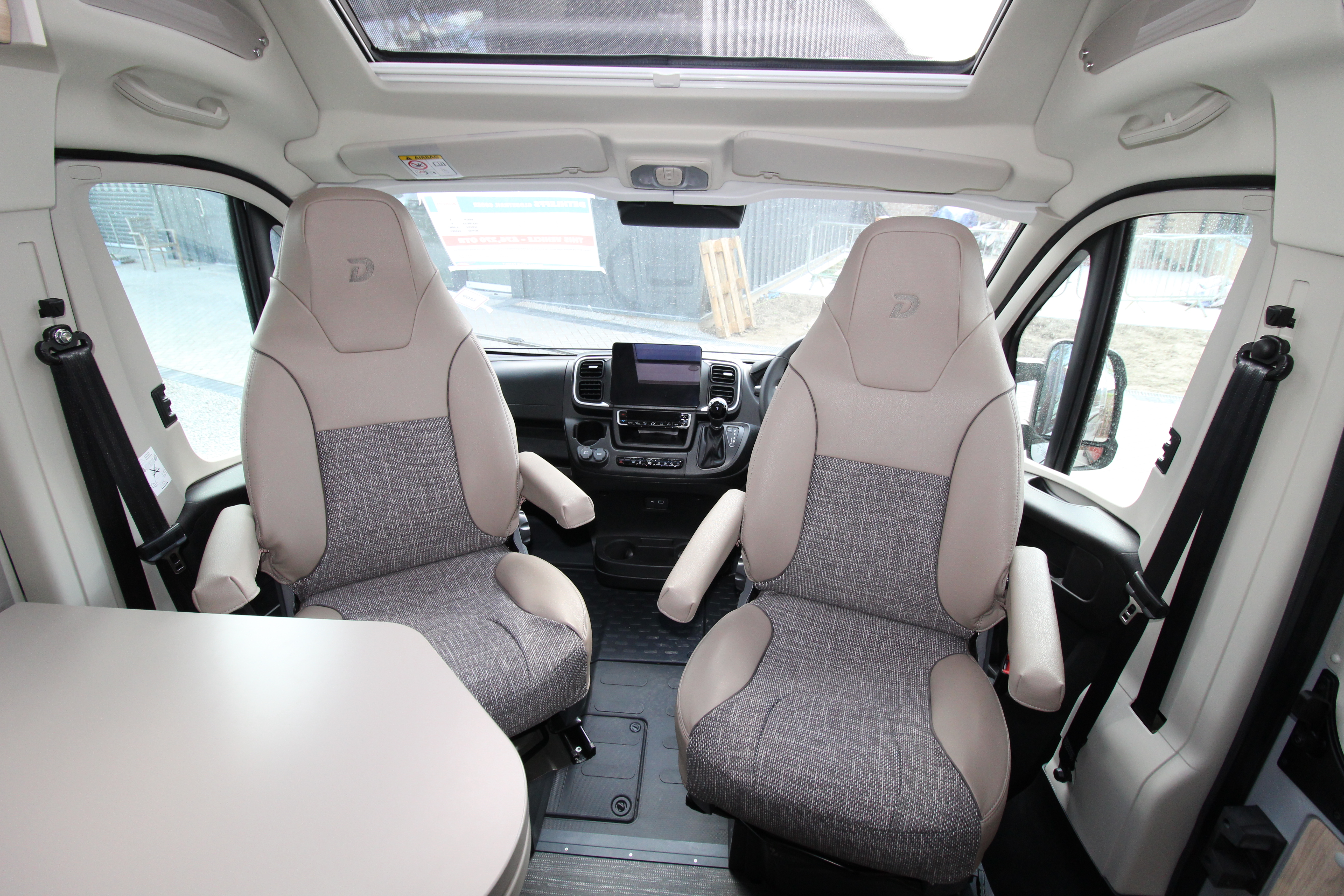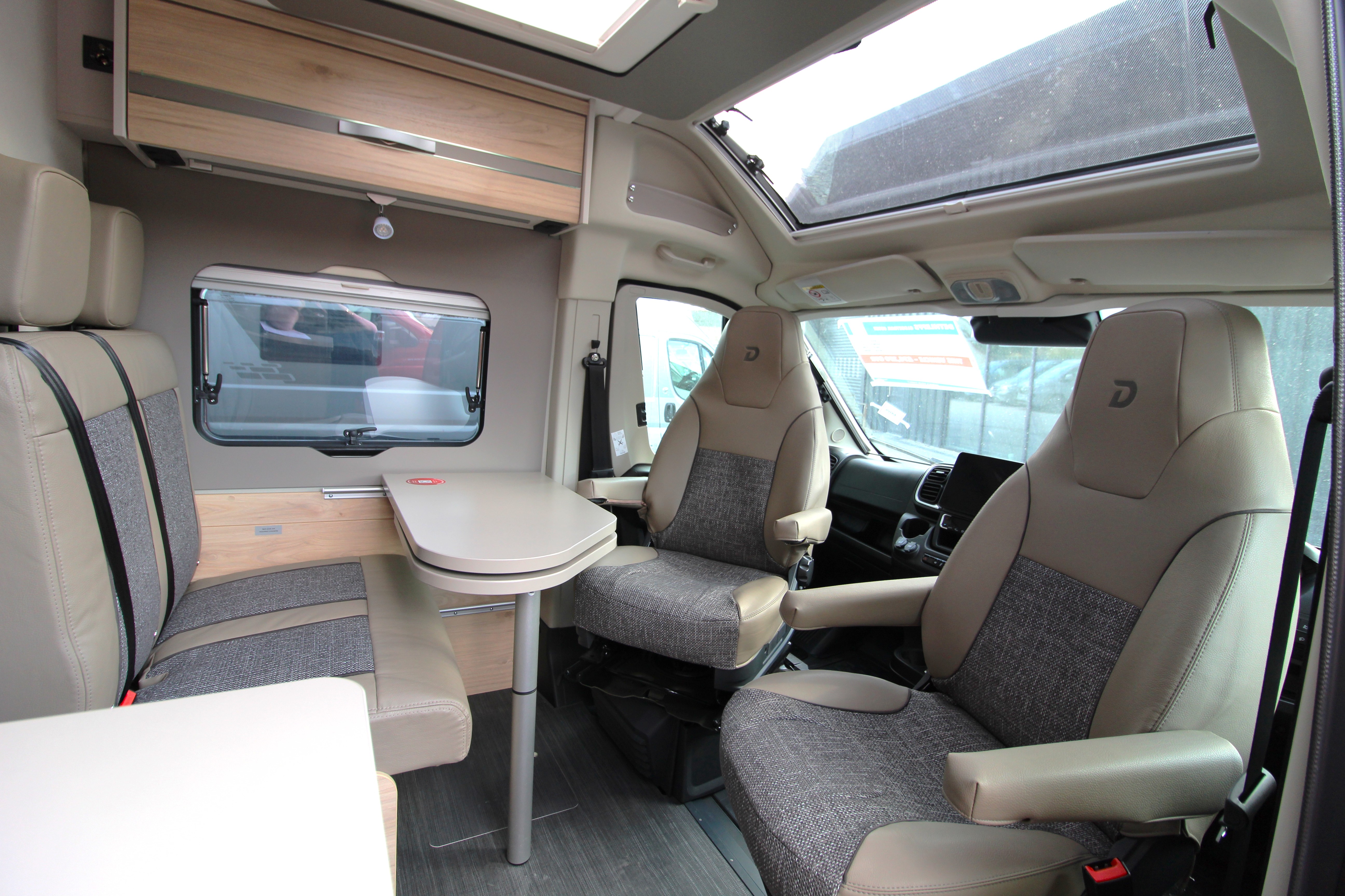 Presenting a comfortable lounge area with swivel cab seats and an extendable dining table, four people can sit in comfort and while away the hours.