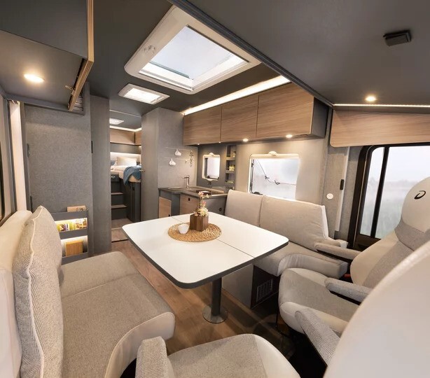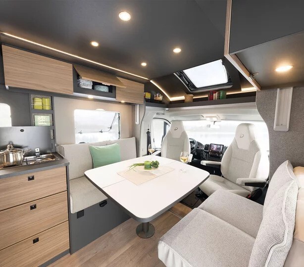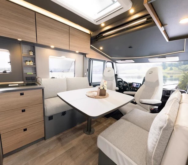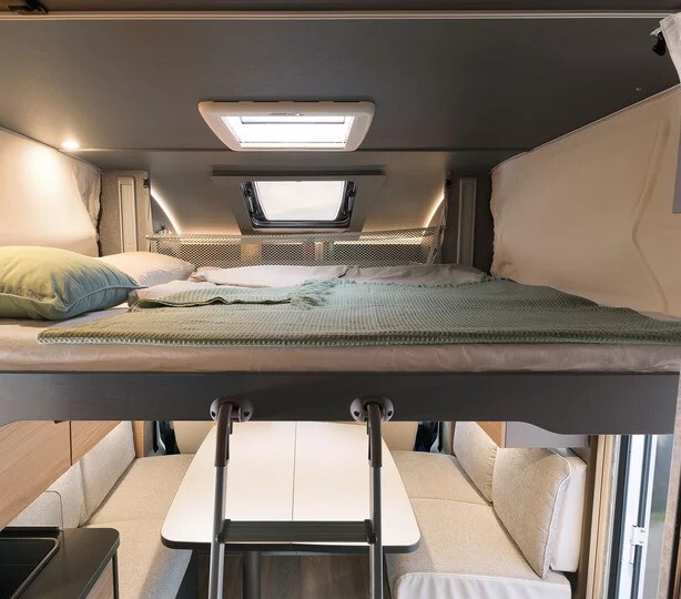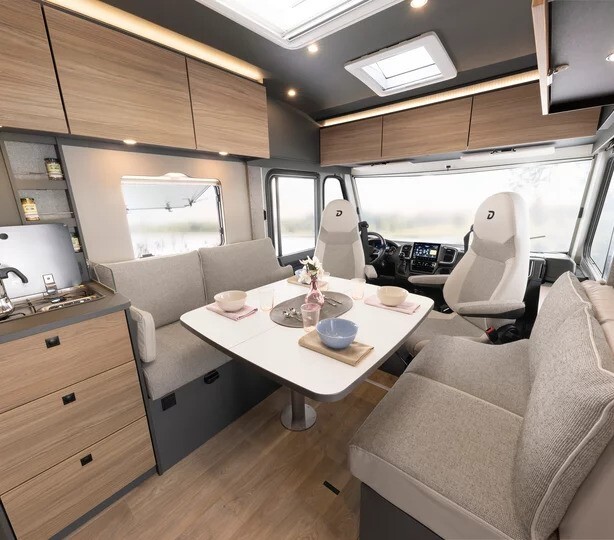 The front lounge offers a bright, open feel thanks to Dethleffs’ cab skylight window, fitted as standard on Trend low-profile models. The seating area is designed for comfort and relaxation, with space for dining or entertaining, and an optional drop-down bed available to increase sleeping capacity when required (enquire for pricing and options)