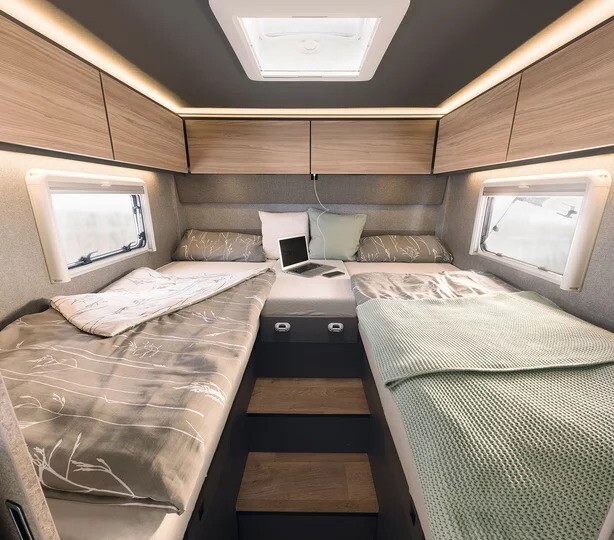 At the rear, the T 7057 EBL features comfortable fixed single beds, each over 2 metres in length, complete with high-quality cold-foam mattresses and slatted bed bases for excellent support and ventilation. Overhead lockers and a full-height wardrobe beneath the beds provide impressive storage for extended touring.
