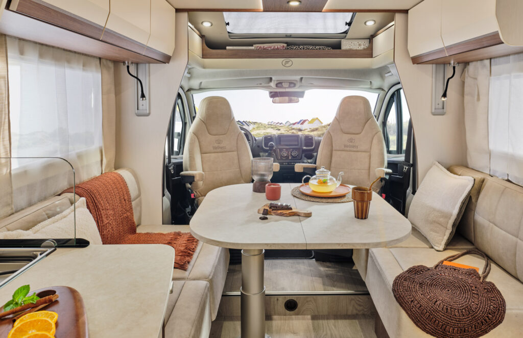 Presenting a unique cosy interior, large spaces, fittings, comfort, face-to-face bench seat, central bed, open L-shaped kitchen, toilet with dual partition, and large storage area.