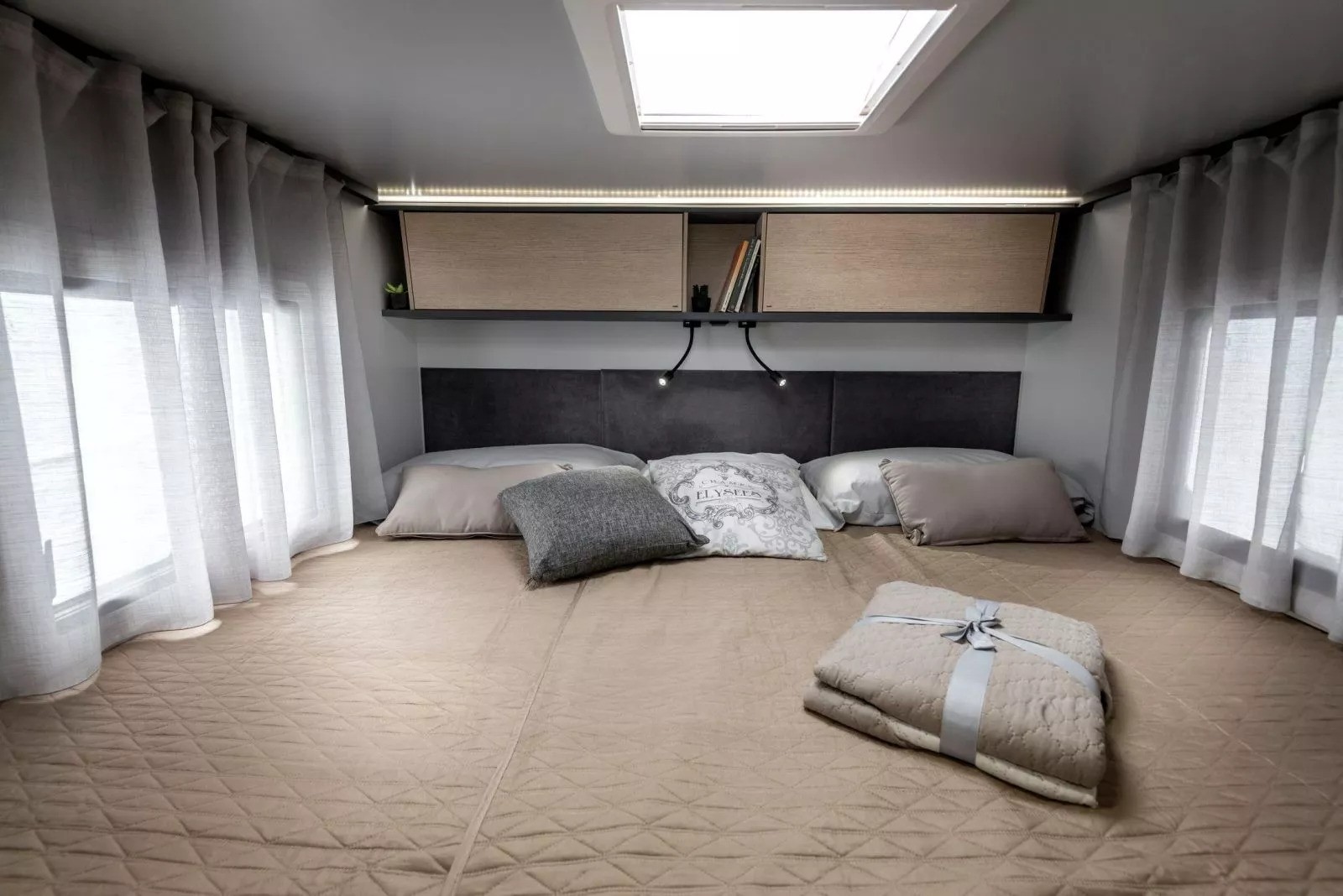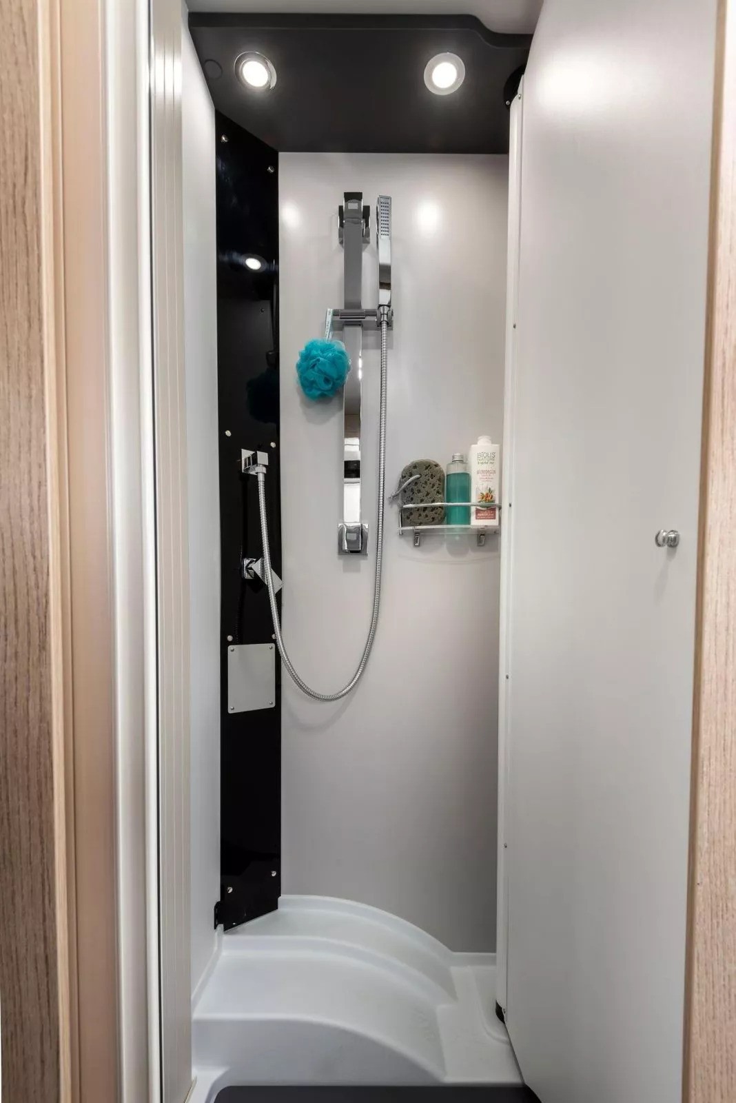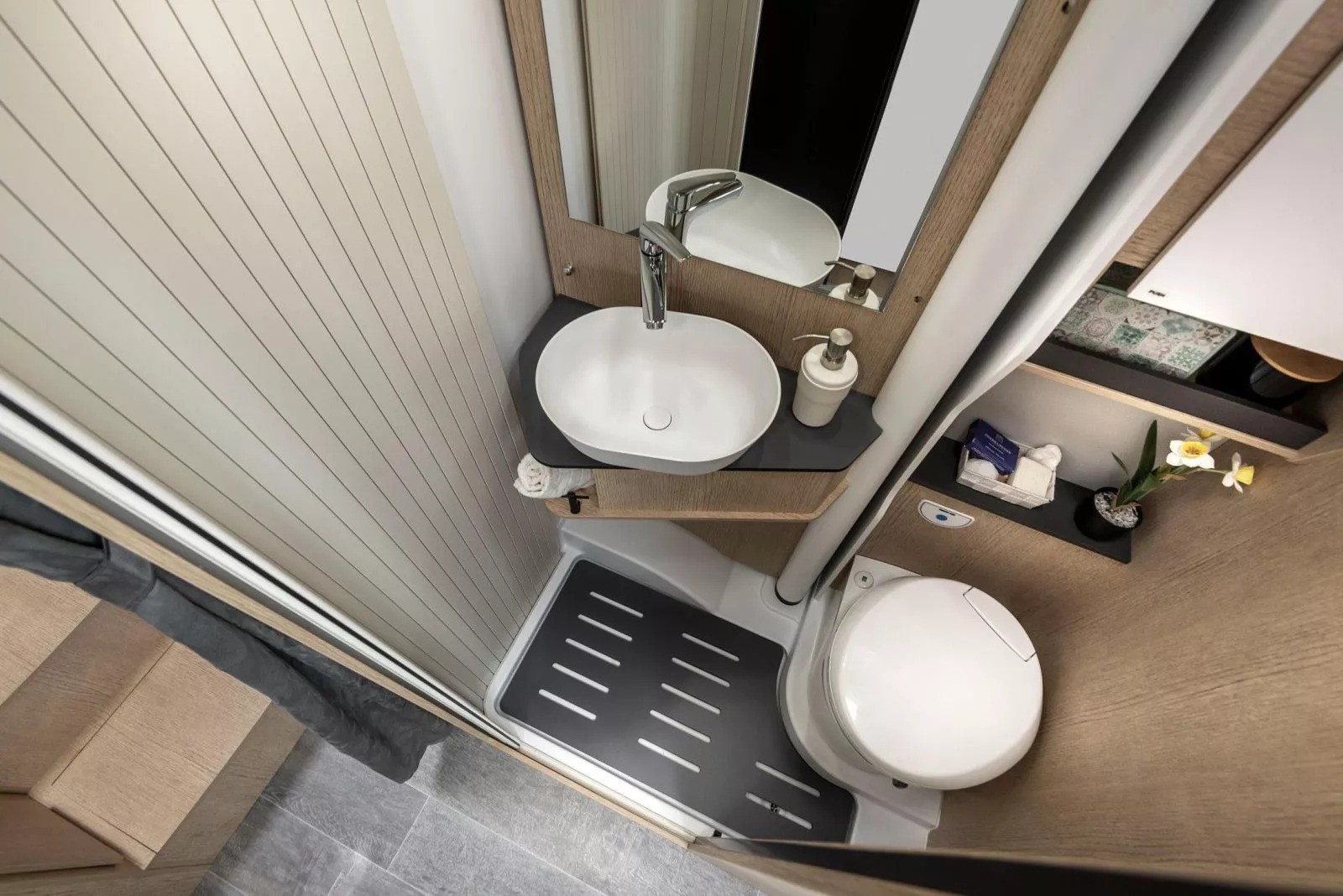 The Compact CX66 is a low-profile motorhome that combines compact dimensions with impressive liveability, thanks to a layout designed down to the last detail. At 6.60 metres in length, it features rear double beds that can be joined, a comfortable bathroom with separate shower, and a practical living area with face-to-face dinette. The front drop-down bed adds extra sleeping capacity, making it ideal for families or small groups. A generous rear garage, easily accessible, allows you to carry everything you need for your trips.