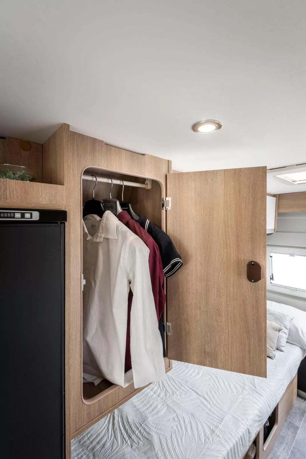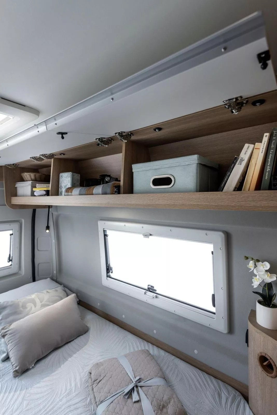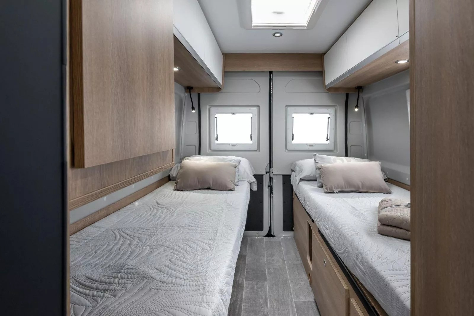Maximum Storage: A central aisle and generous under-bed cupboards provide ample storage space, and ease of access for travelling with bikes, outdoor gear, and long-term travel essentials.