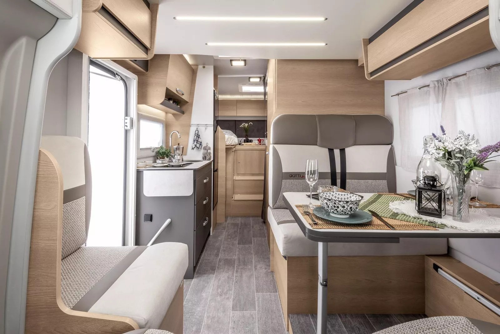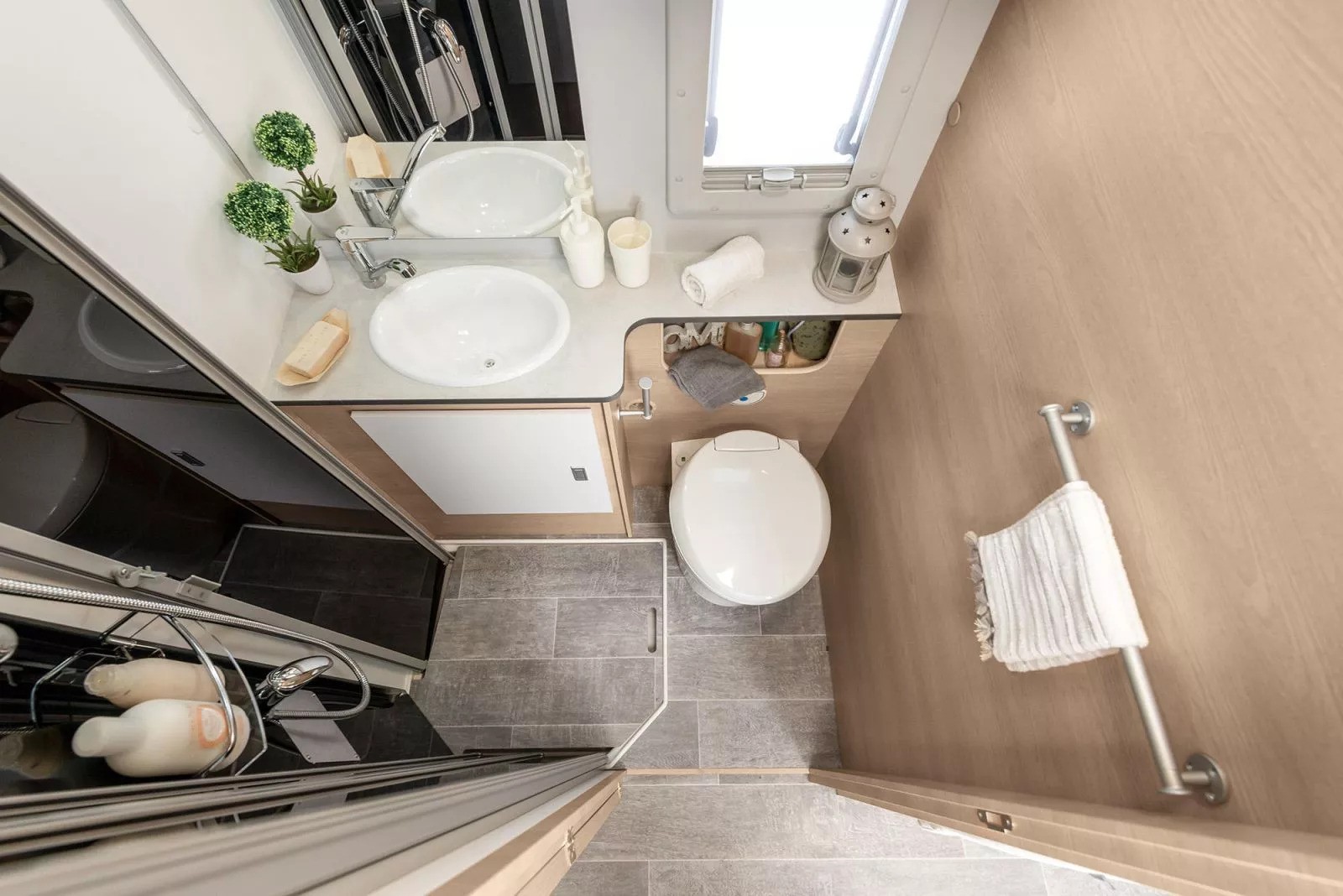 The Siena 385 is the ideal semi-integrated model for those who want a versatile, spacious and easy-to-live-in camper. With its 6.99 meters in length, it offers generous and well-distributed interior spaces, with a rear transverse double bed, bathroom with separate shower box and a bright and welcoming living area. The dinette easily transforms into an additional bed, making this model perfect for couples or small families. The large rear garage, accessible from both sides, allows you to carry everything you need for every adventure. The Siena 385 is the perfect balance between compact dimensions and great habitability.