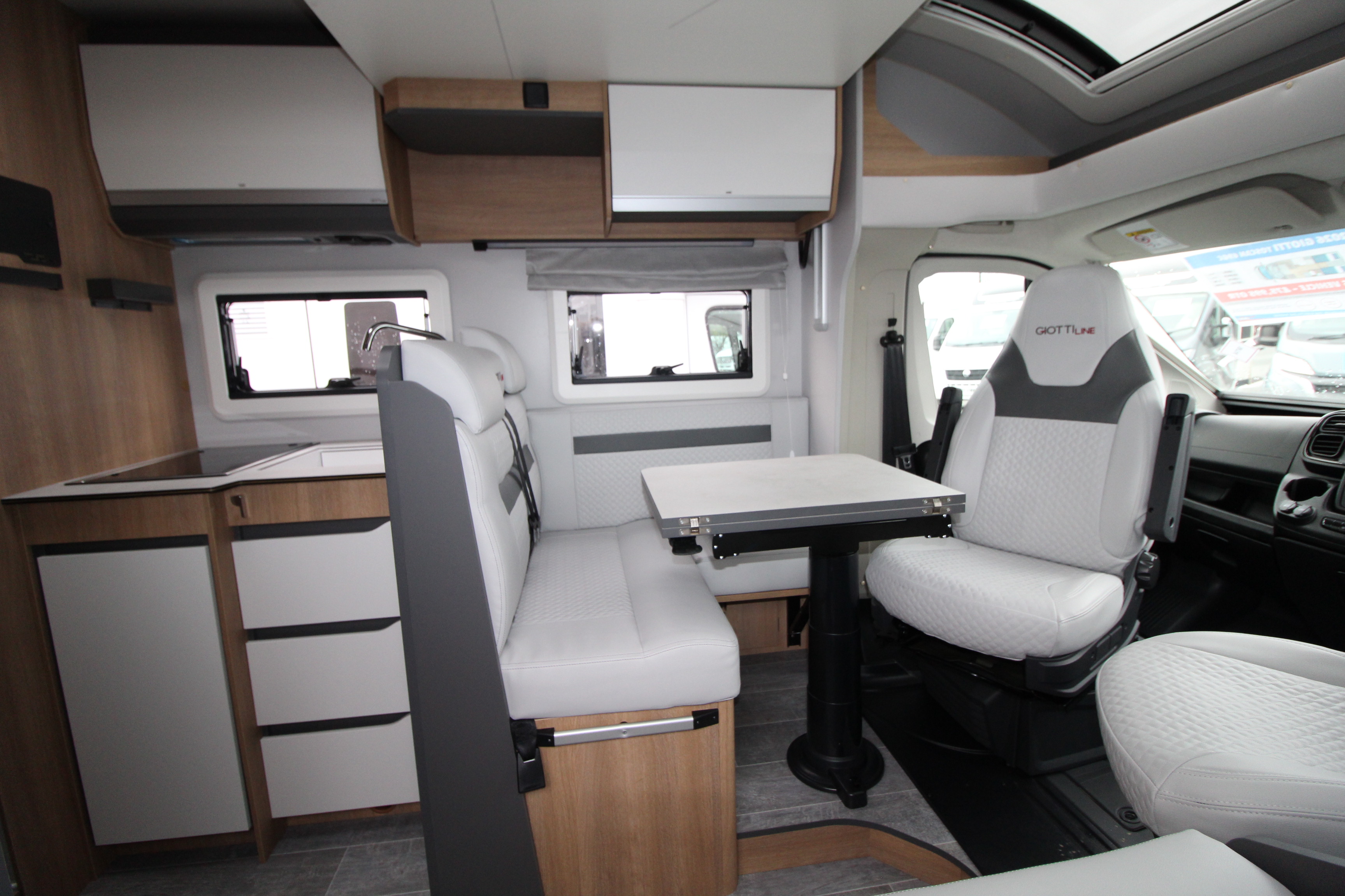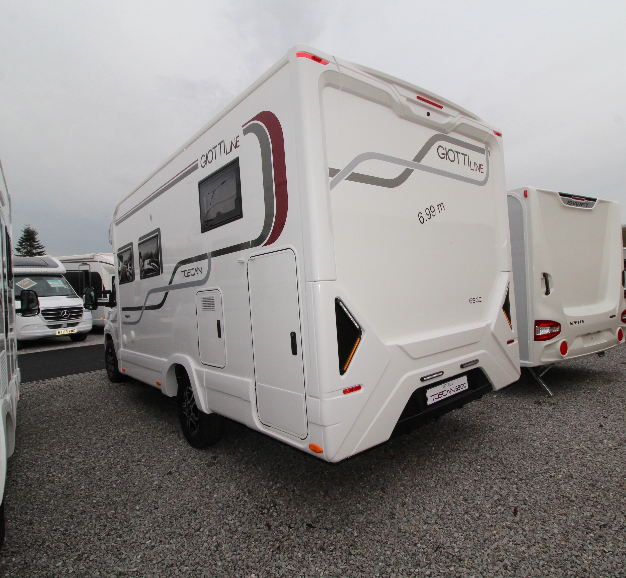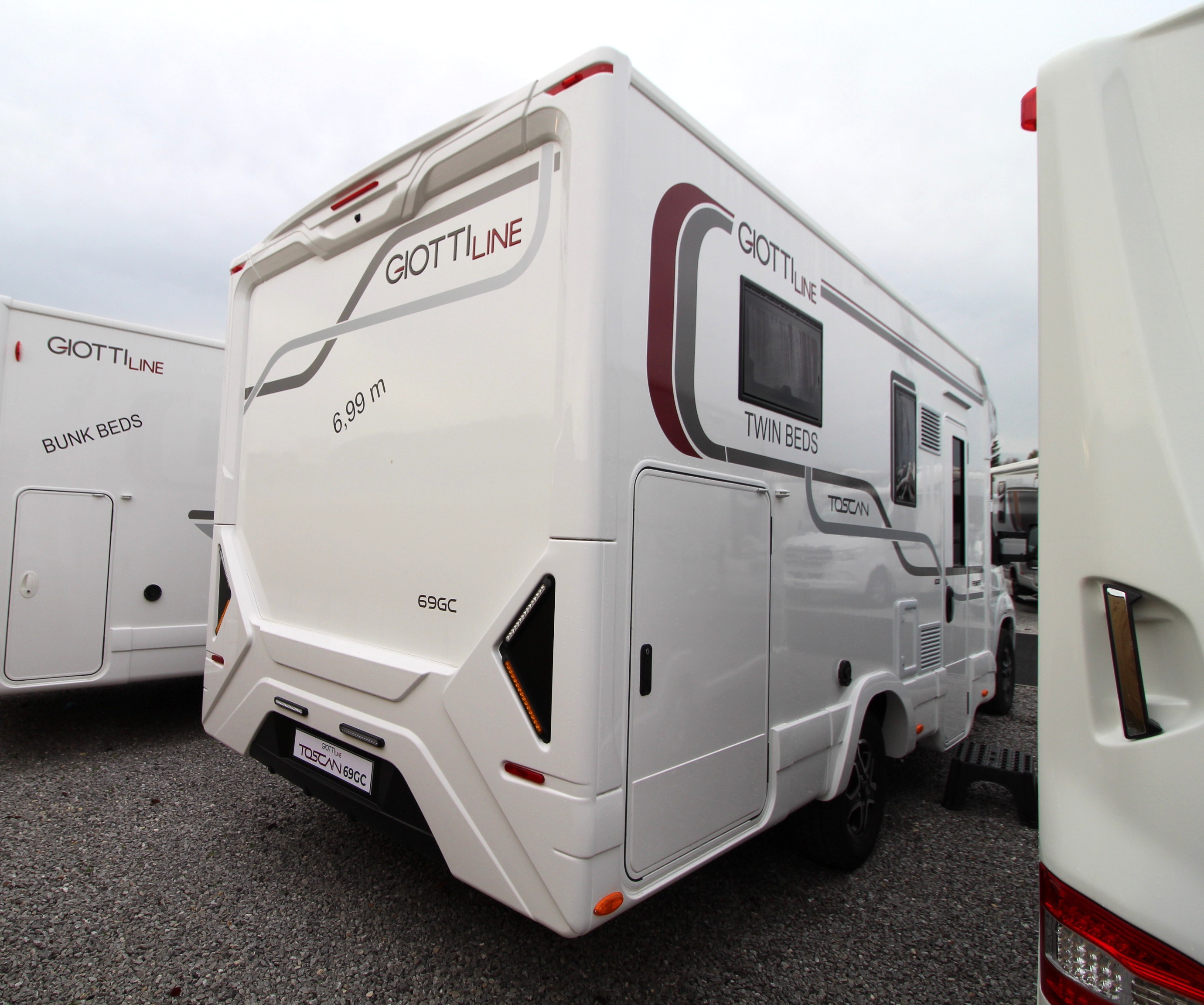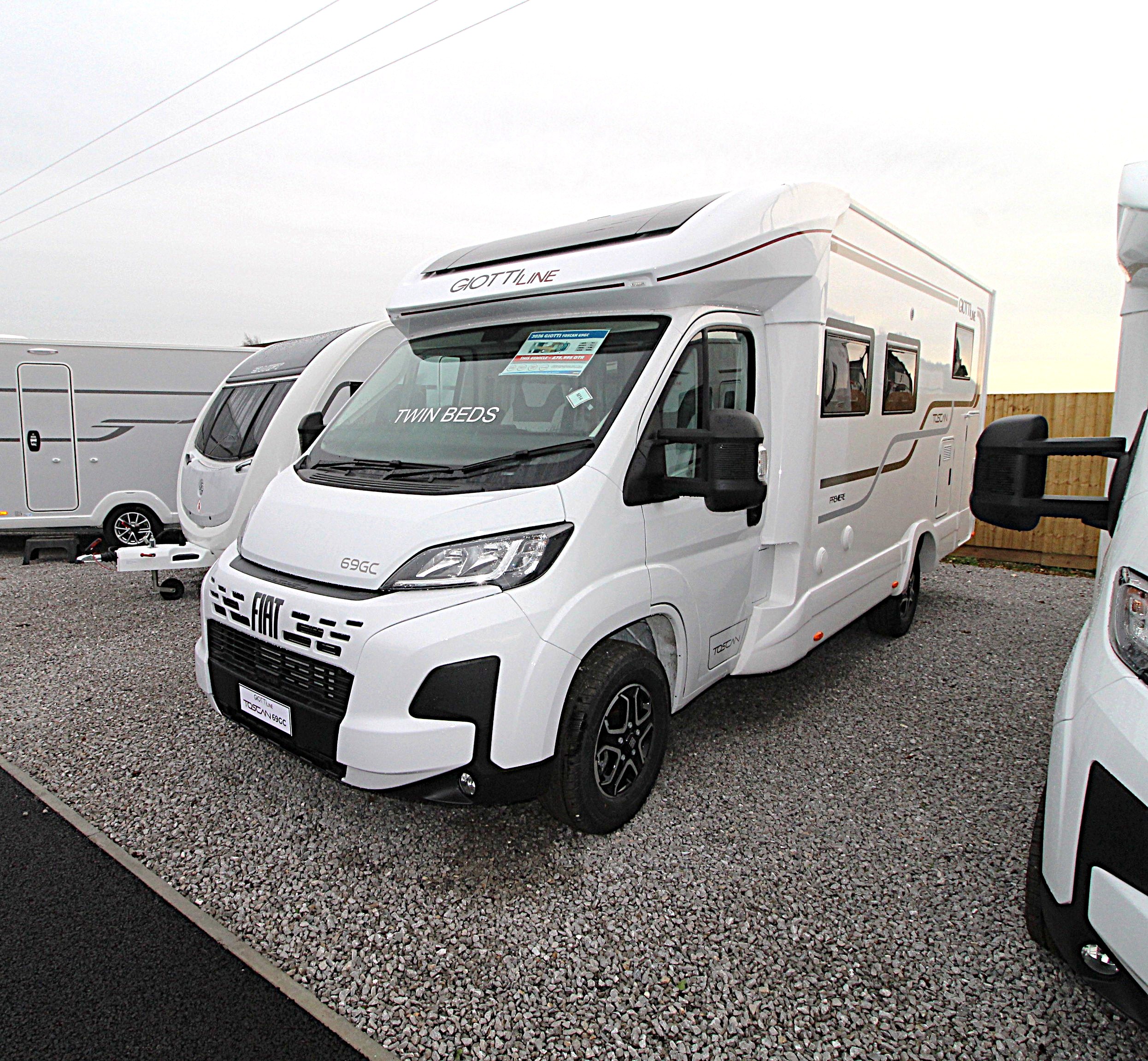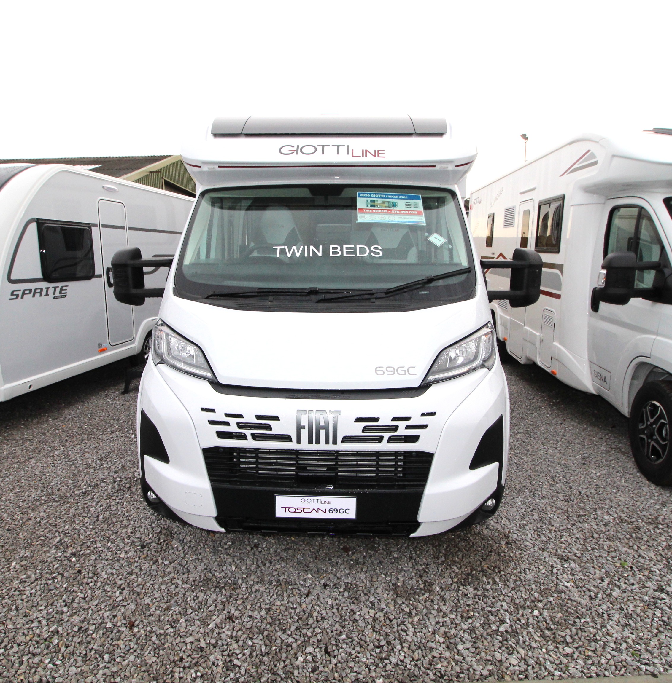 The all new, premium 2026 Giottiline Toscan 69GC is a 6.99-meter, semi-integrated motorhome available on a Fiat Ducato chassis. Designed for comfort and style with rear twin beds, a walk-through bathroom with a separate shower, and a modern living area. This model features a convertible dinette, and a drop-down bed adding sleeping flexibility for up to four people.
