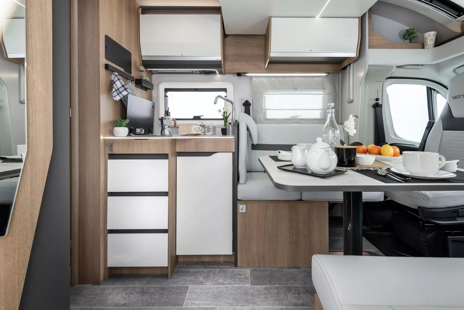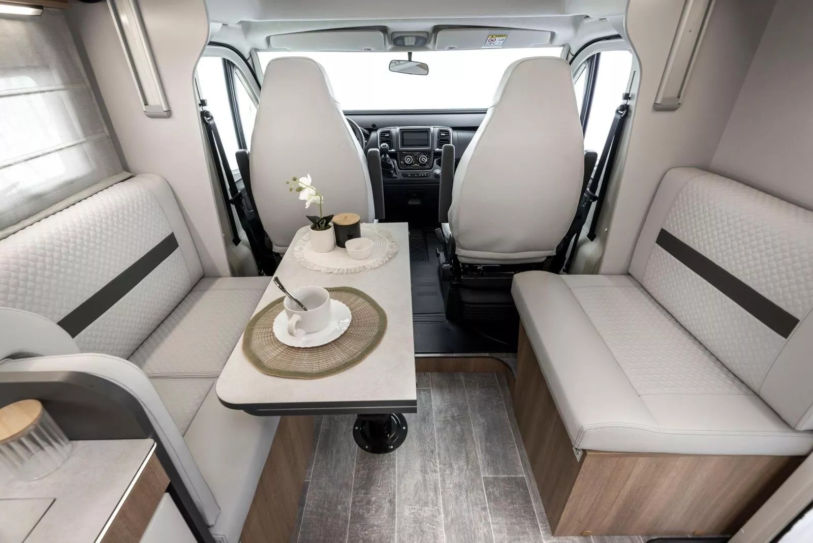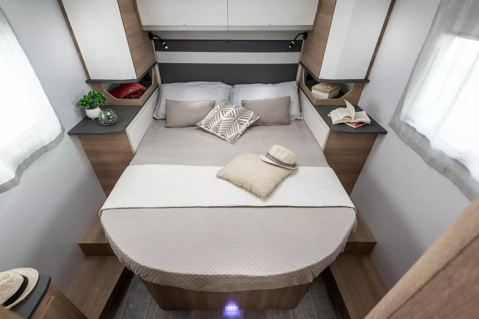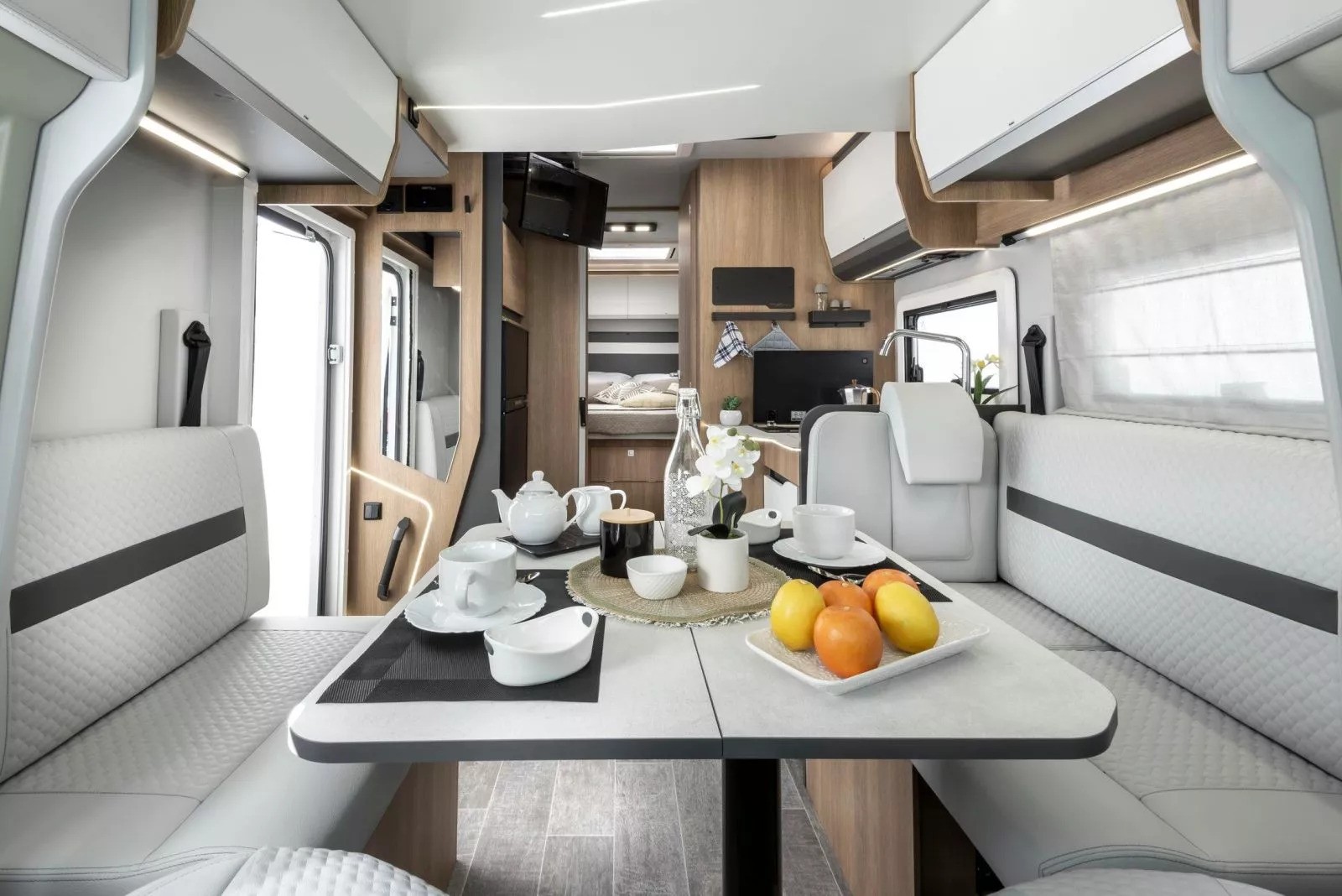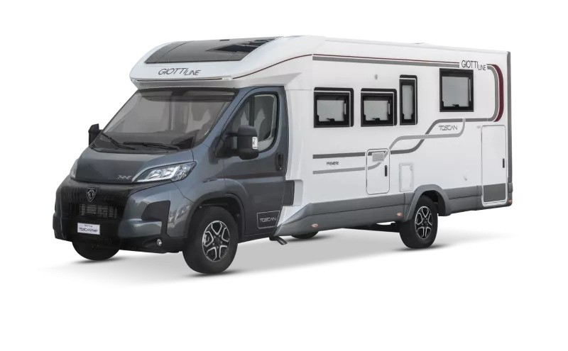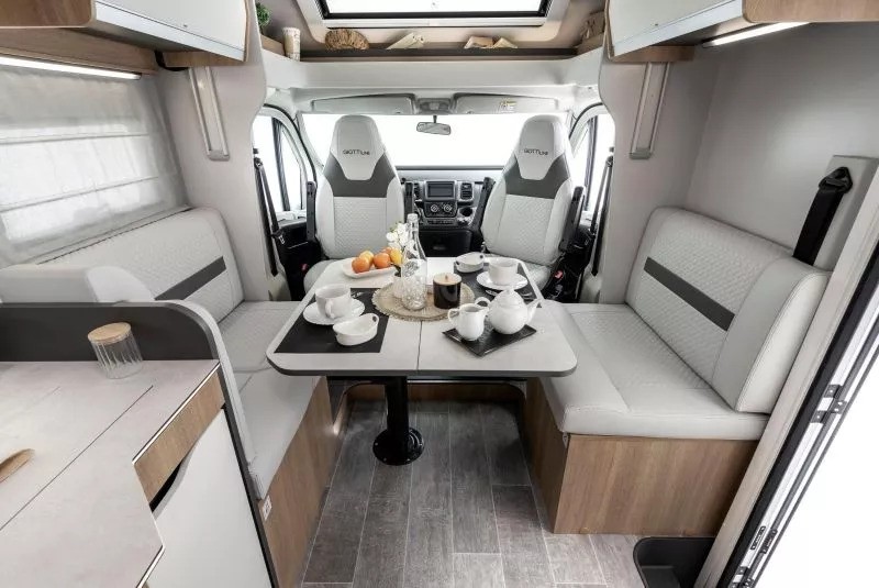 The Toscan 74NF FIAT with its 7.42 meters , offers a layout with a central rear double bed , bathroom with separate shower and large living area with a drop-down bed. The interiors are refined, well-lit and designed to offer maximum liveability in every season.