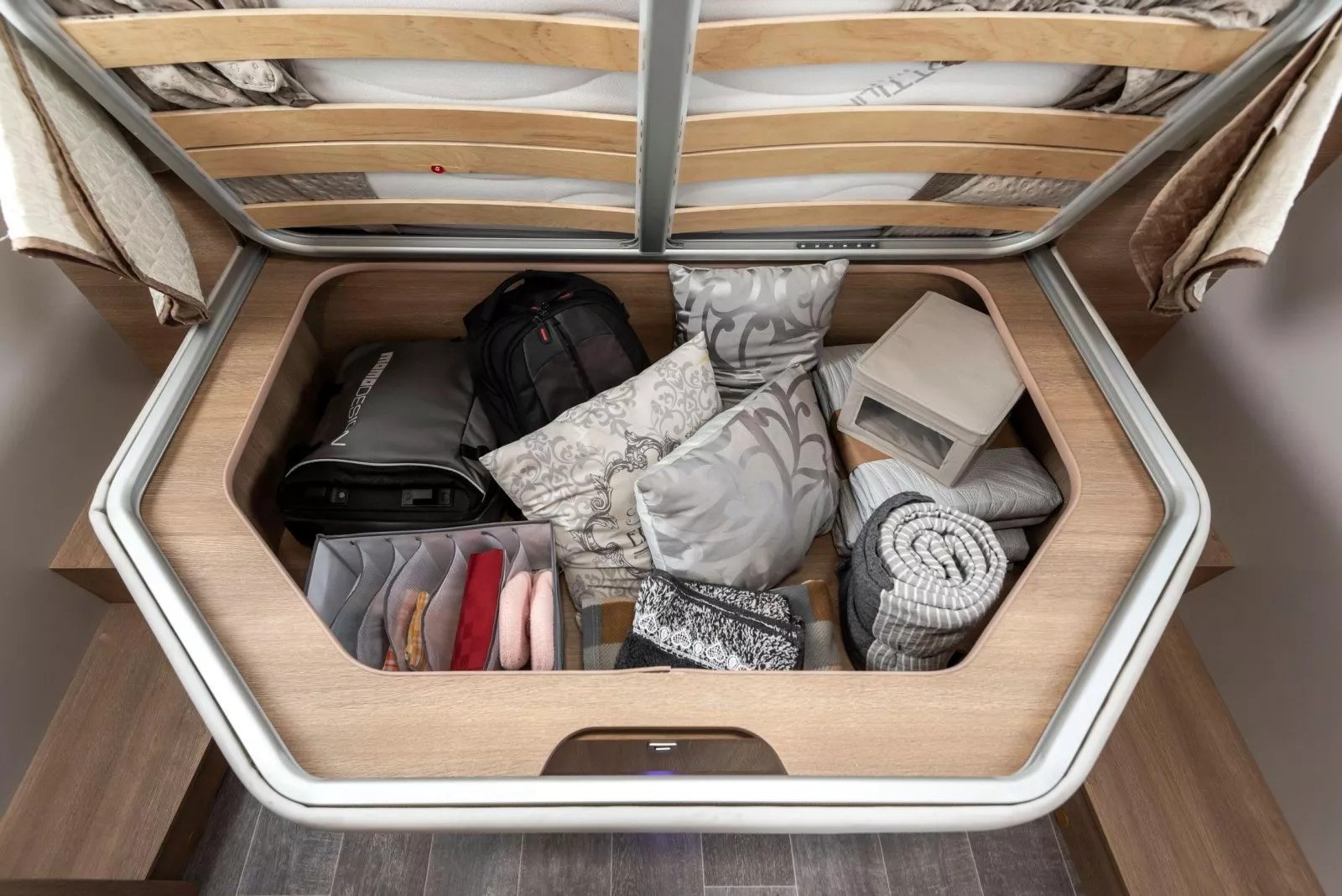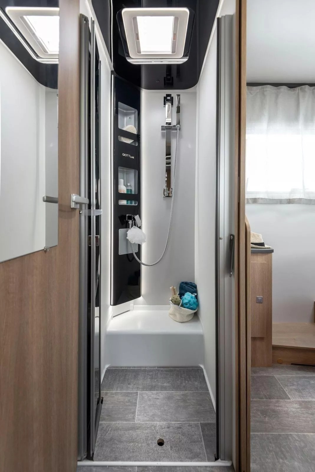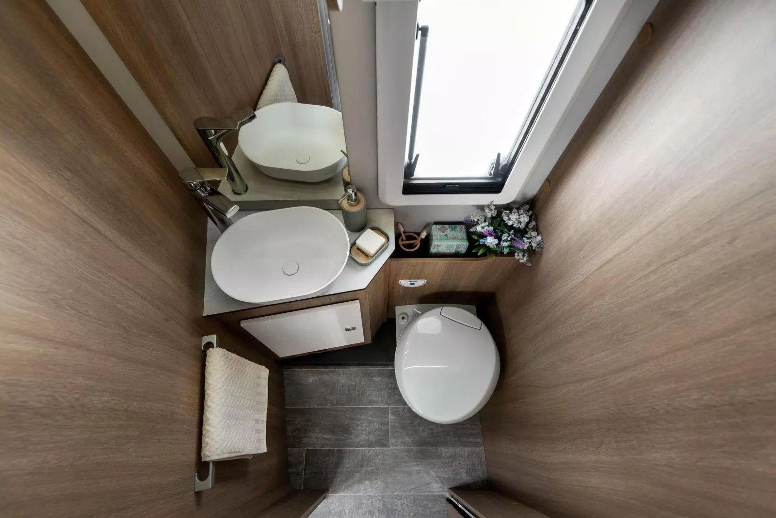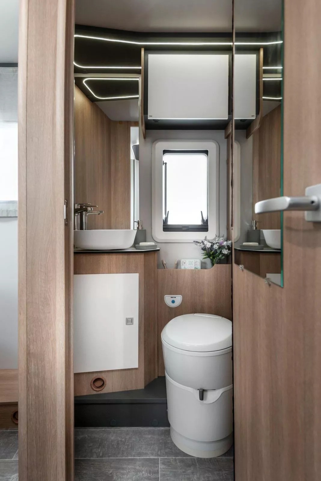 The Toscan 74NF FIAT with its 7.42 meters , offers a layout with a central rear double bed , bathroom with separate shower and large living area with a drop-down bed. The interiors are refined, well-lit and designed to offer maximum liveability in every season.
