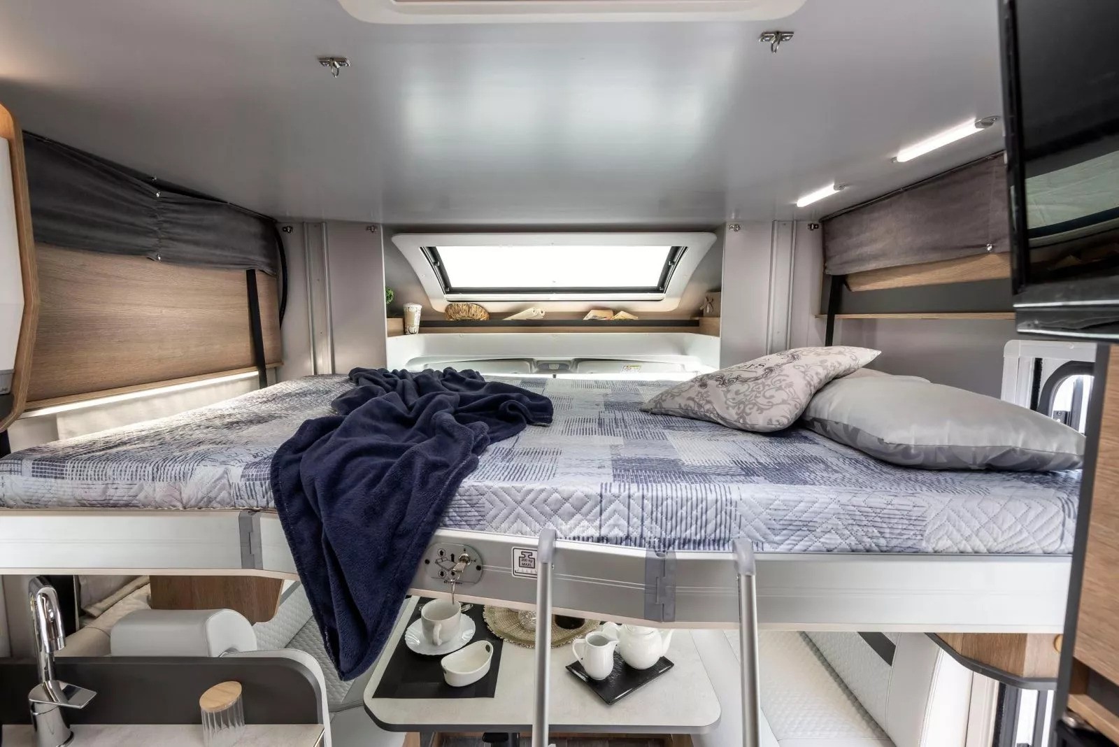 The Toscan 74NF FIAT with its 7.42 meters , offers a layout with a central rear double bed , bathroom with separate shower and large living area with the a drop-down bed. The interiors are refined, well-lit and designed to offer maximum liveability in every season.