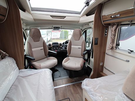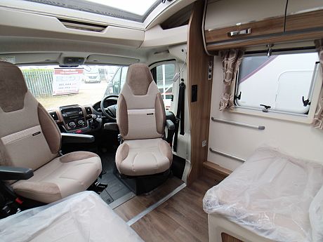 The Swift Bessacarr 597 motorhome is a sleek and contemporary motorhome and features raised, fixed single beds to the rear and a large lounge area to the front with 2 seatbelts, perfect for meal times and can convert into an additional double bed. The interior of the Bessacarr 597 has a very luxurious feel and is enhanced by the huge quality soft furnishings and fittings throughout. There is a large L-shaped kitchen which features black worktops, a full oven, hob and grill. The 597 motorhome features plenty of storage space throughout including a large garage space and plenty of overhead lockers. Available now at Wandahome South Cave.