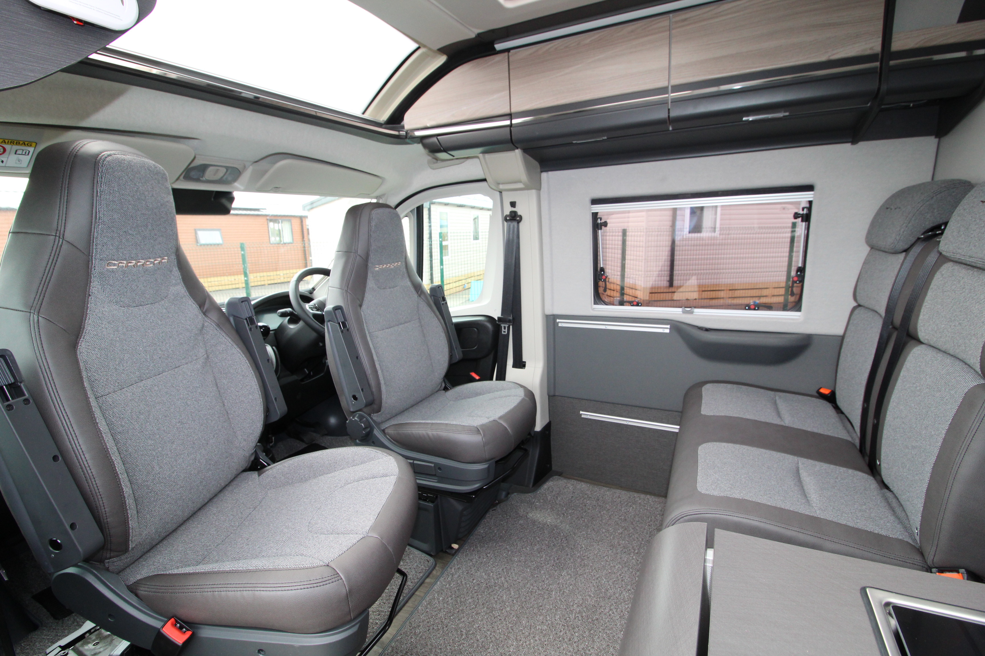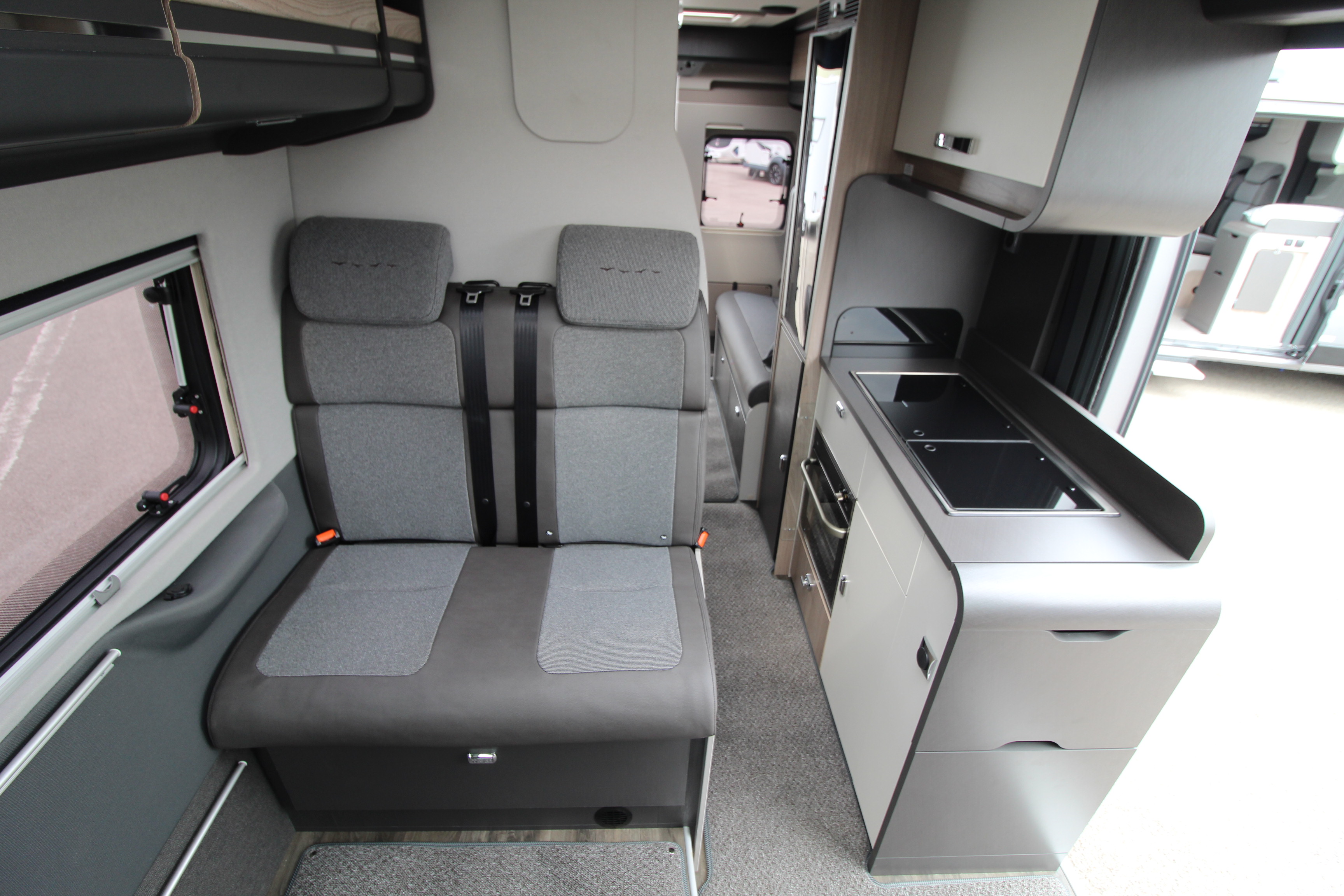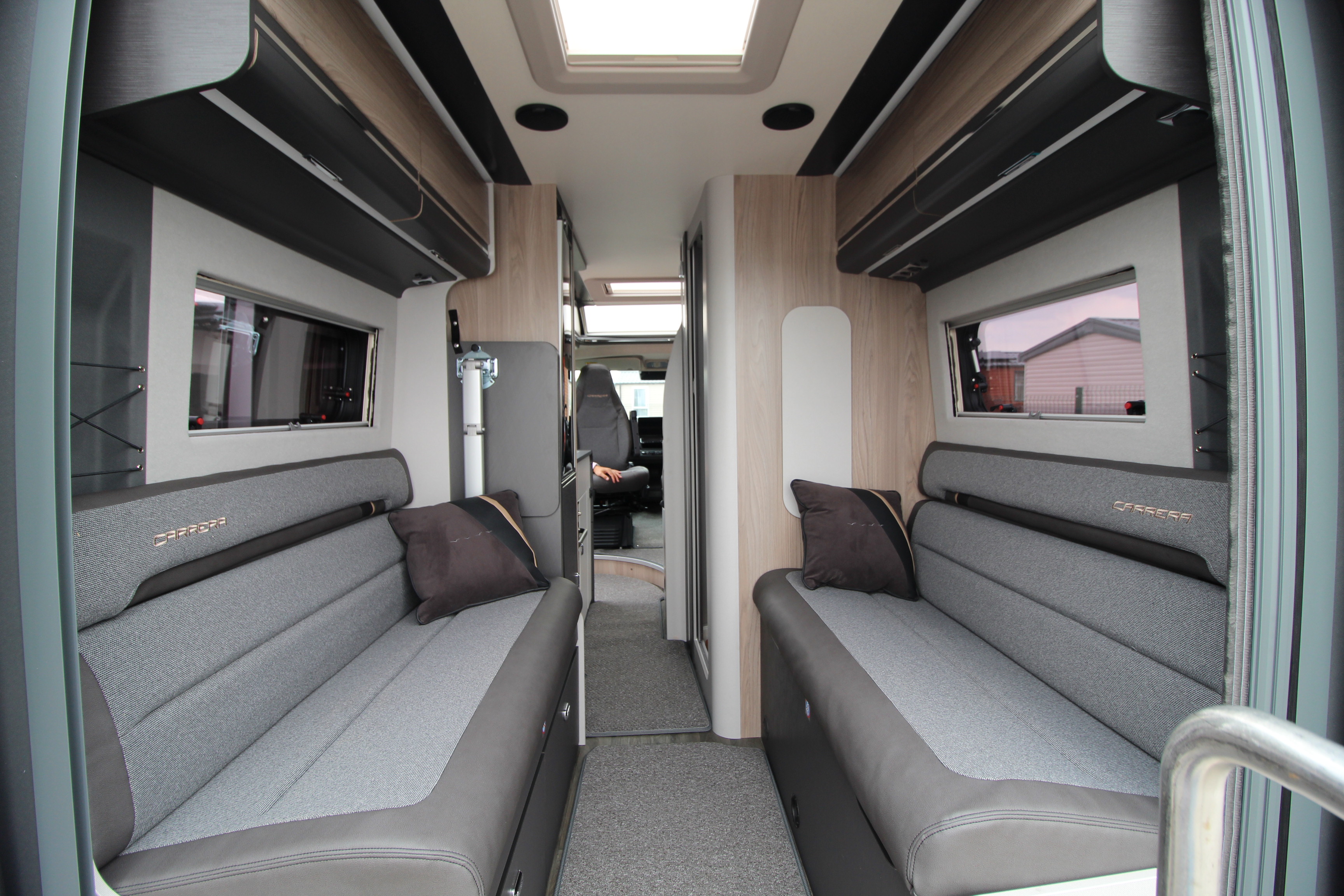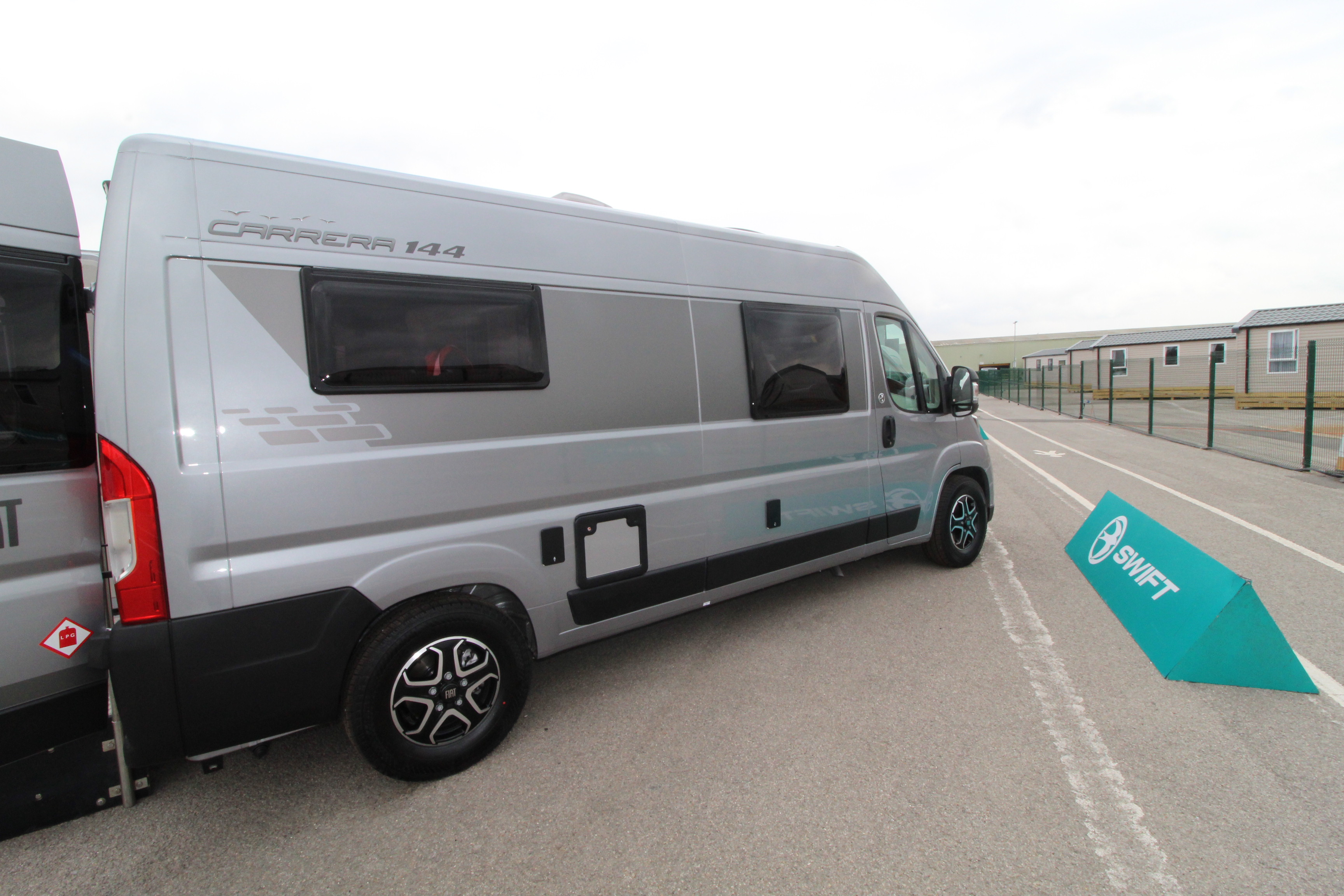 The Swift Carrera 144 is a 3 berth,4 belt van that presents a rear lounge which can convert to to single beds or one transverse double with the benefit up front of a twin bench seat and swivel cab seats that can be made up to a single bed.