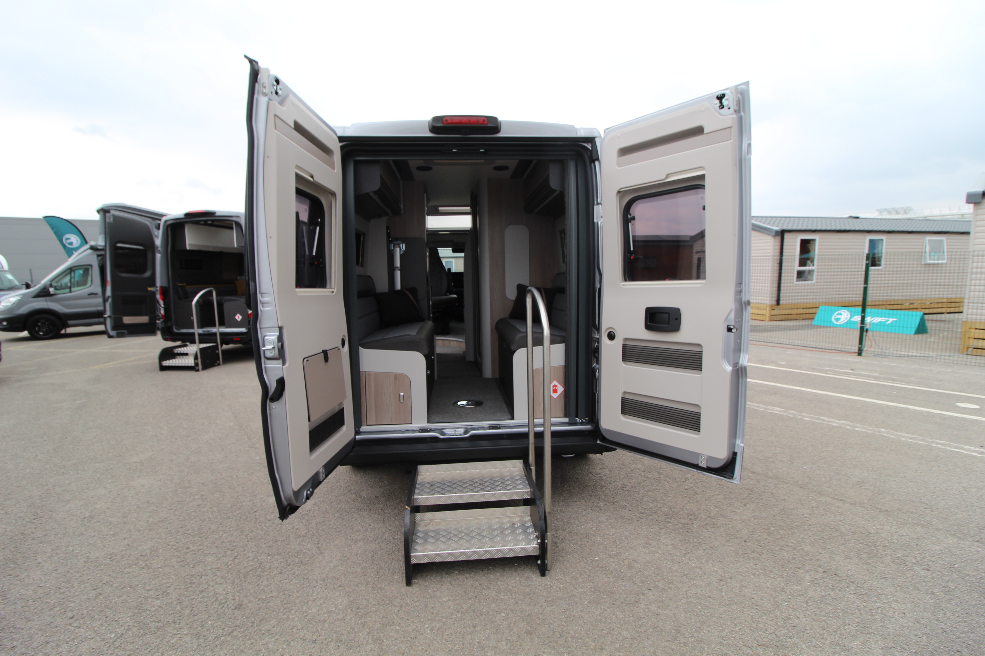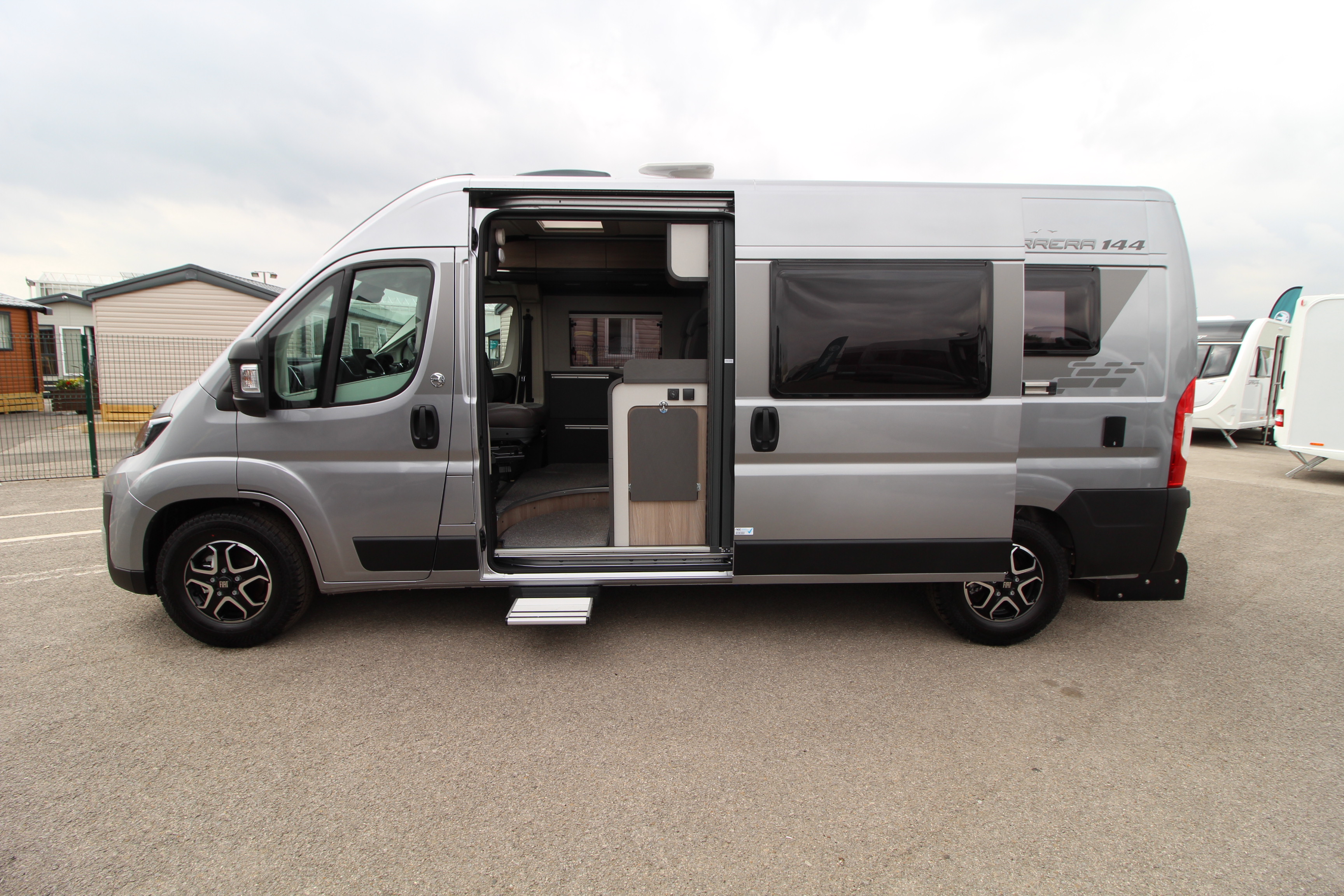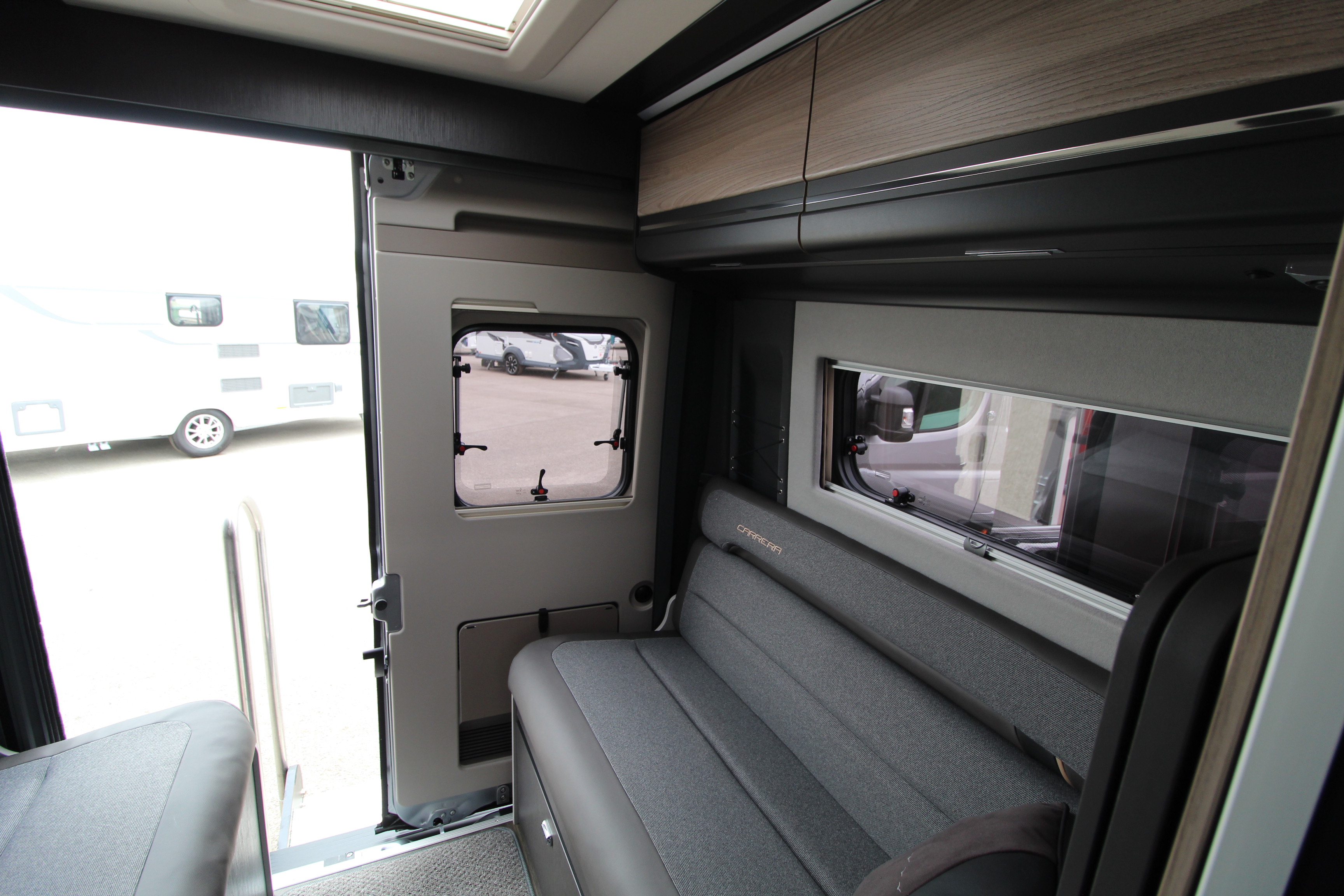 The Swift Carrera 144 is a 3 berth,4 belt van that presents a rear lounge which can convert to to single beds or one transverse double with the benefit up front of a twin bench seat and swivel cab seats that can be made up to a single bed.