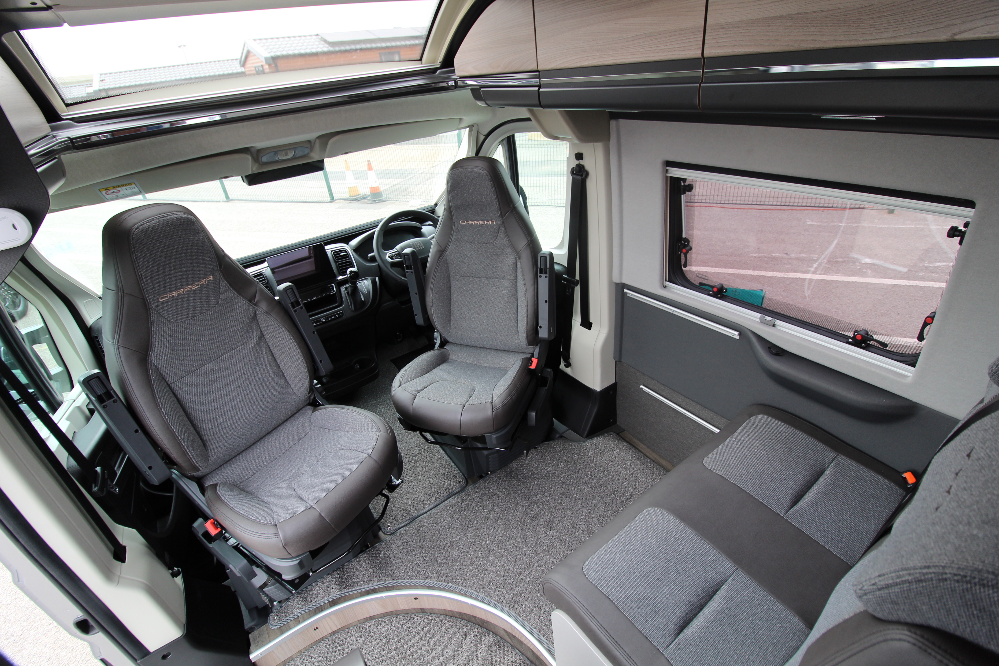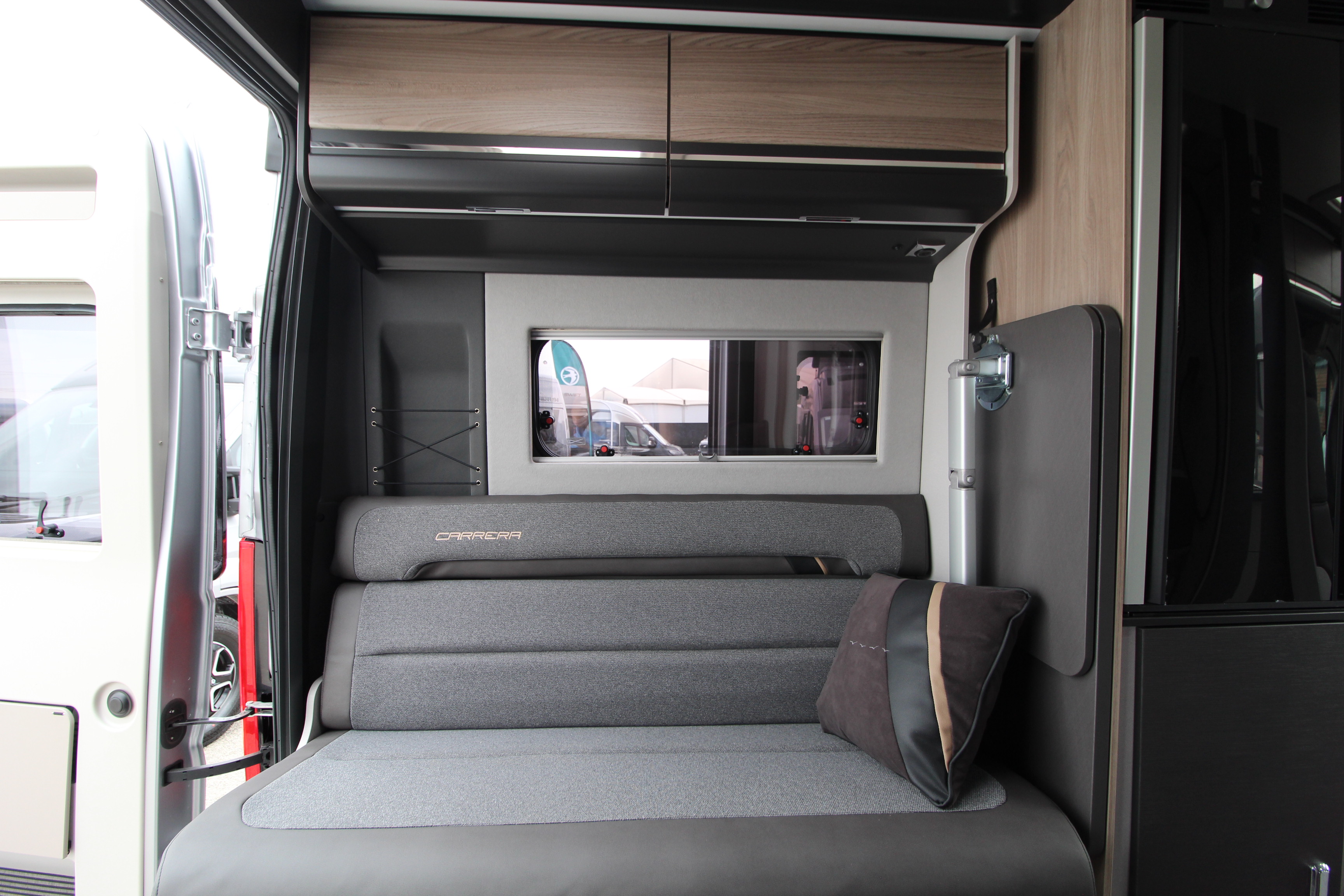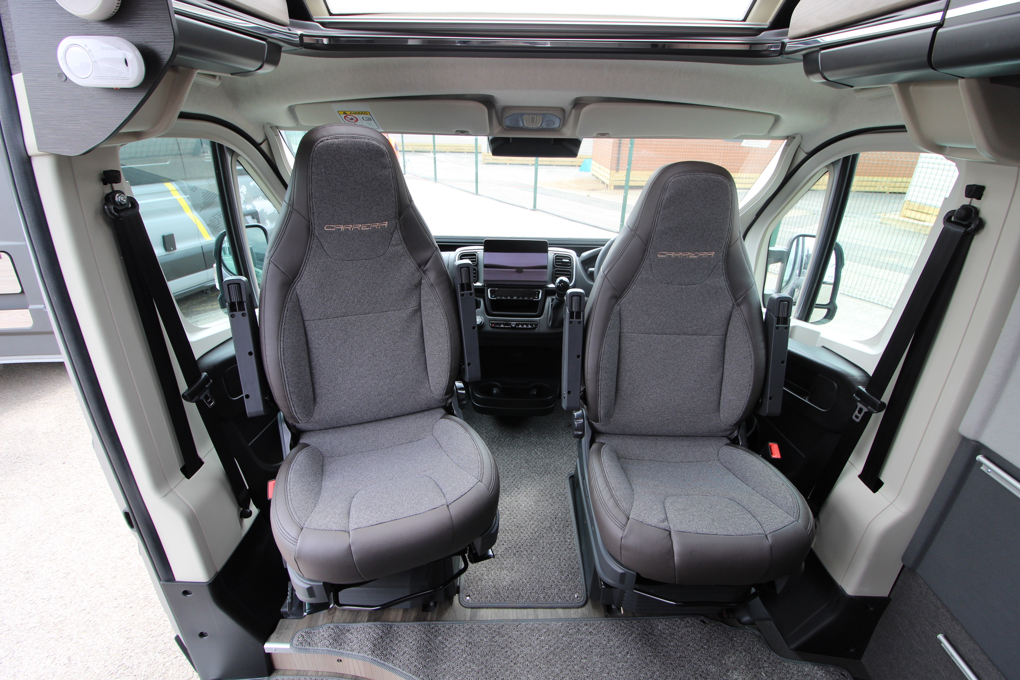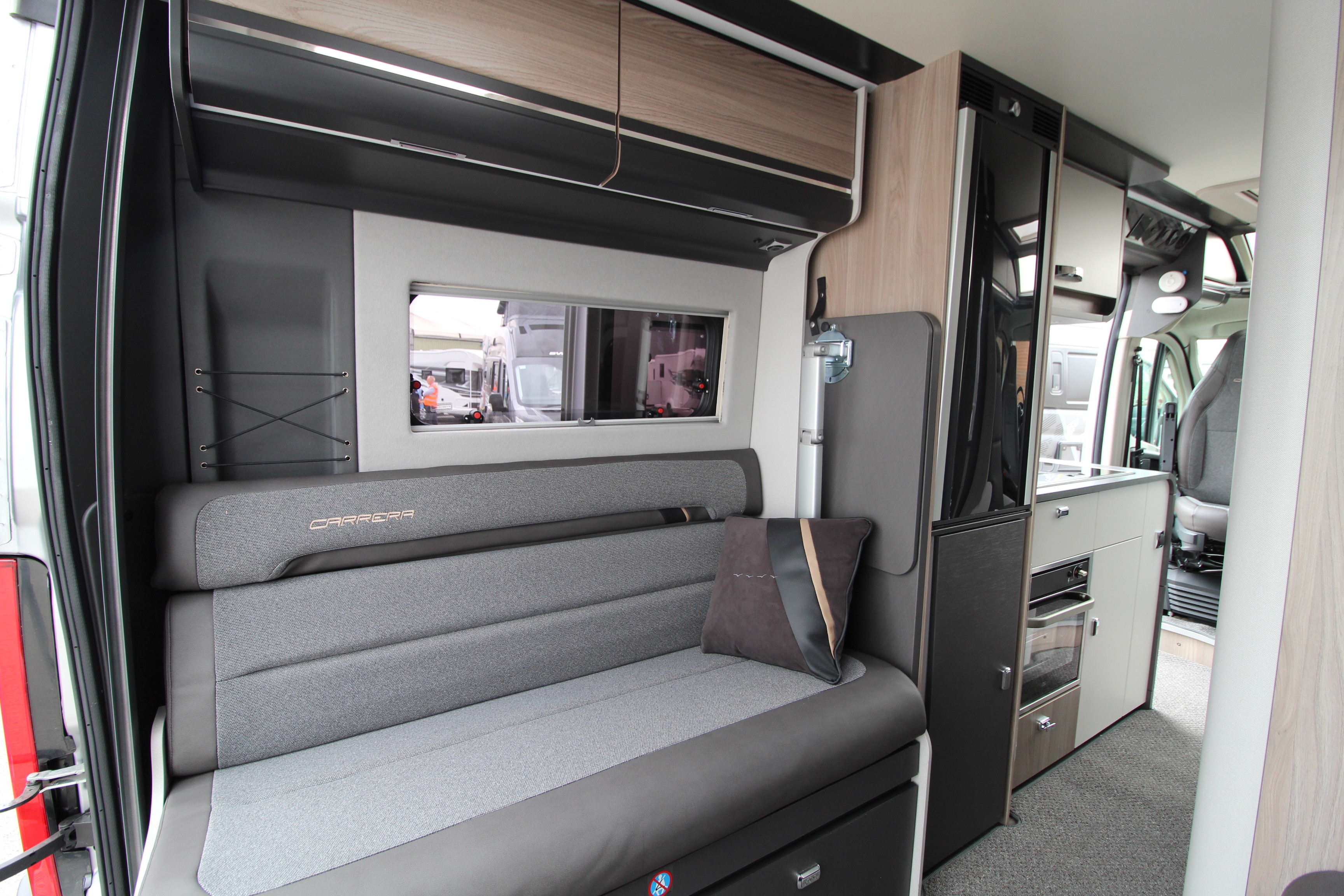The Swift Carrera 144 is a 3 berth,4 belt van that presents a rear lounge which can convert to to single beds or one transverse double with the benefit up front of a twin bench seat and swivel cab seats that can be made up to a single bed.