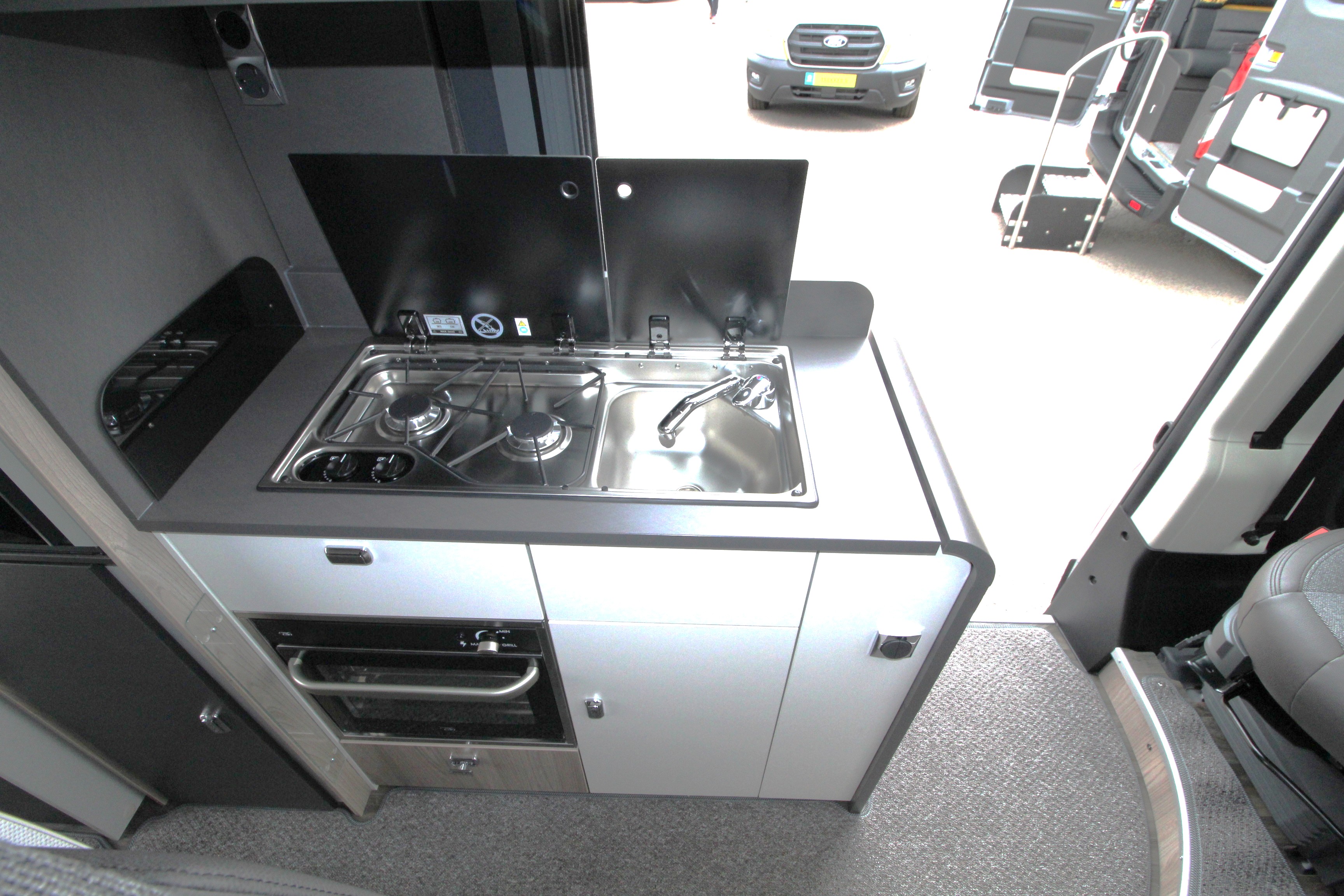 Combination Dometic two-burner stainless steel hob and sink with glass lids