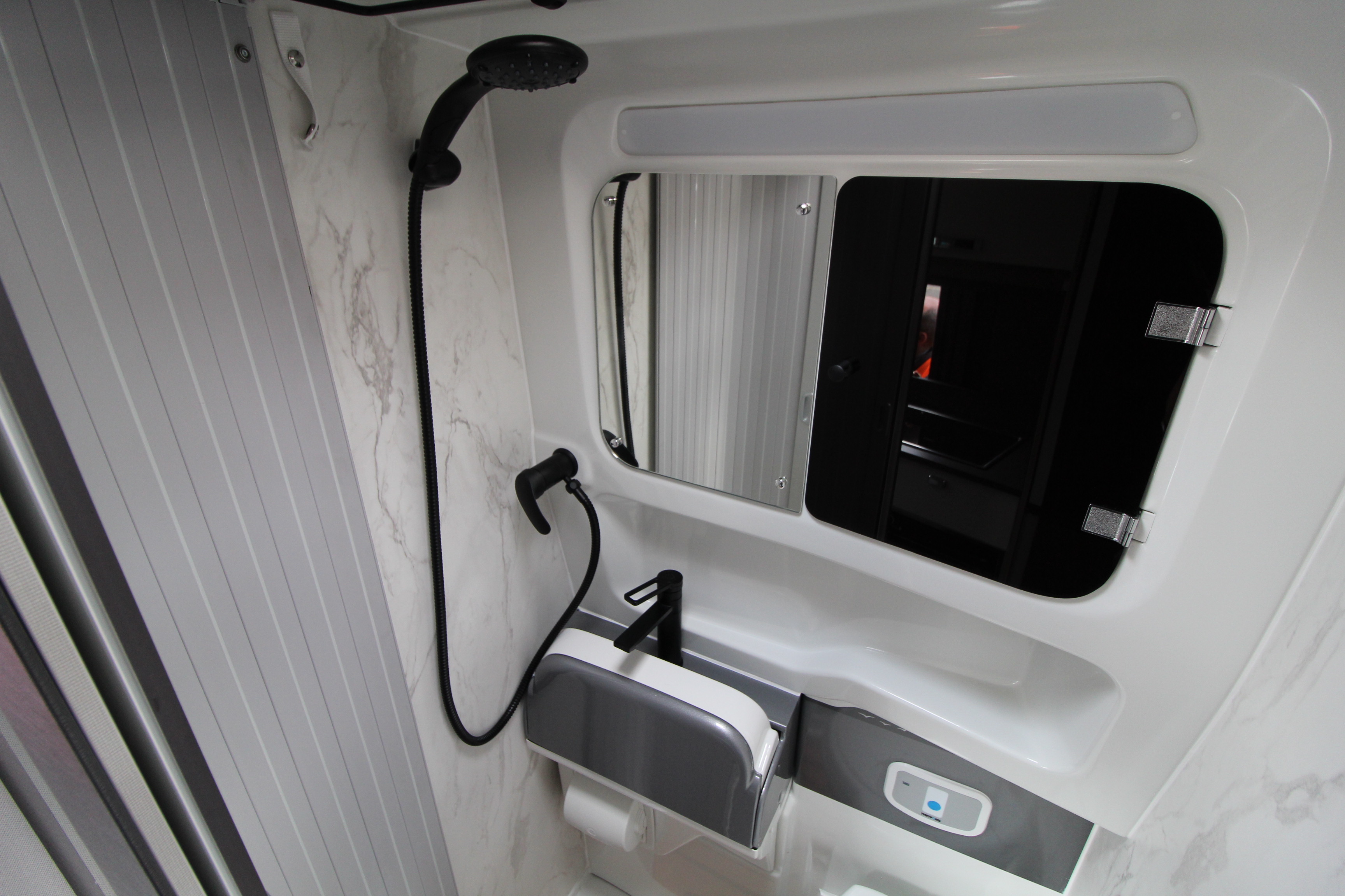 Washroom and shower tray with foldaway washbasin and NEW black separate vanity tap and washroom fittings