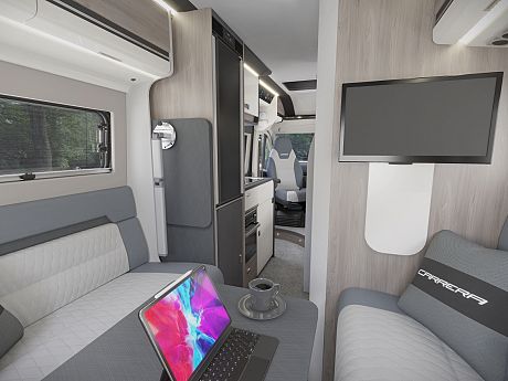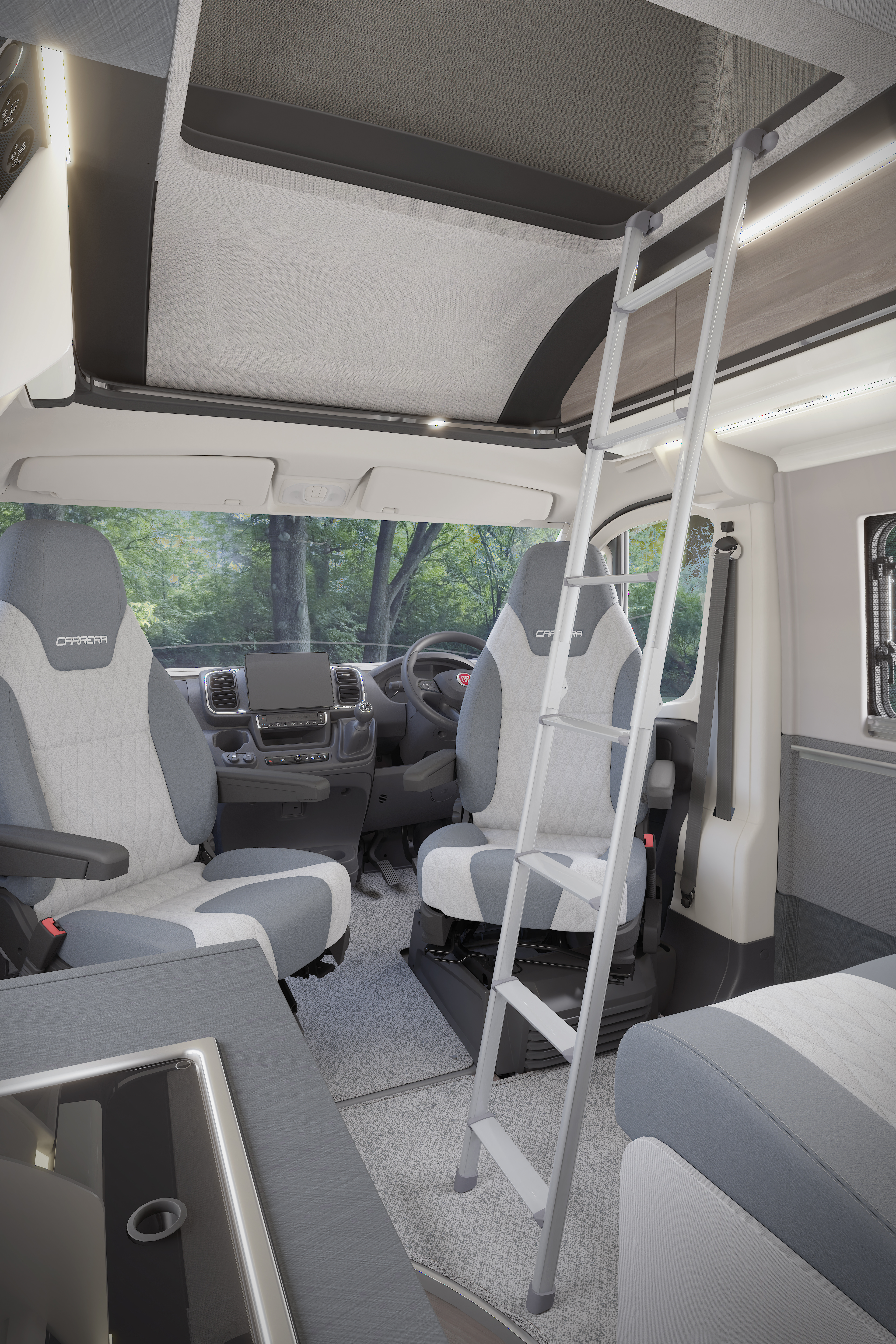 The front cab is equipped with everything needed for comfortable long journeys such as a new 10” touchscreen HD colour display with a new Sat Nav equipped with TomTom 3D map visualisation and selectable vehicle dimensions. When you’ve reached your destination, the driver and passenger captain chairs swivel round to provide additional lounge seating, perfect for all the family.