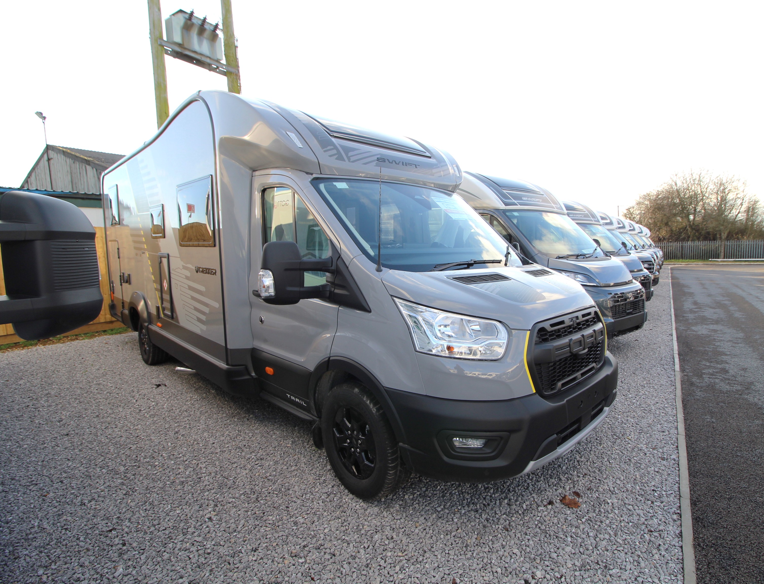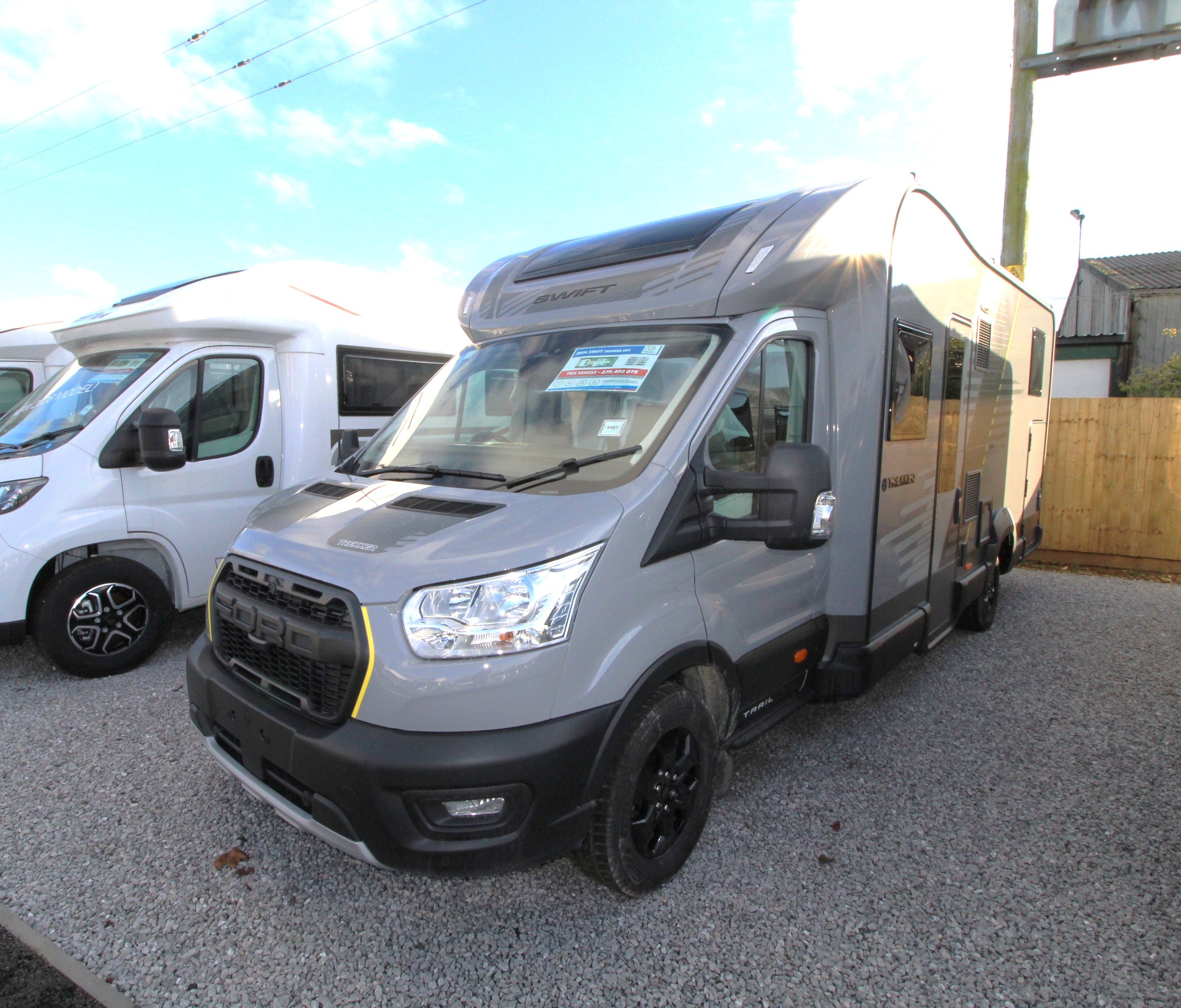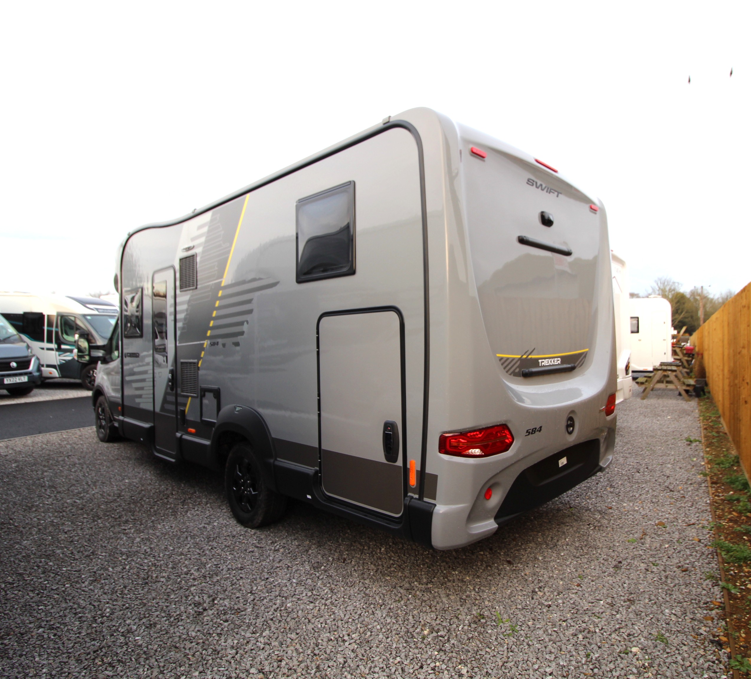 The striking all new Swift Trekker 584 four berth motorhome features a spacious lounge area, electric drop down double bed overhead, ceentre washroom with shower cubicle and fixed twin beds to the rear.