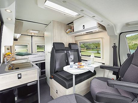 The living area is deceptively spacious and light thanks to the two Remis top lift and tilt rooflights. The kitchen features a 2-burner gas cooker, 65-litre compressor fridge and plenty of storage for all those pots and pans.
