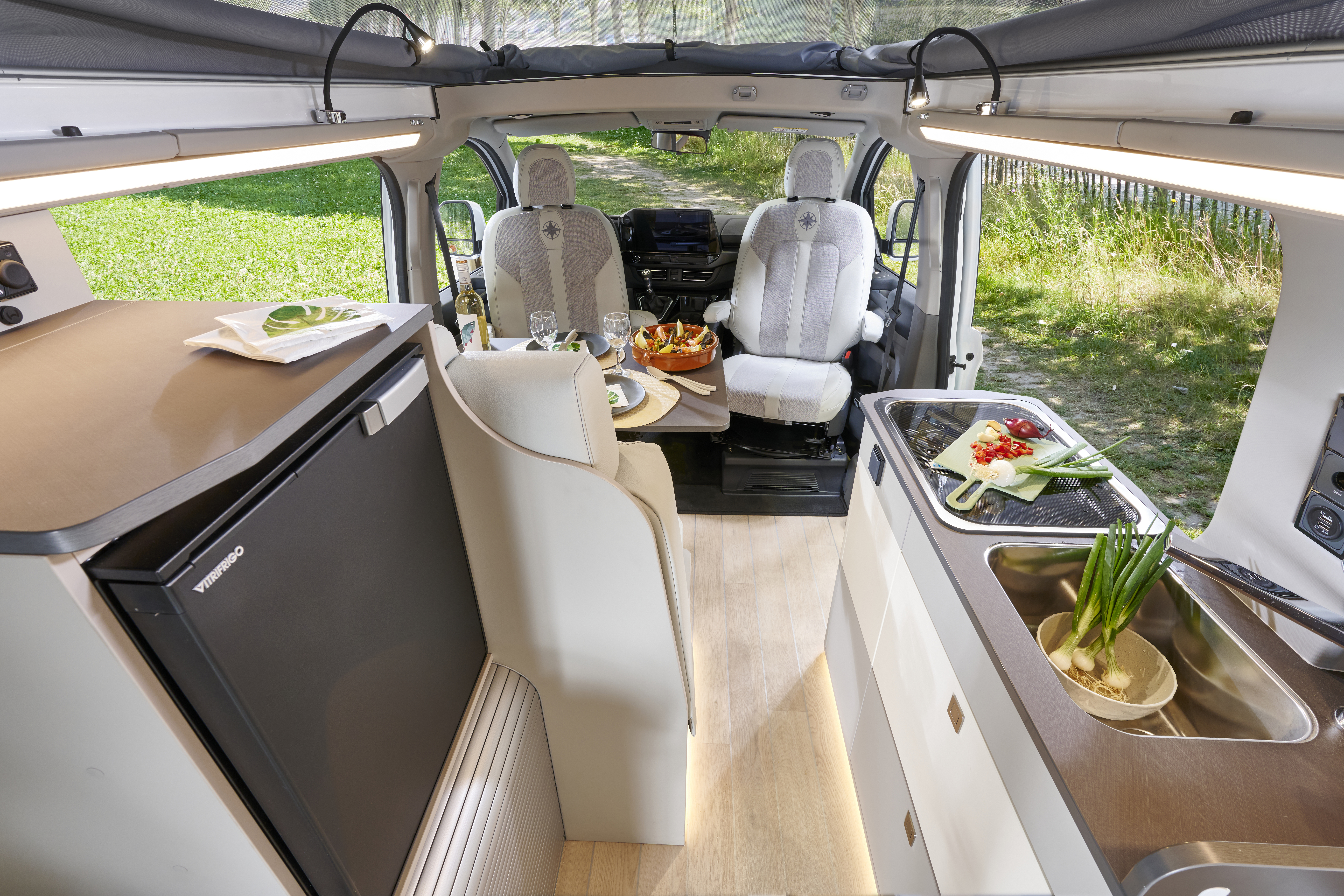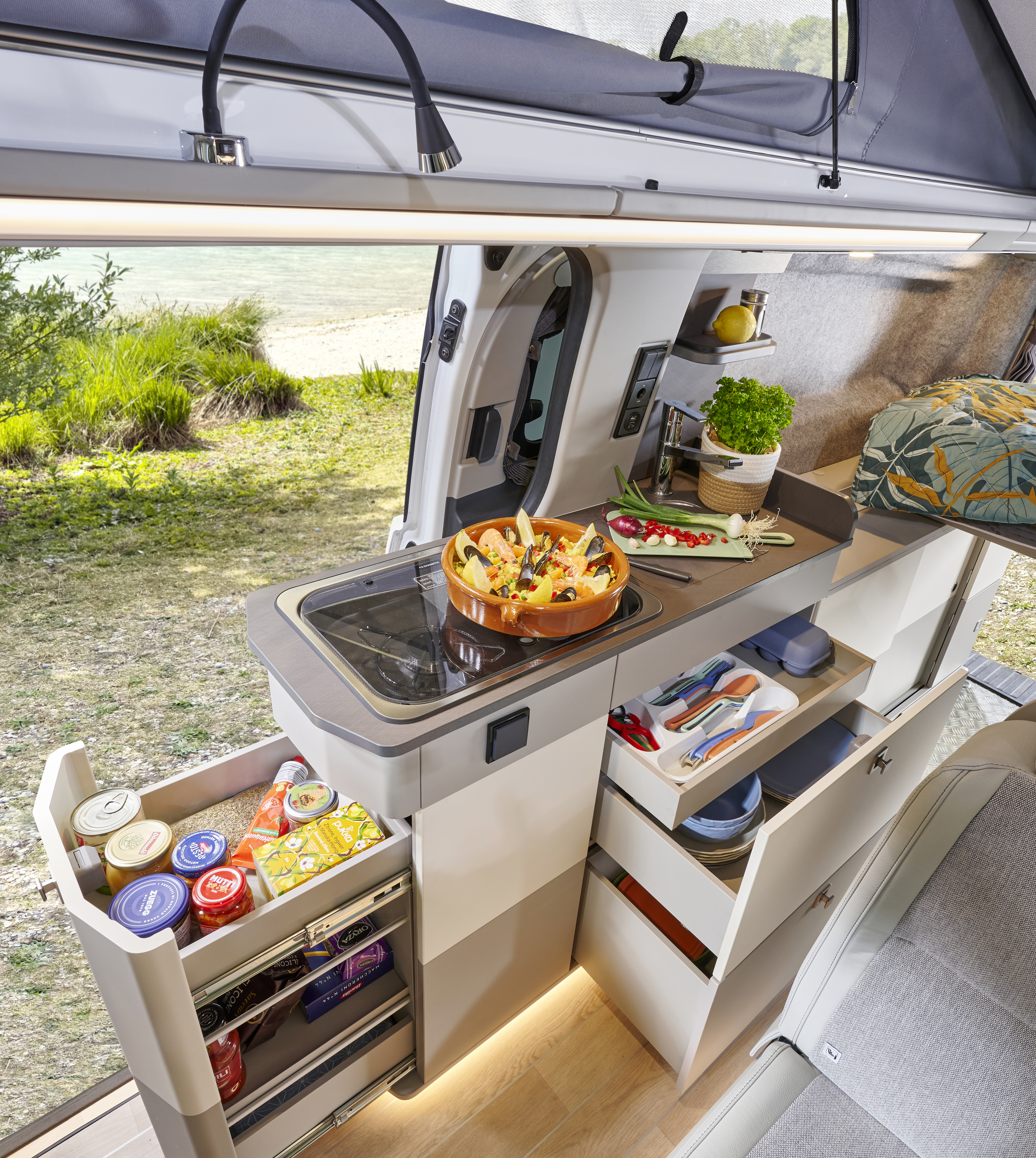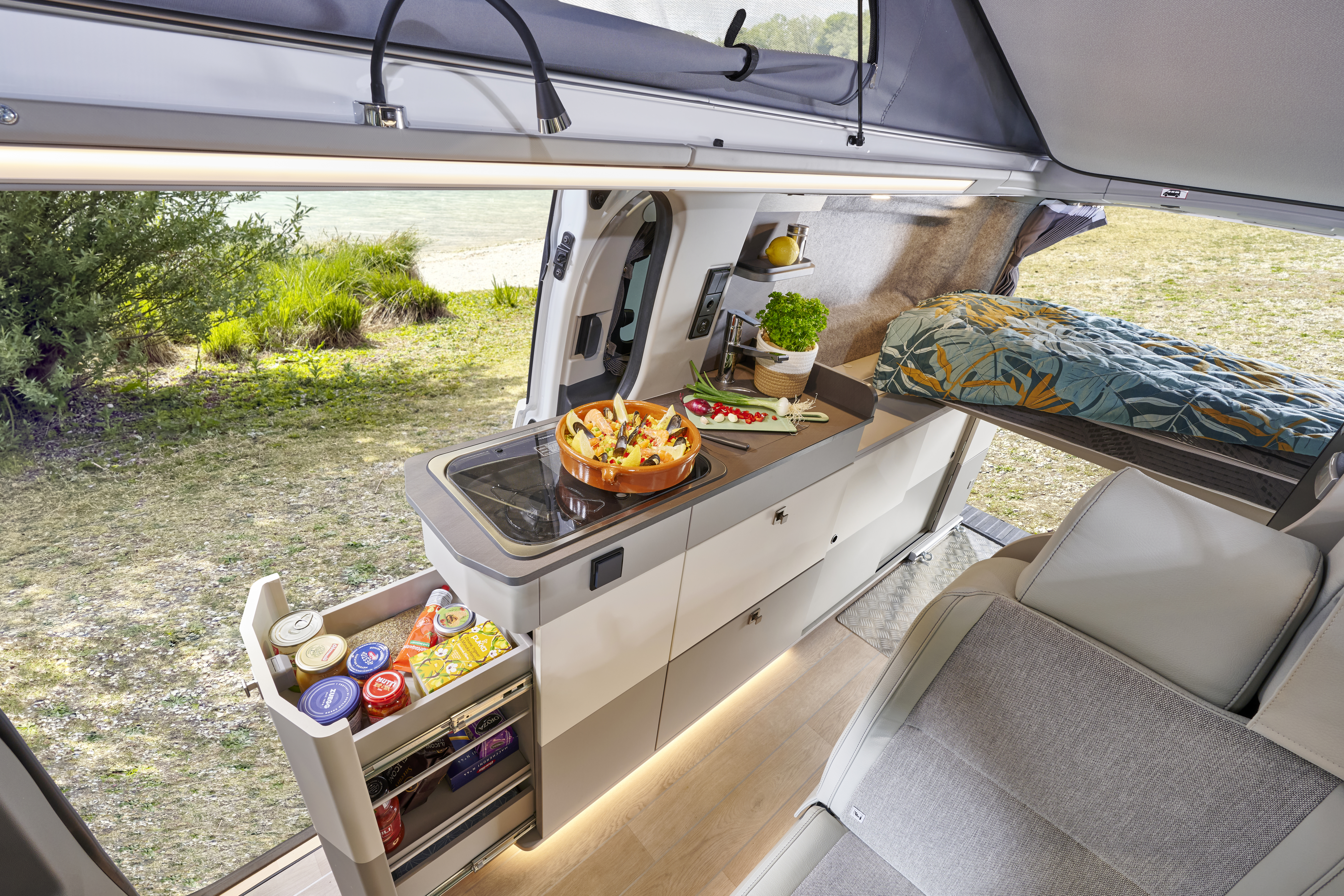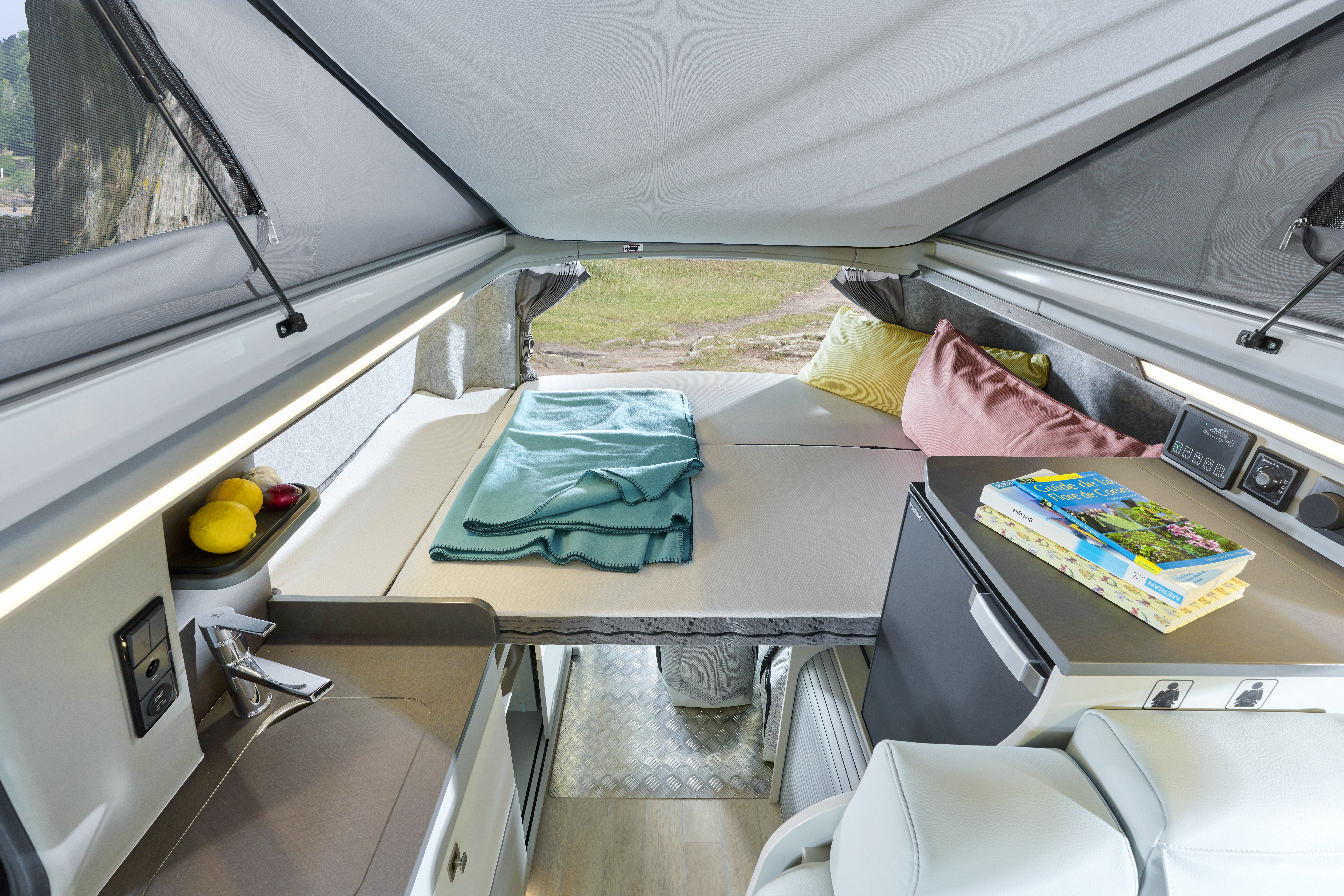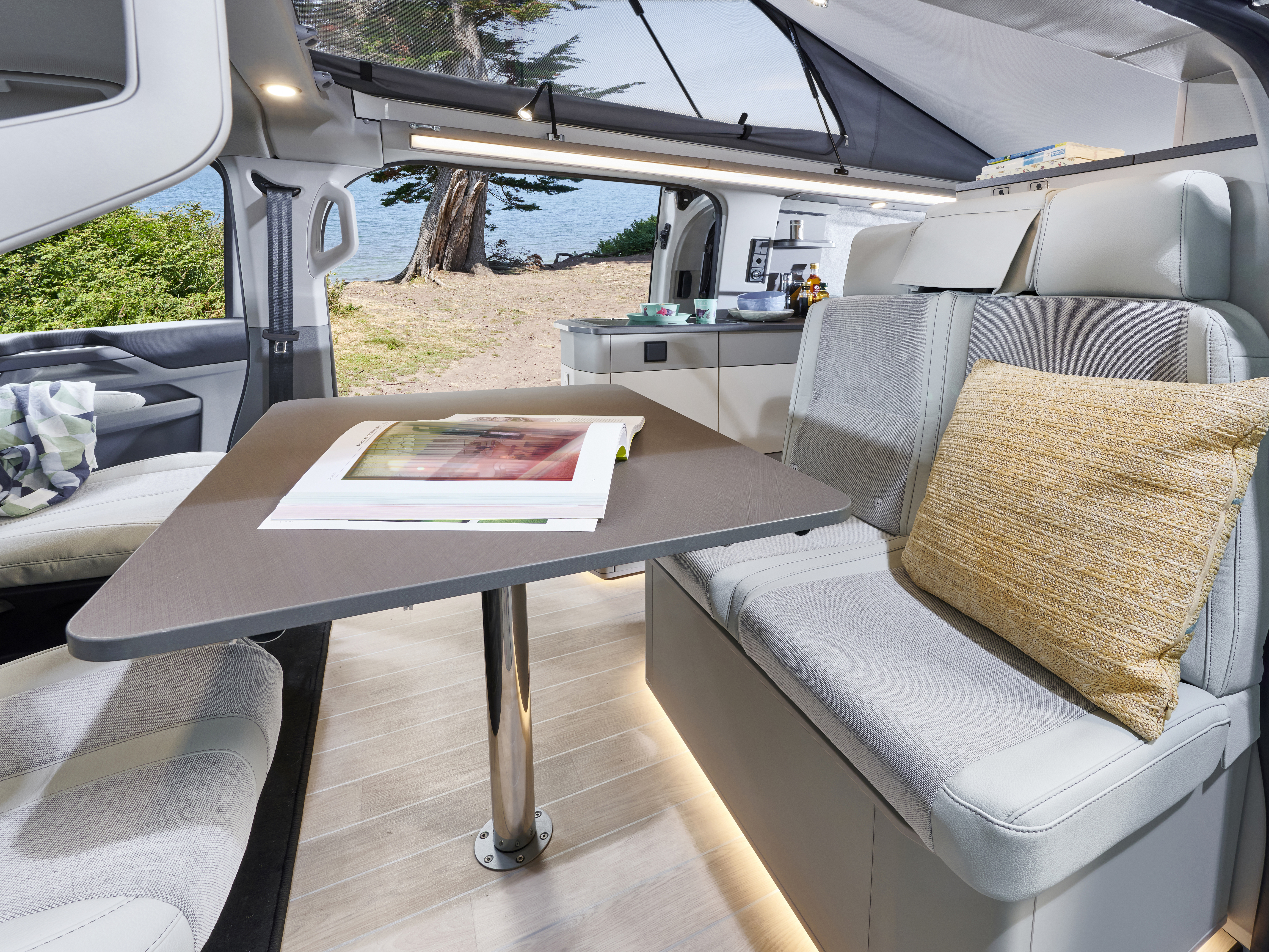 Up top, the pop-up roof bed turns nights into experiences, offering panoramic ventilation and a feeling of sleeping closer to the world around you. Down below, the living space is warm, modern and unmistakably Westfalia — premium materials, thoughtful lighting and clever storage everywhere you look.