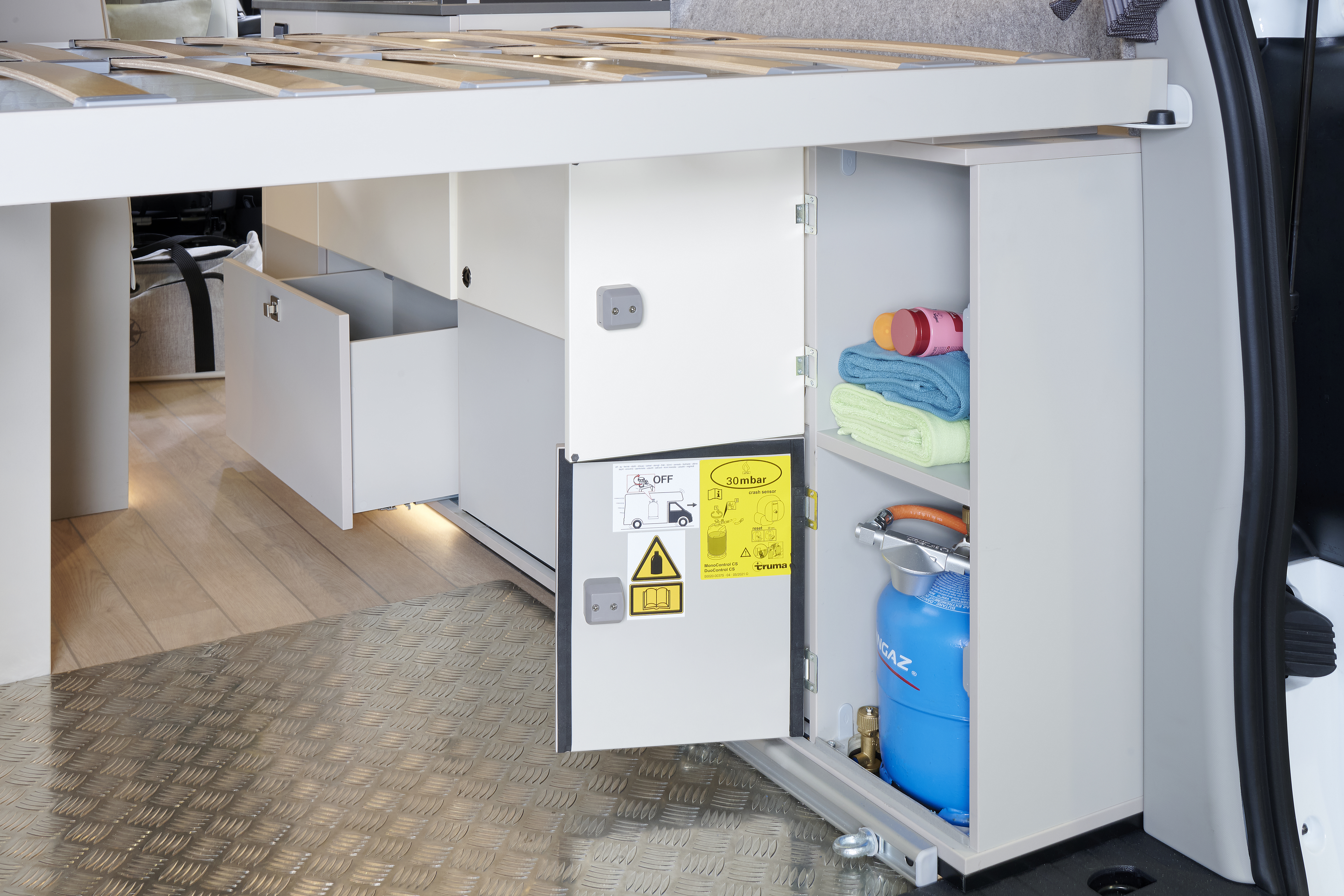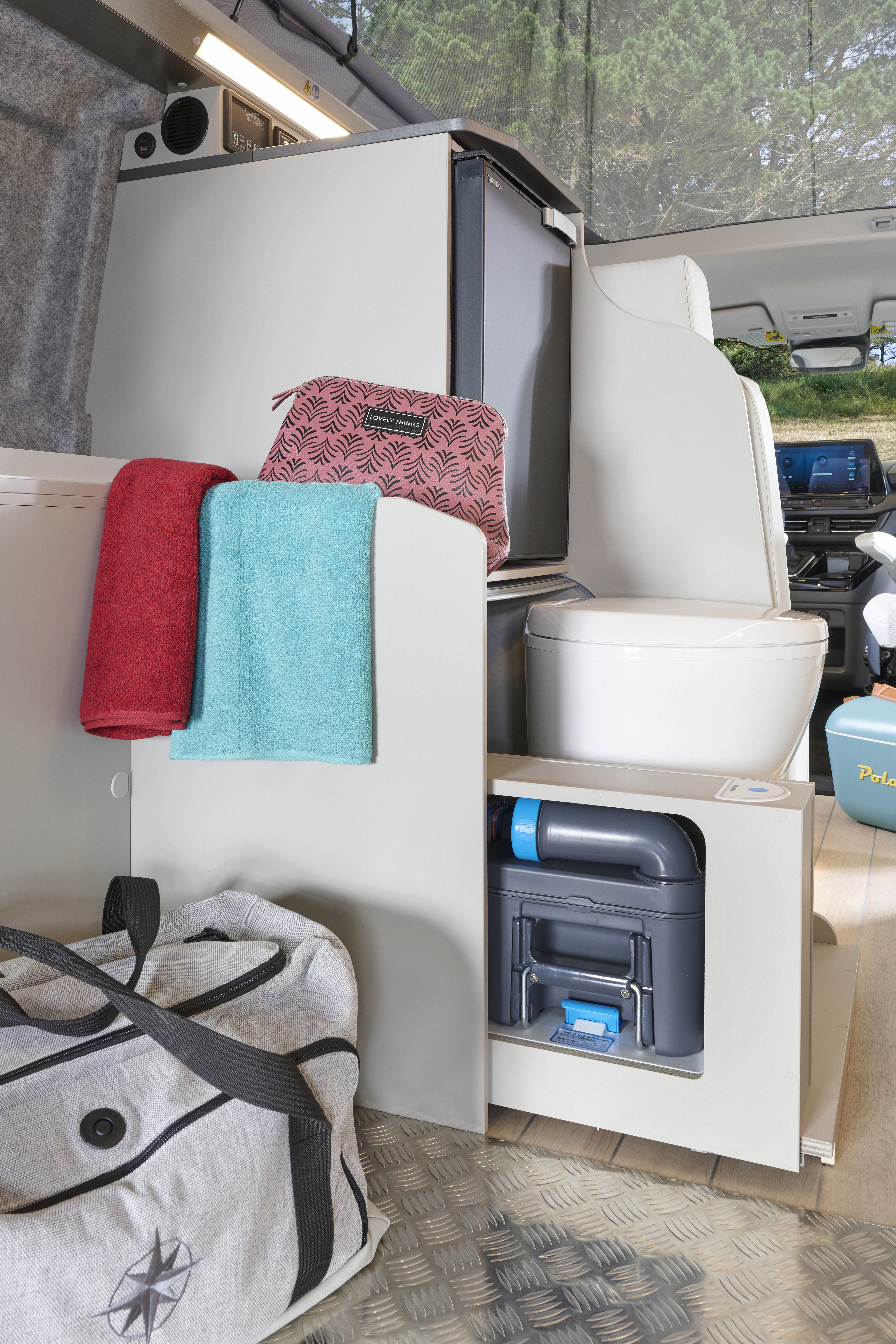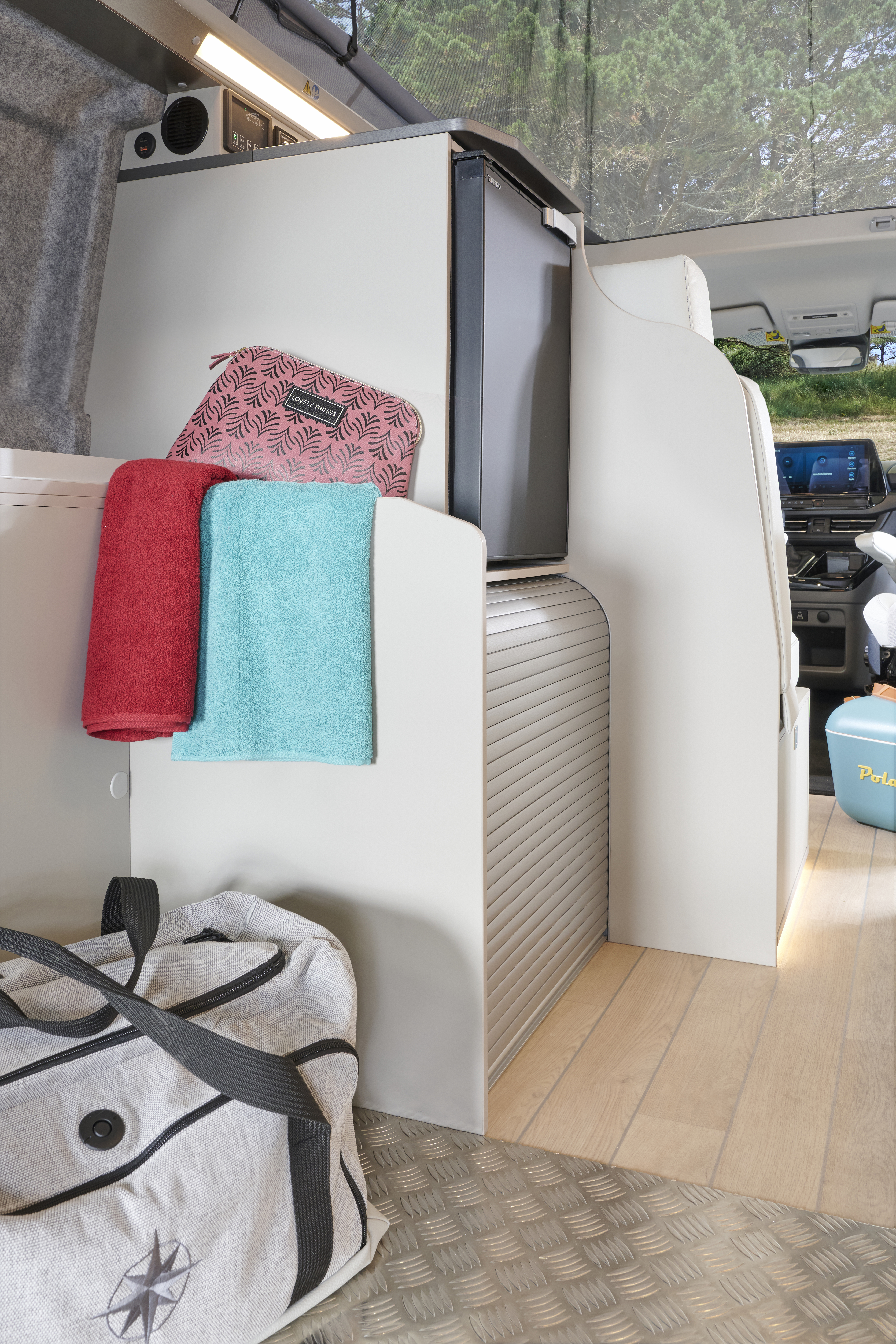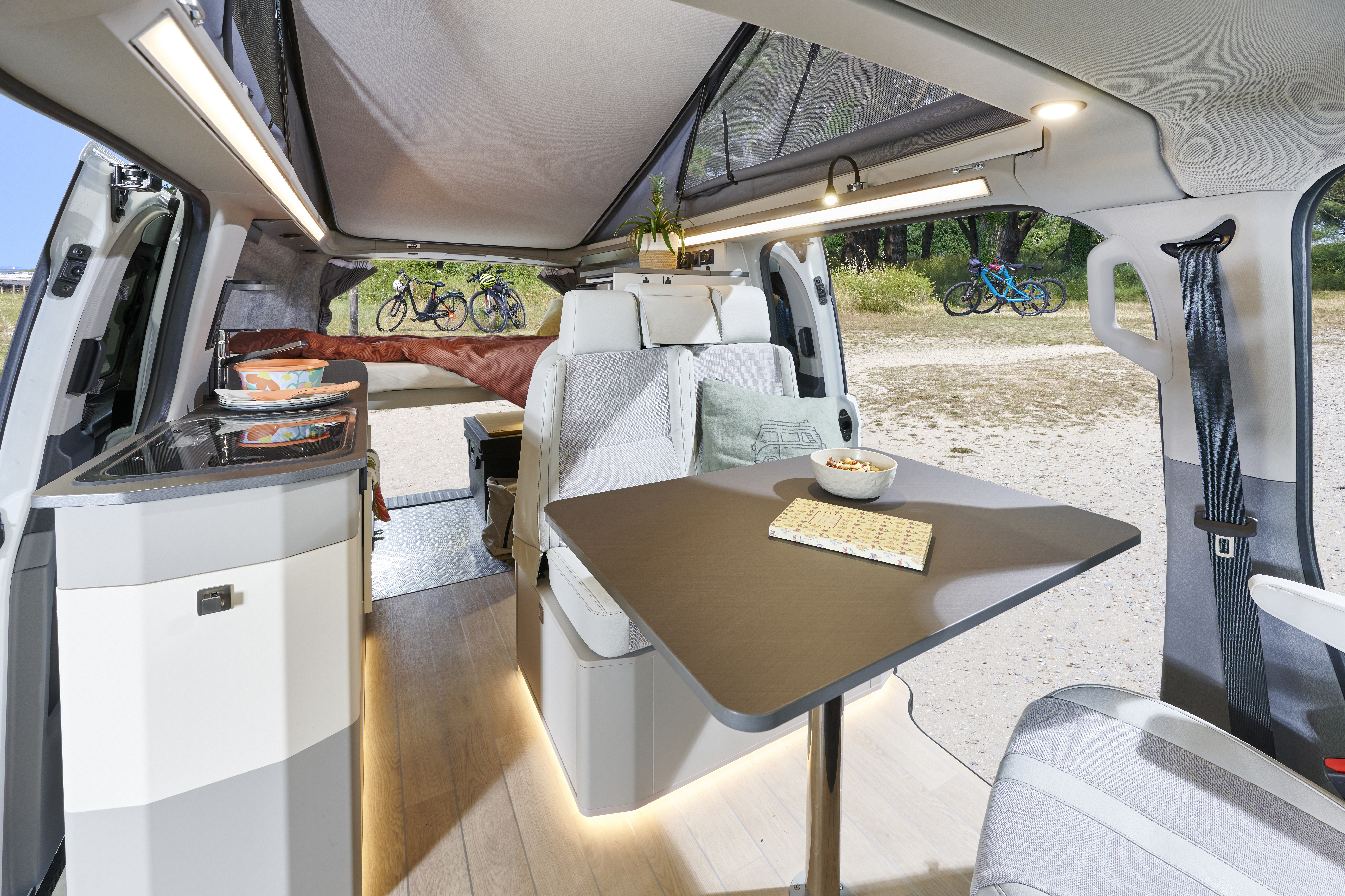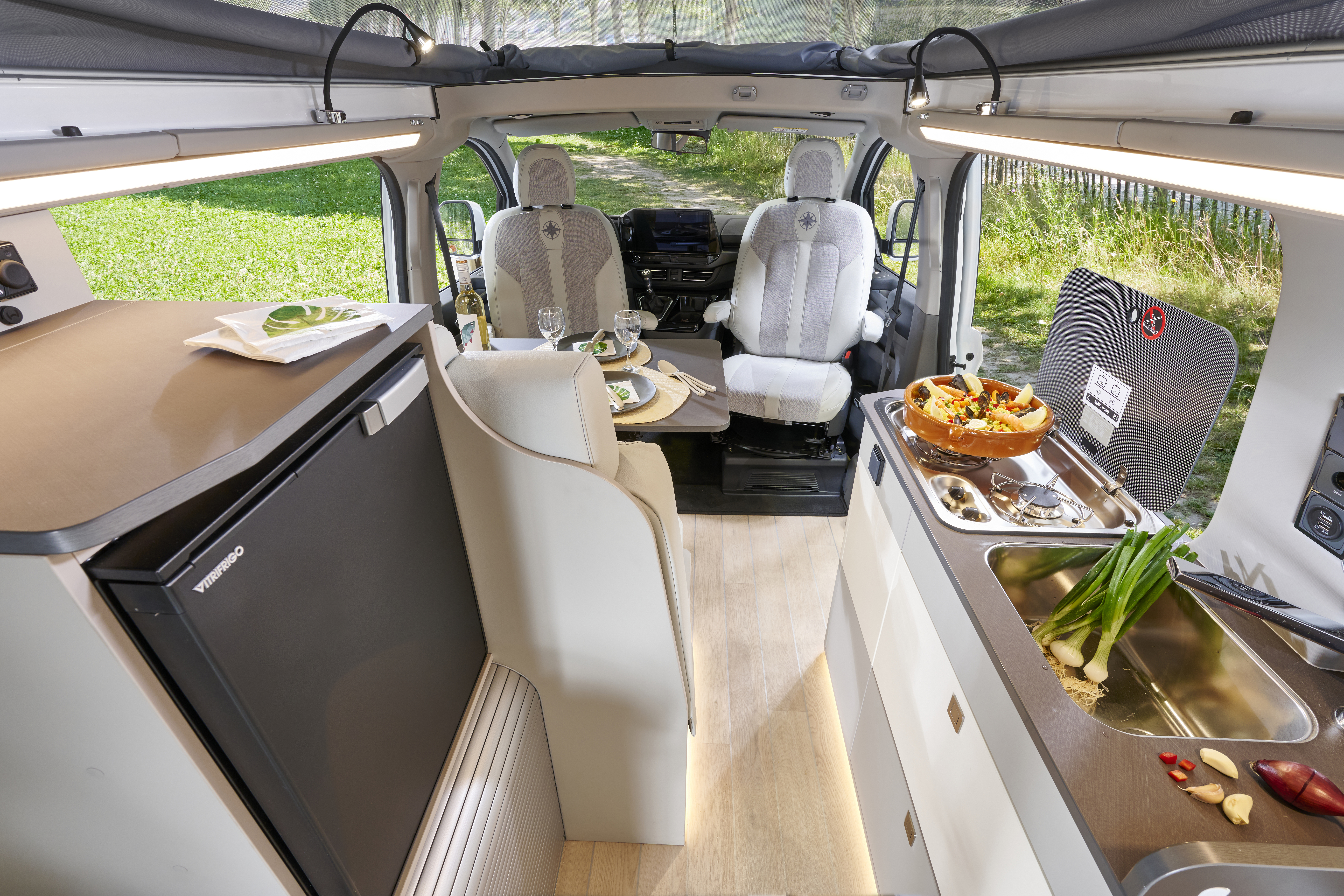 Up top, the pop-up roof bed turns nights into experiences, offering panoramic ventilation and a feeling of sleeping closer to the world around you. Down below, the living space is warm, modern and unmistakably Westfalia — premium materials, thoughtful lighting and clever storage everywhere you look.