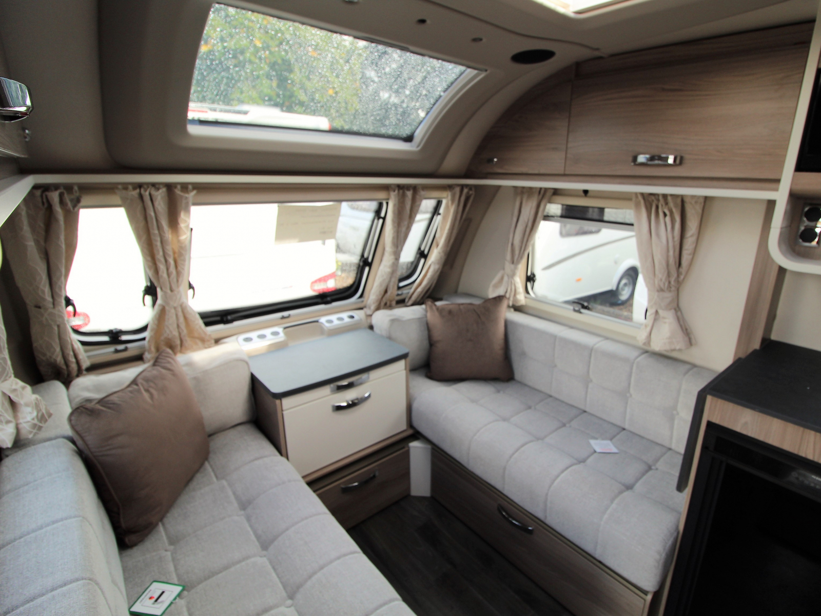 Offering a modern light and airy front lounge/dining area with twin bench seats and a centre chest of drawers. The bench seats can easily convert to a double bed if required on an evening. With storage offered below the bench seats and overhead lockers.