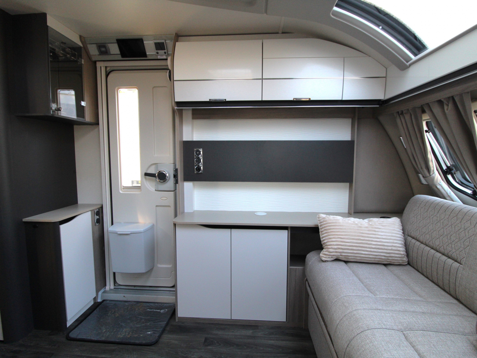 Contrasting grey GRP sidewall with NEW stylish exterior graphics scheme, and two nearside and one offside LED awning light. Plus, external service doors to access underbed storage.
