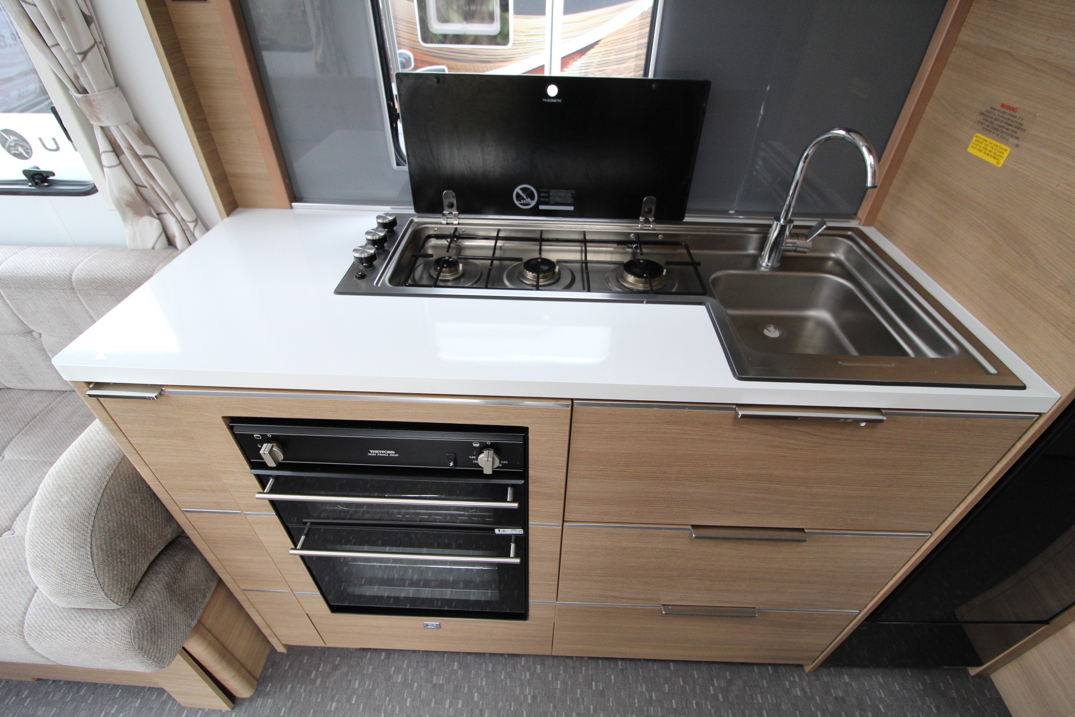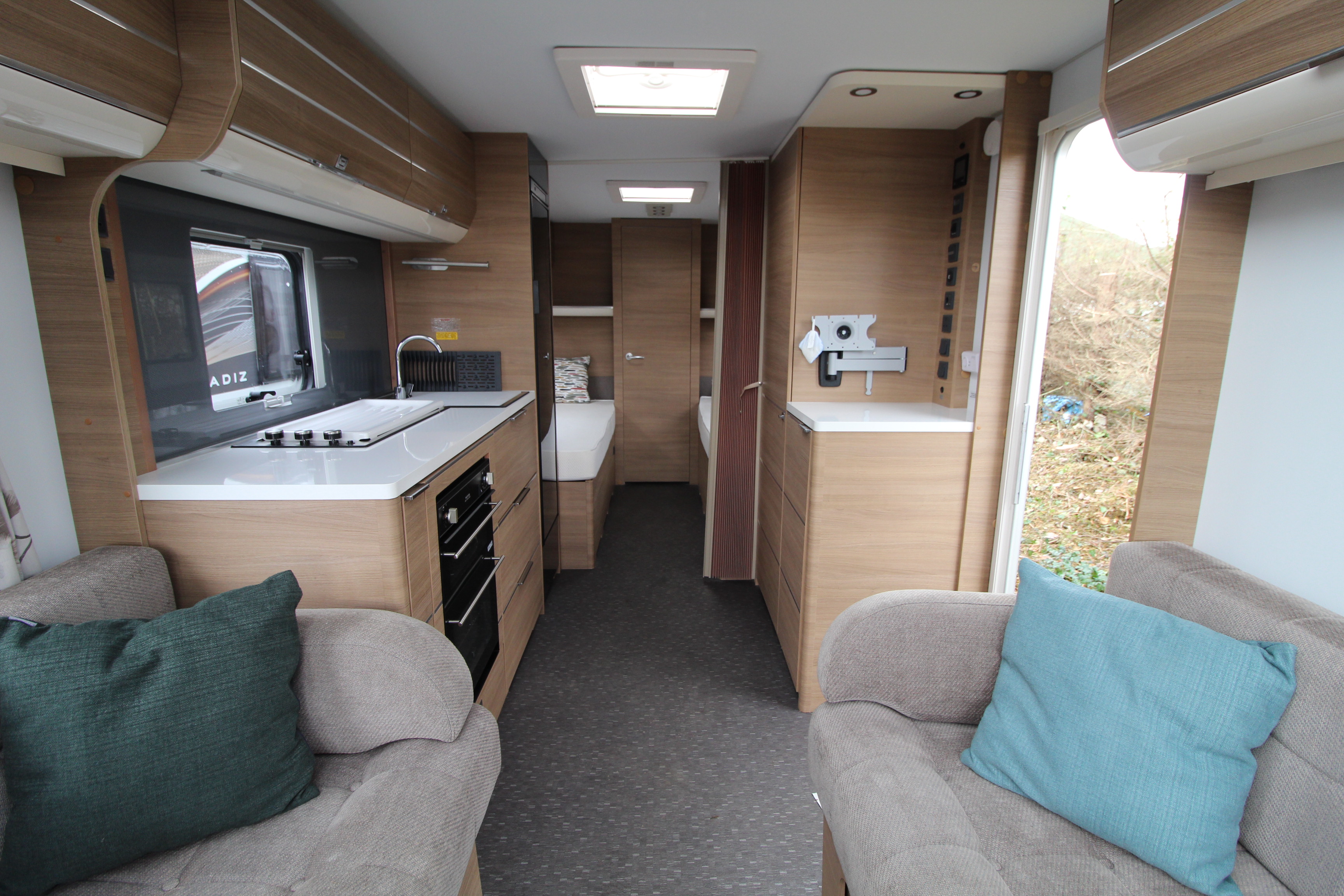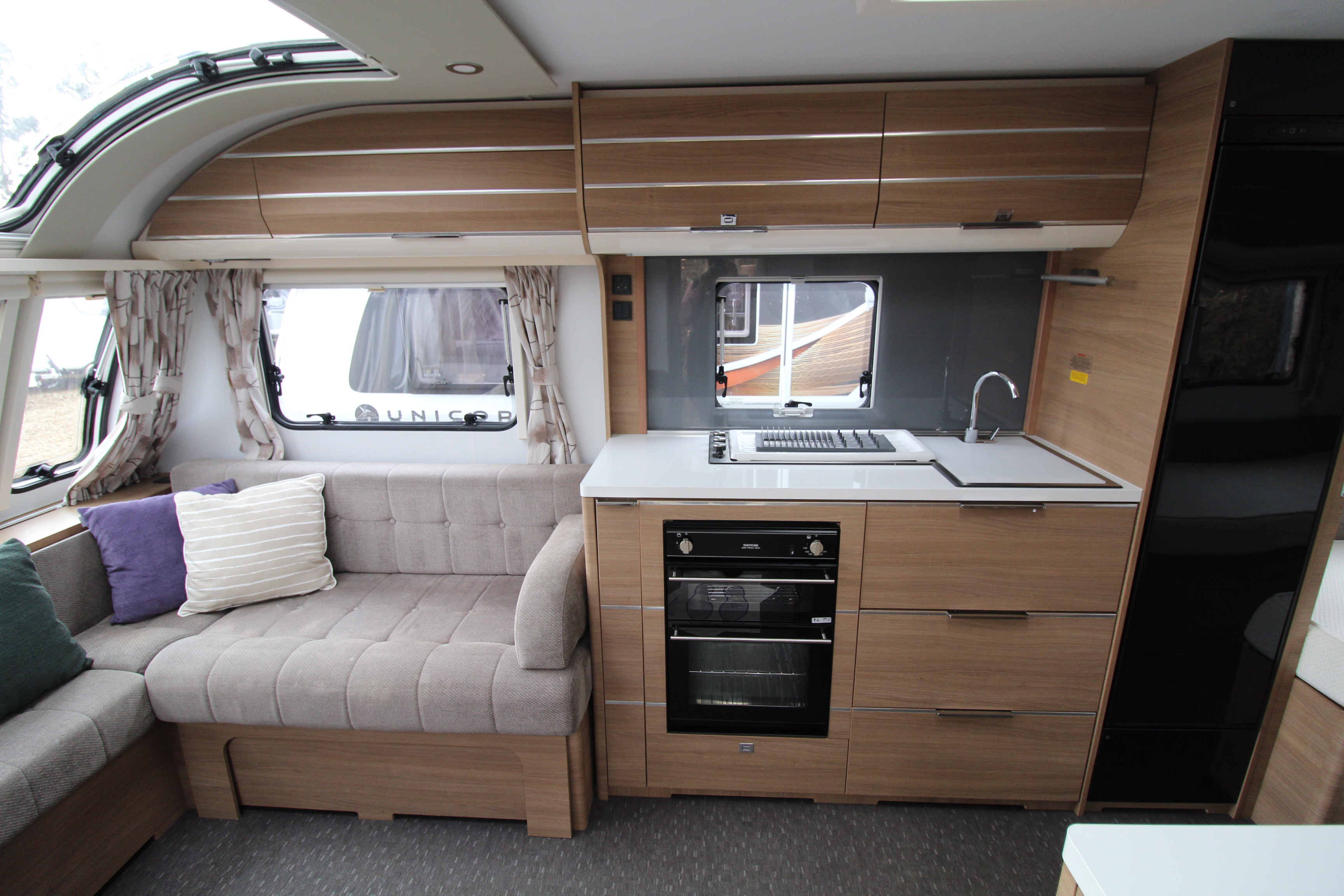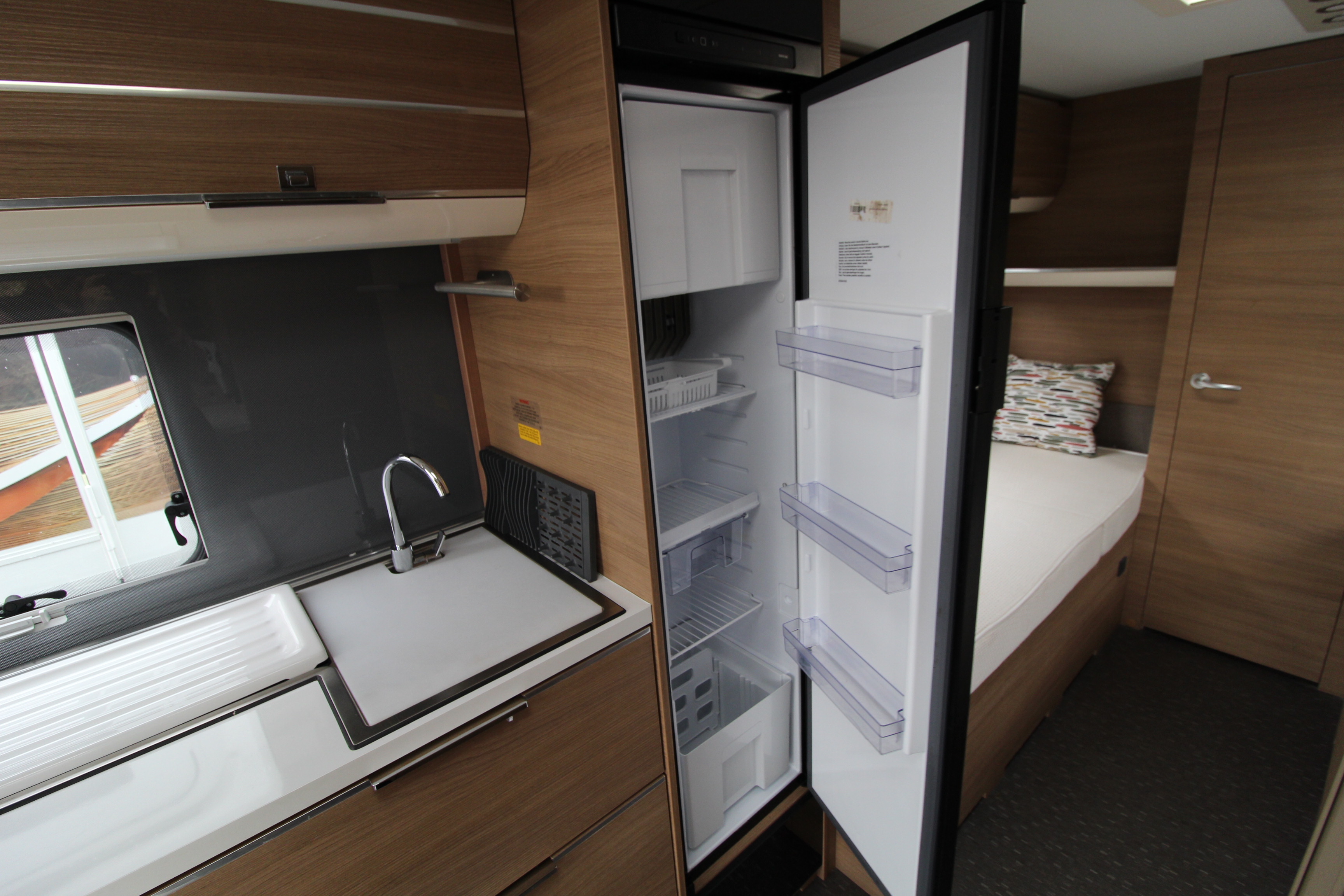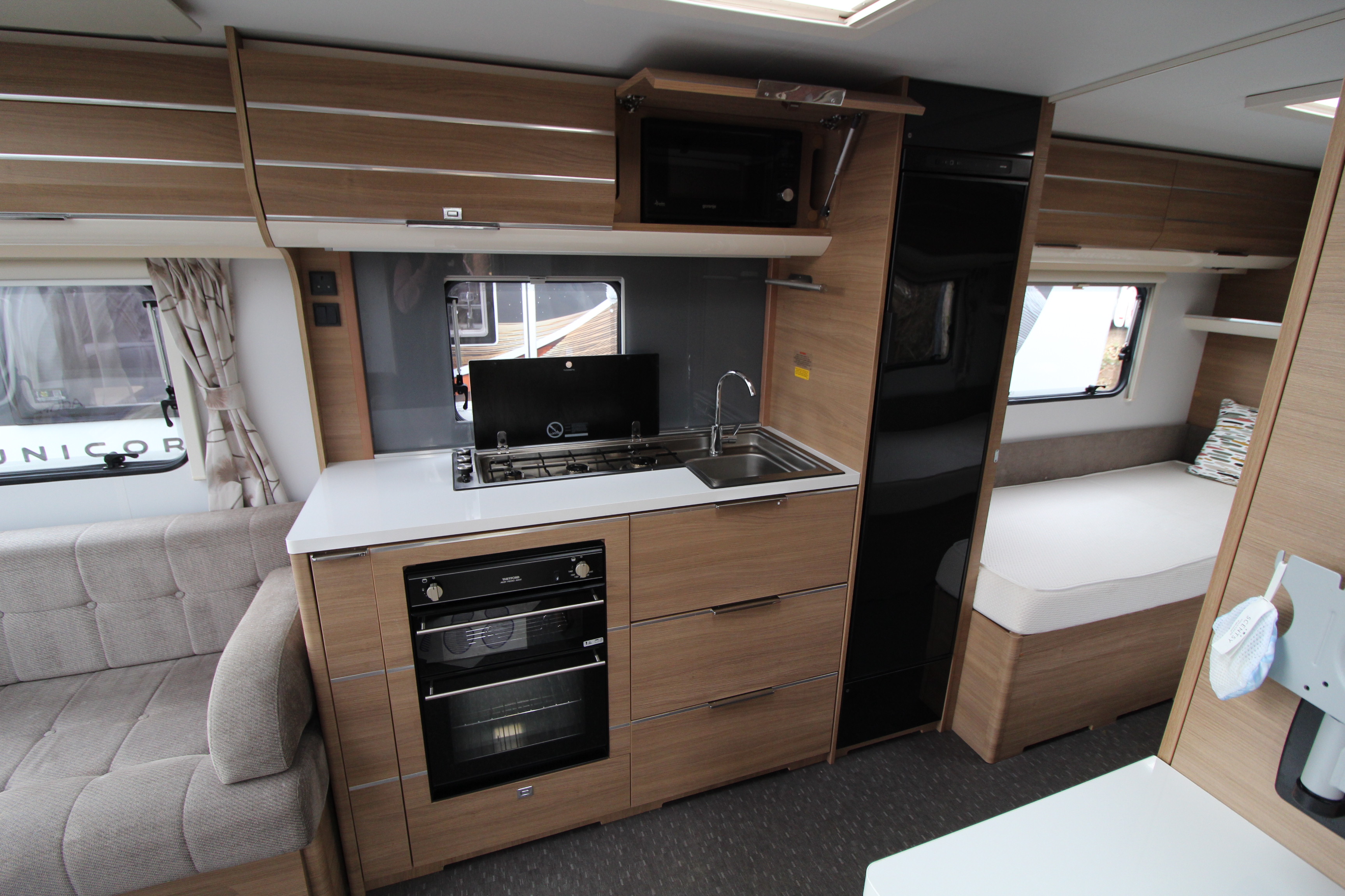 The well fitted kitchen is equipped with everything you need for a short weekend break or long touring adventures. The kitchen offers a hob, oven, grill, tall fridge along with ample extendable worksurface and storage cupboard units.