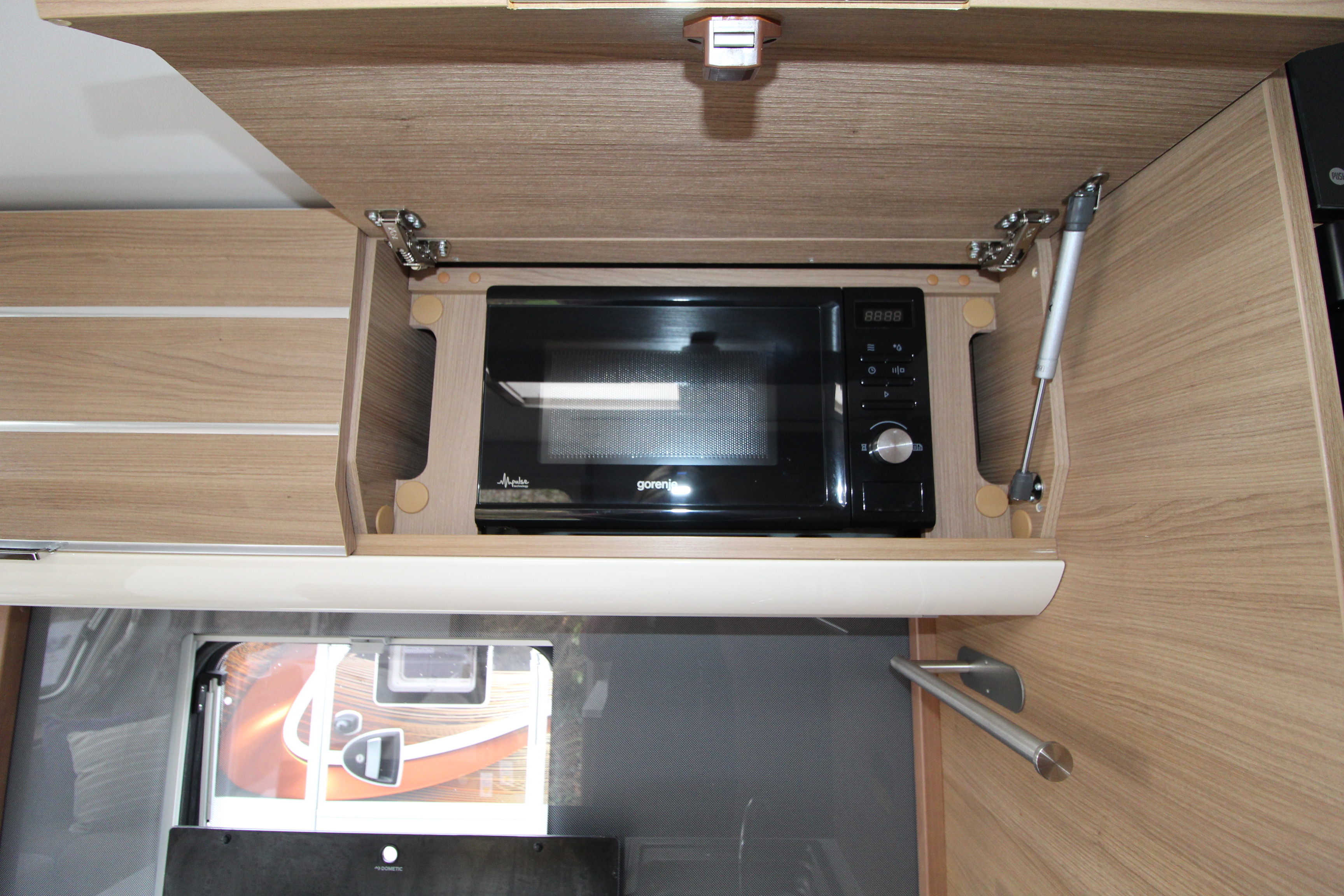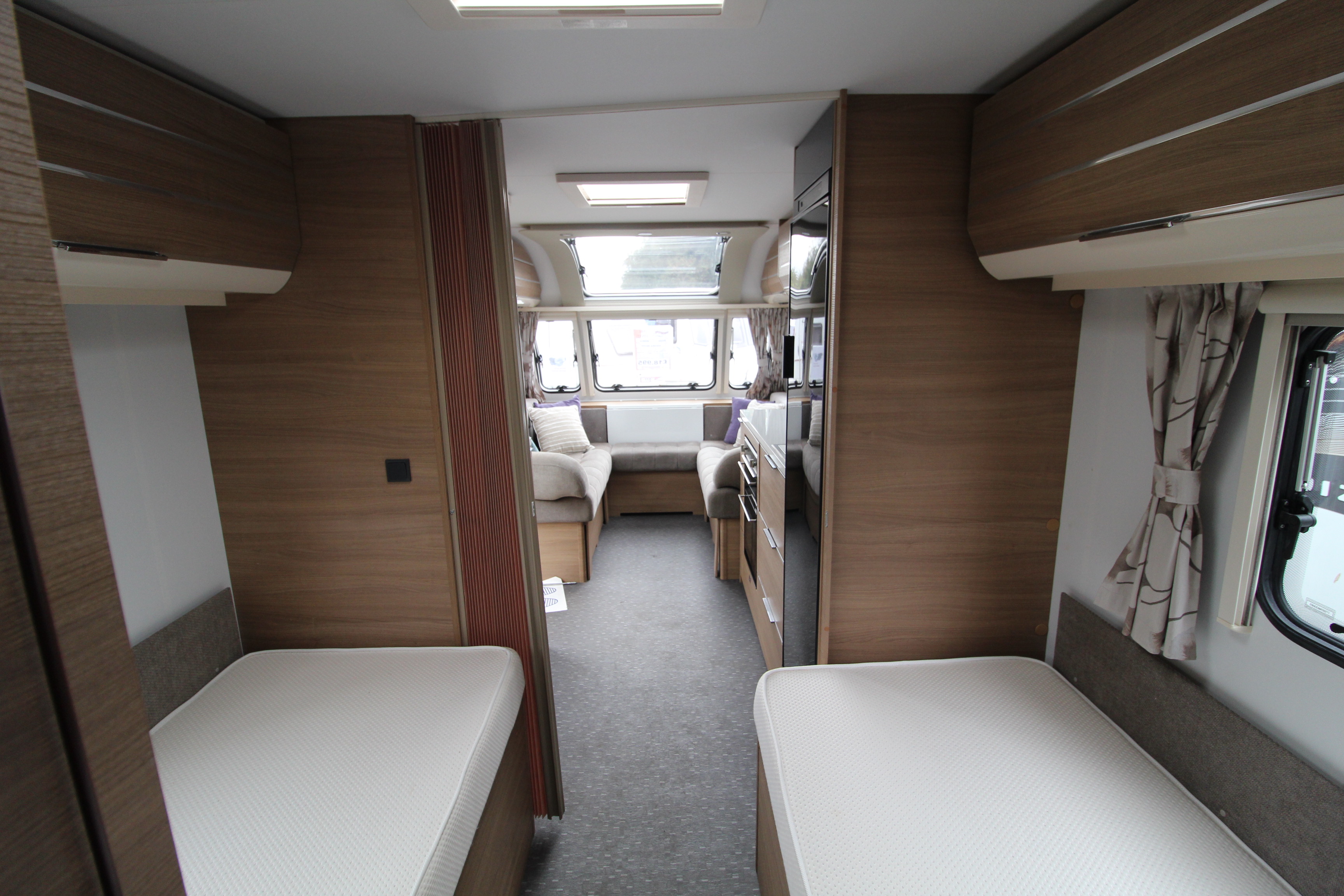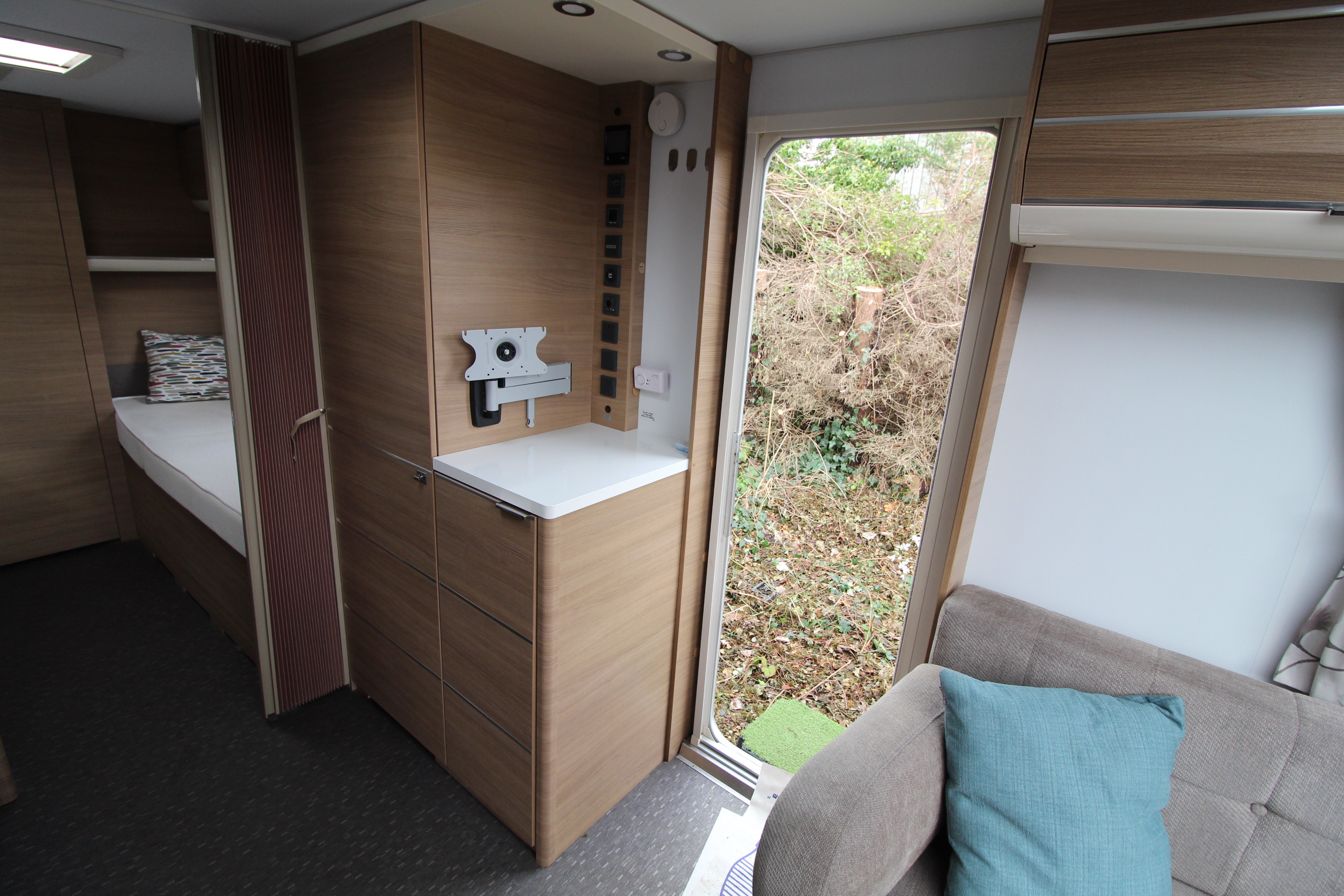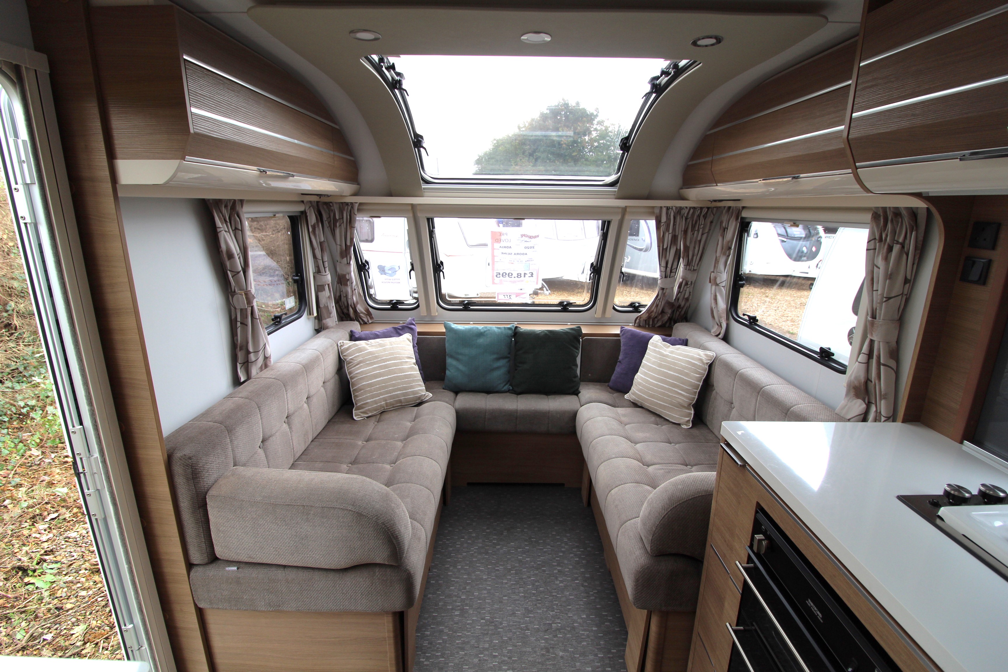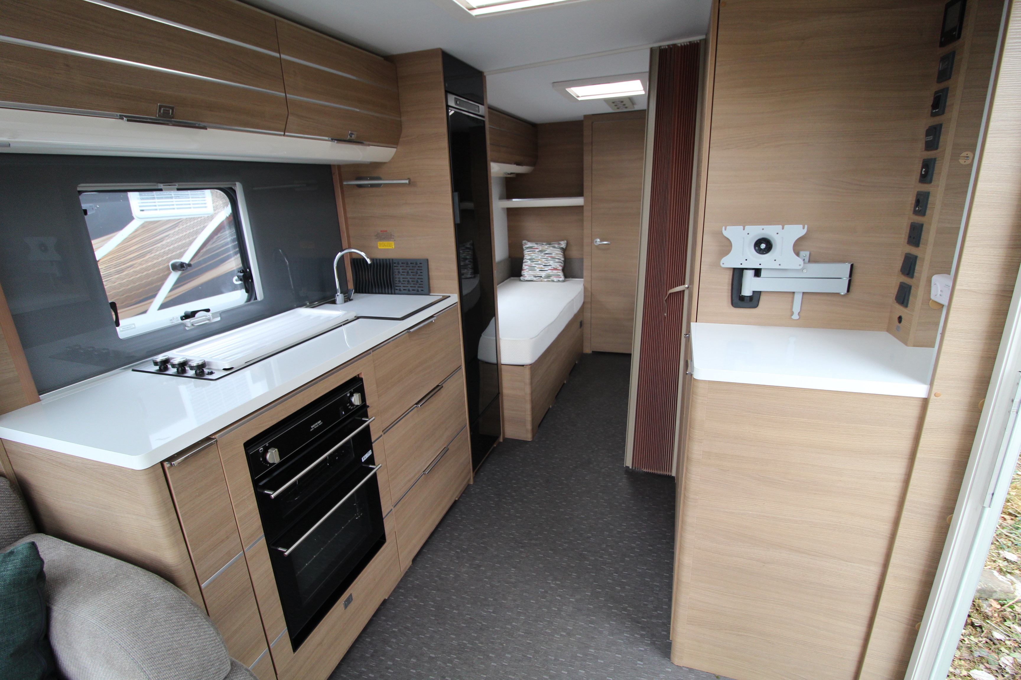 The well fitted kitchen is equipped with everything you need for a short weekend break or long touring adventures. The kitchen offers a hob, oven, grill, tall fridge along with ample extendable worksurface and storage cupboard units.