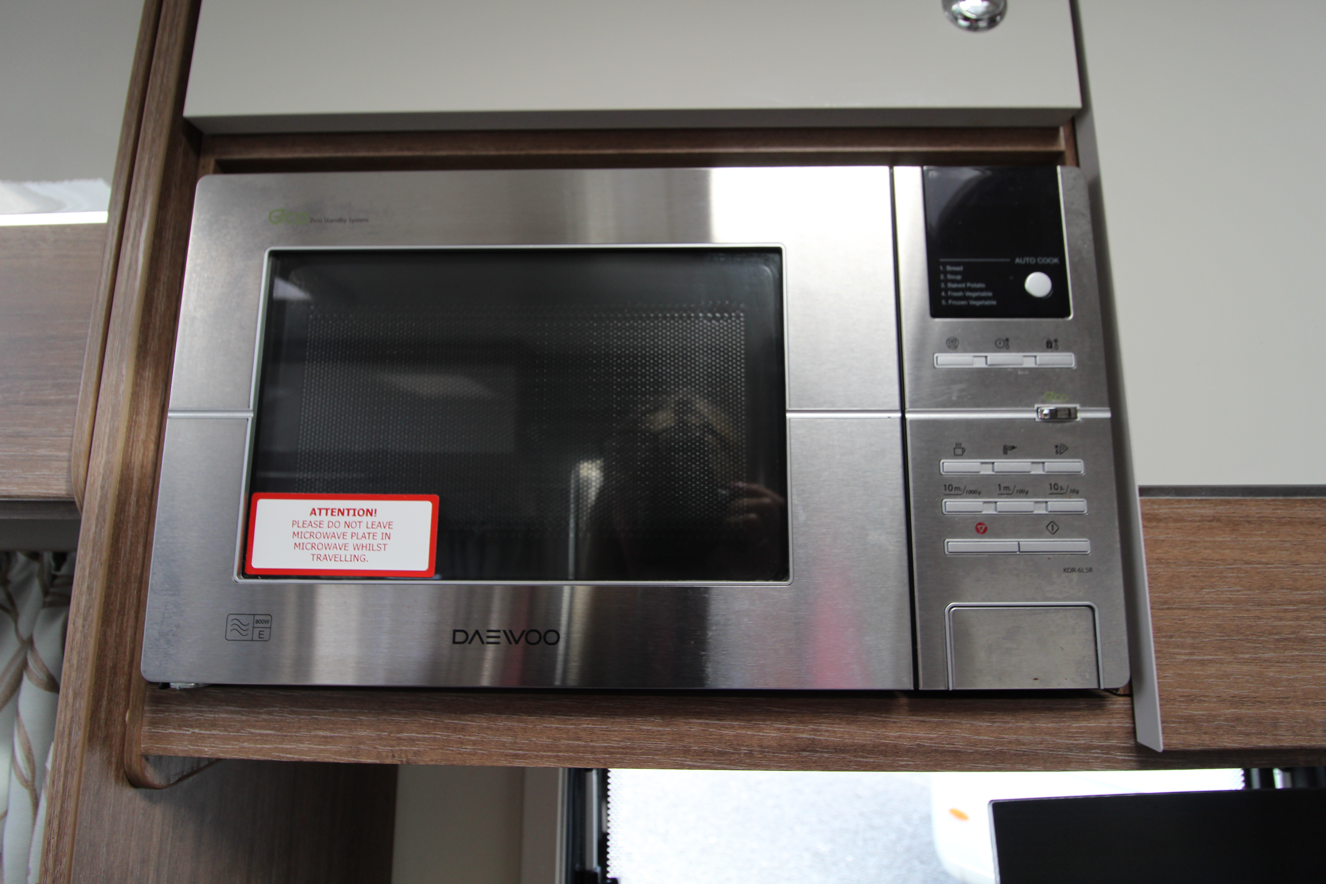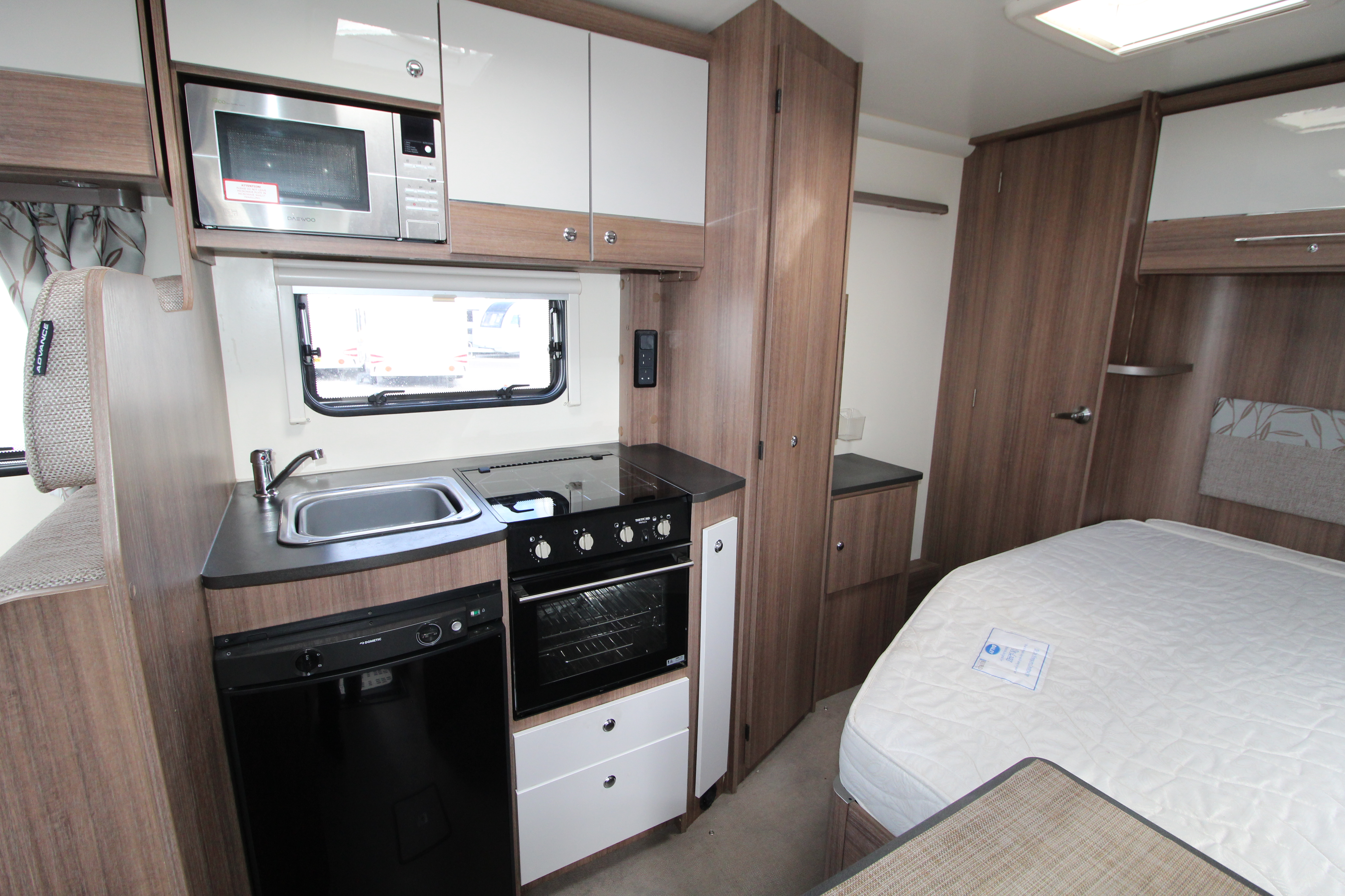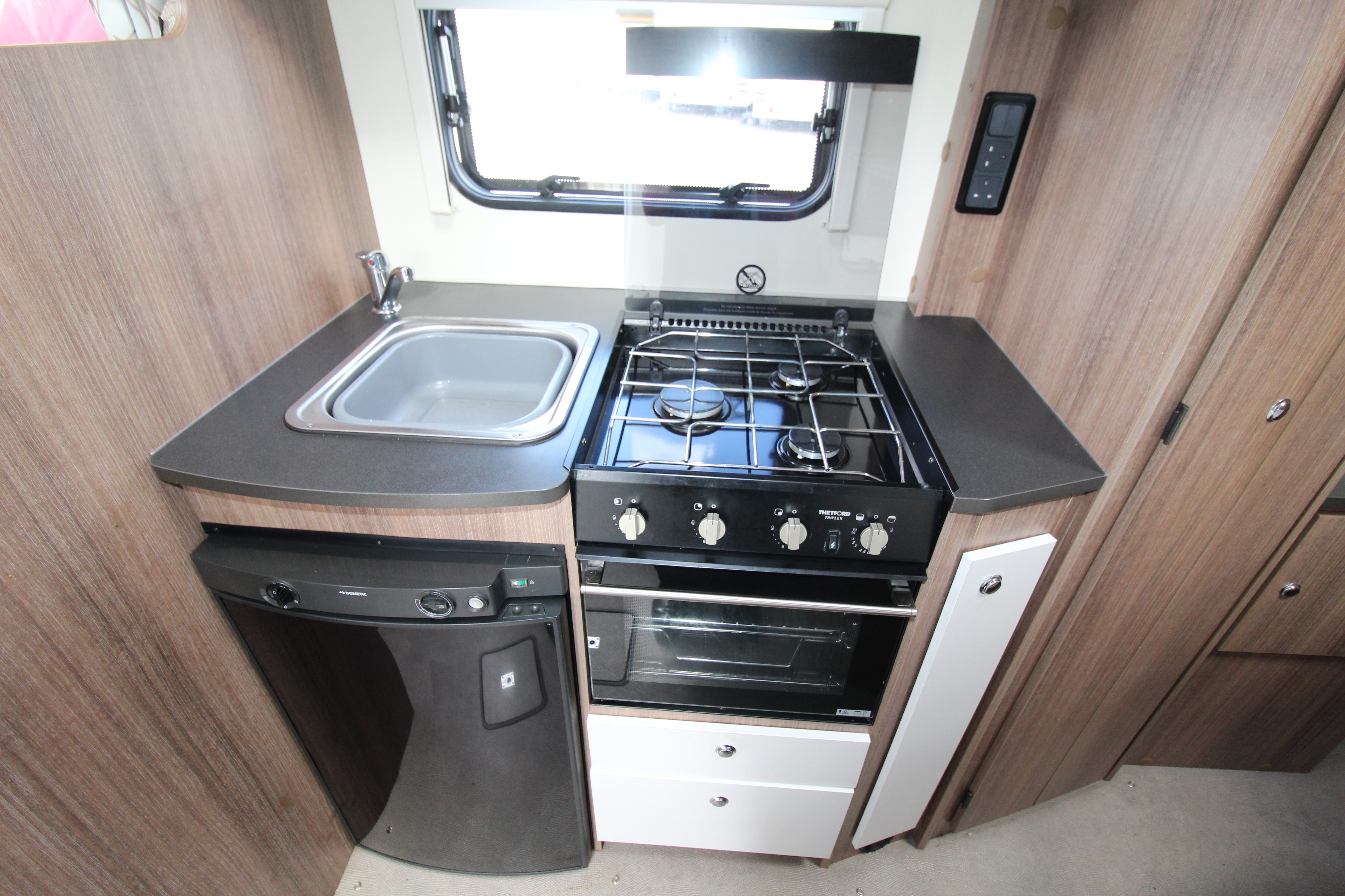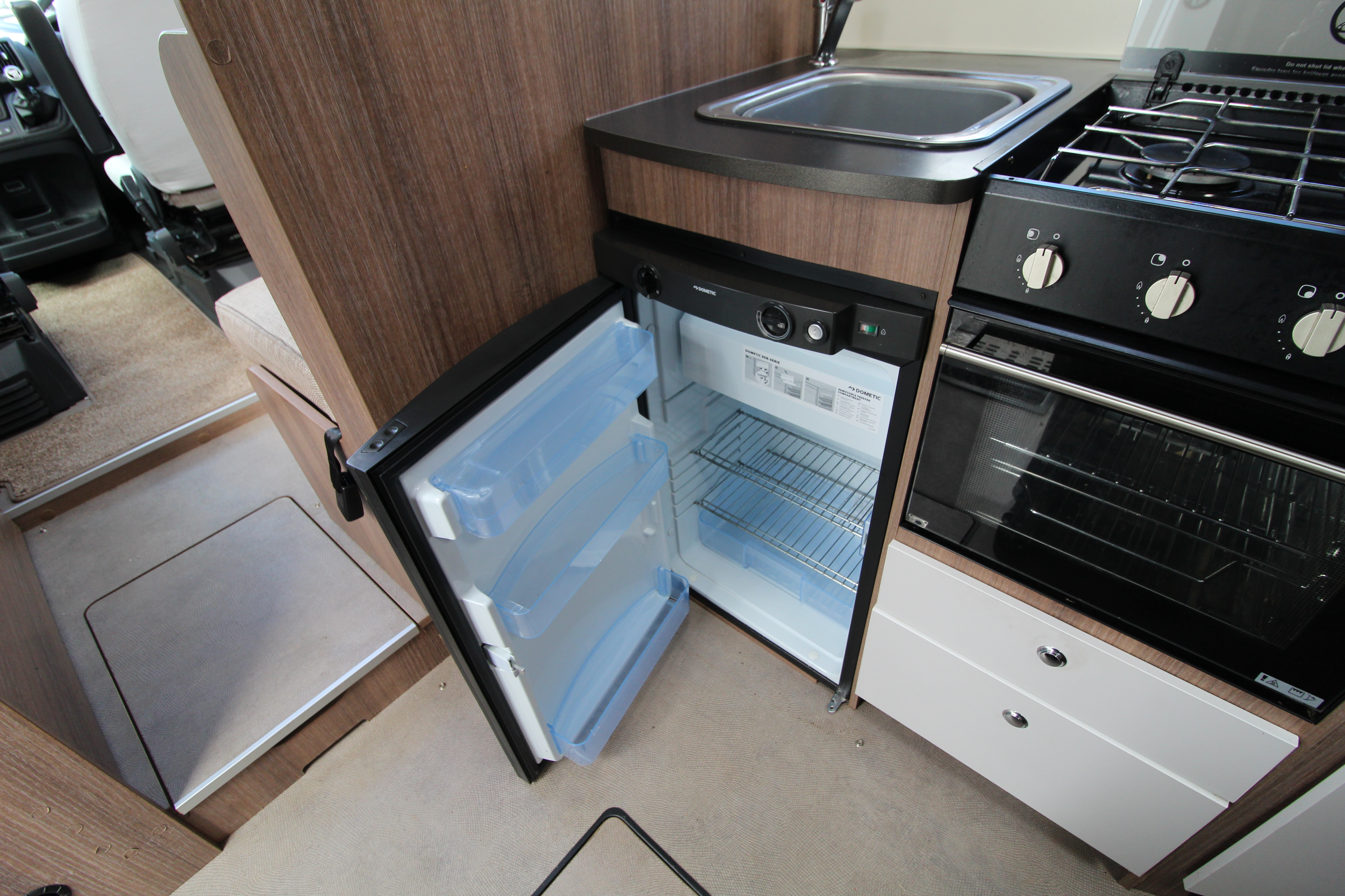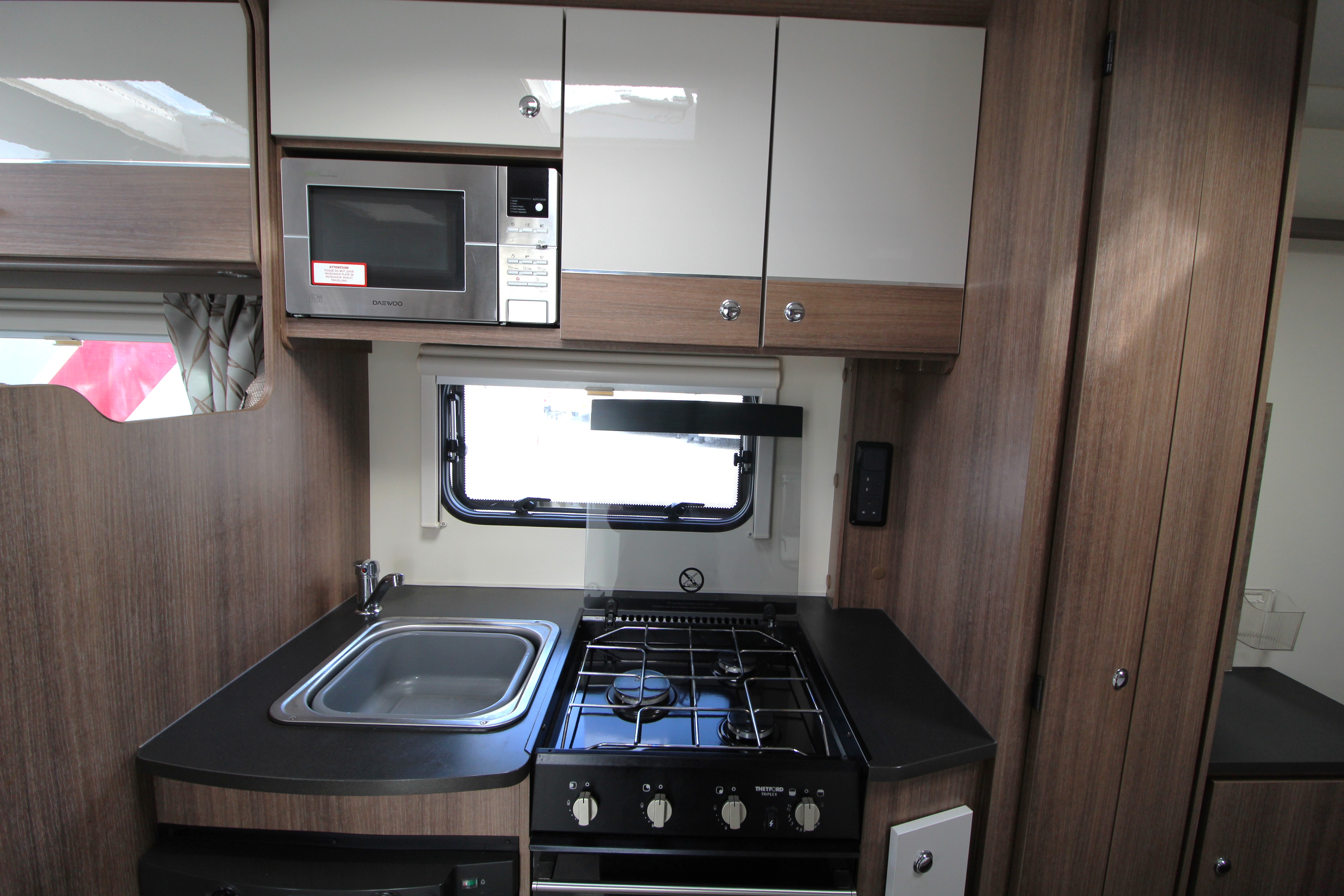 Mid-ship kitchen facilities provide a Thetford Triplex combination oven and grill with three gas burner hob, Dometic 95 litre refrigerator with detachable freezer compartment, microwave and ample storage cupboards.