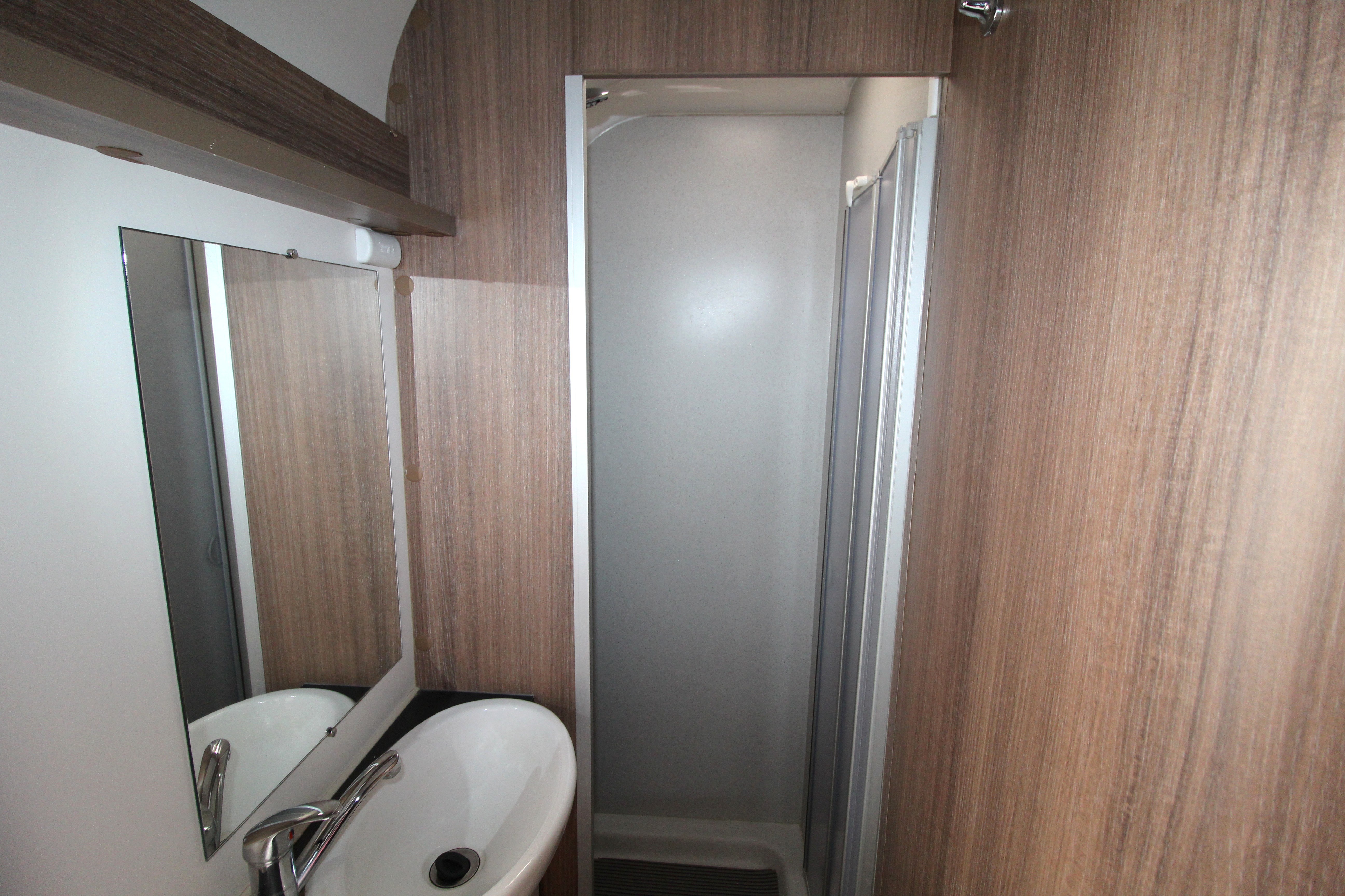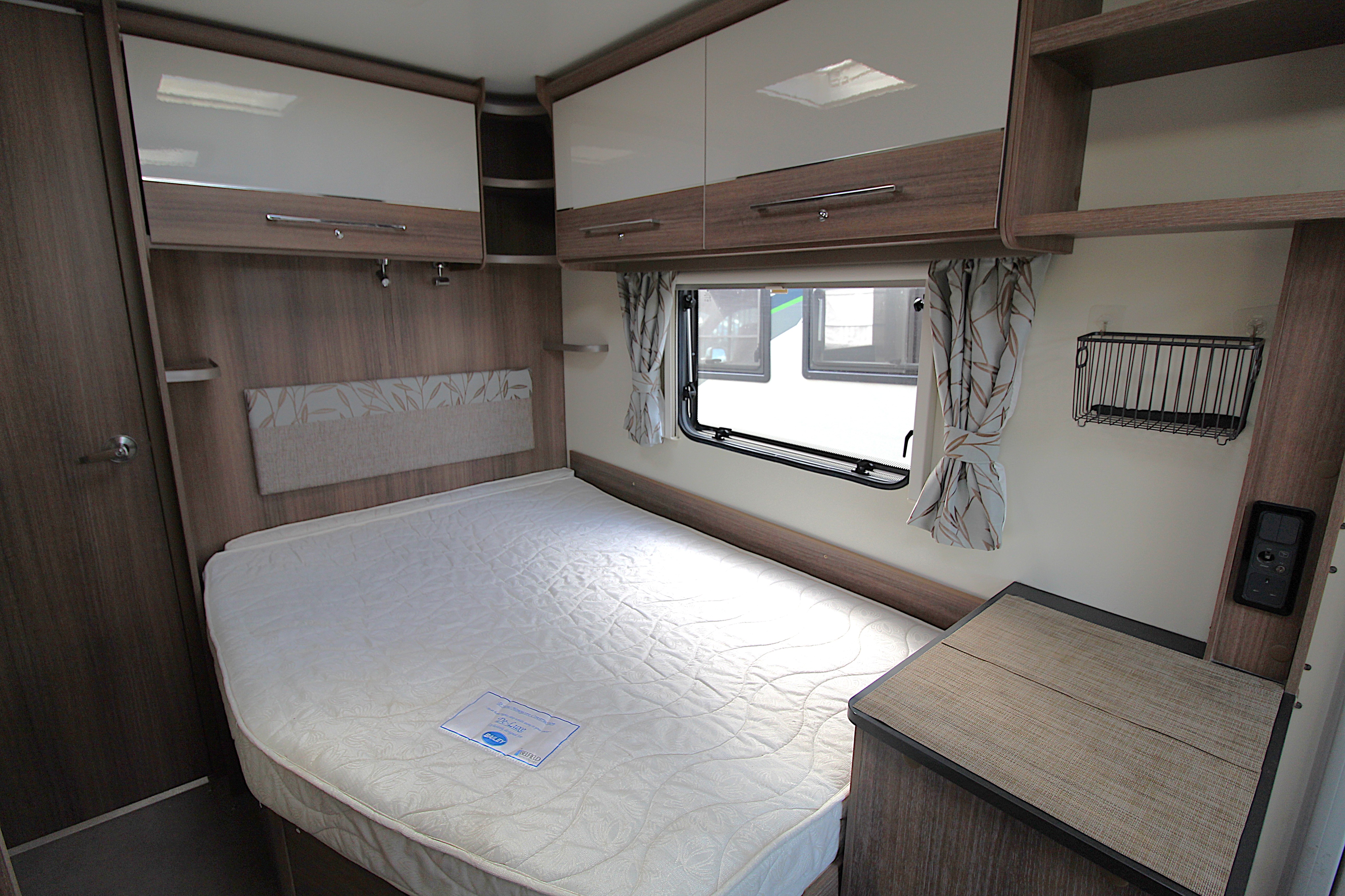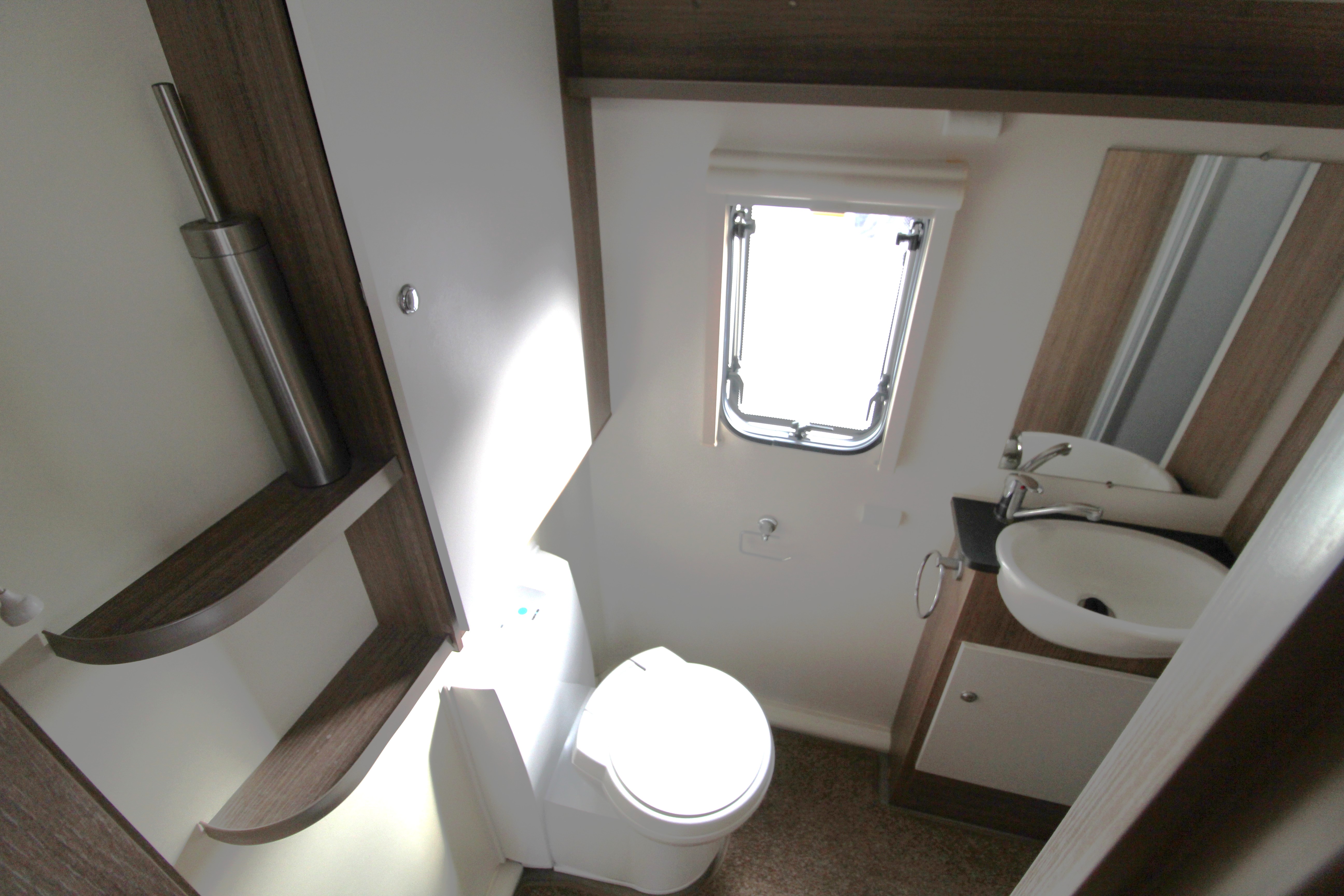 Moving through to the main bedroom area you will find a corner bed, with lockers overhead, a vanity mirror, wardrobe storage and access to your full width end washroom. Comfort facilities include a vanity sink, cassette toilet and shower cubicle.