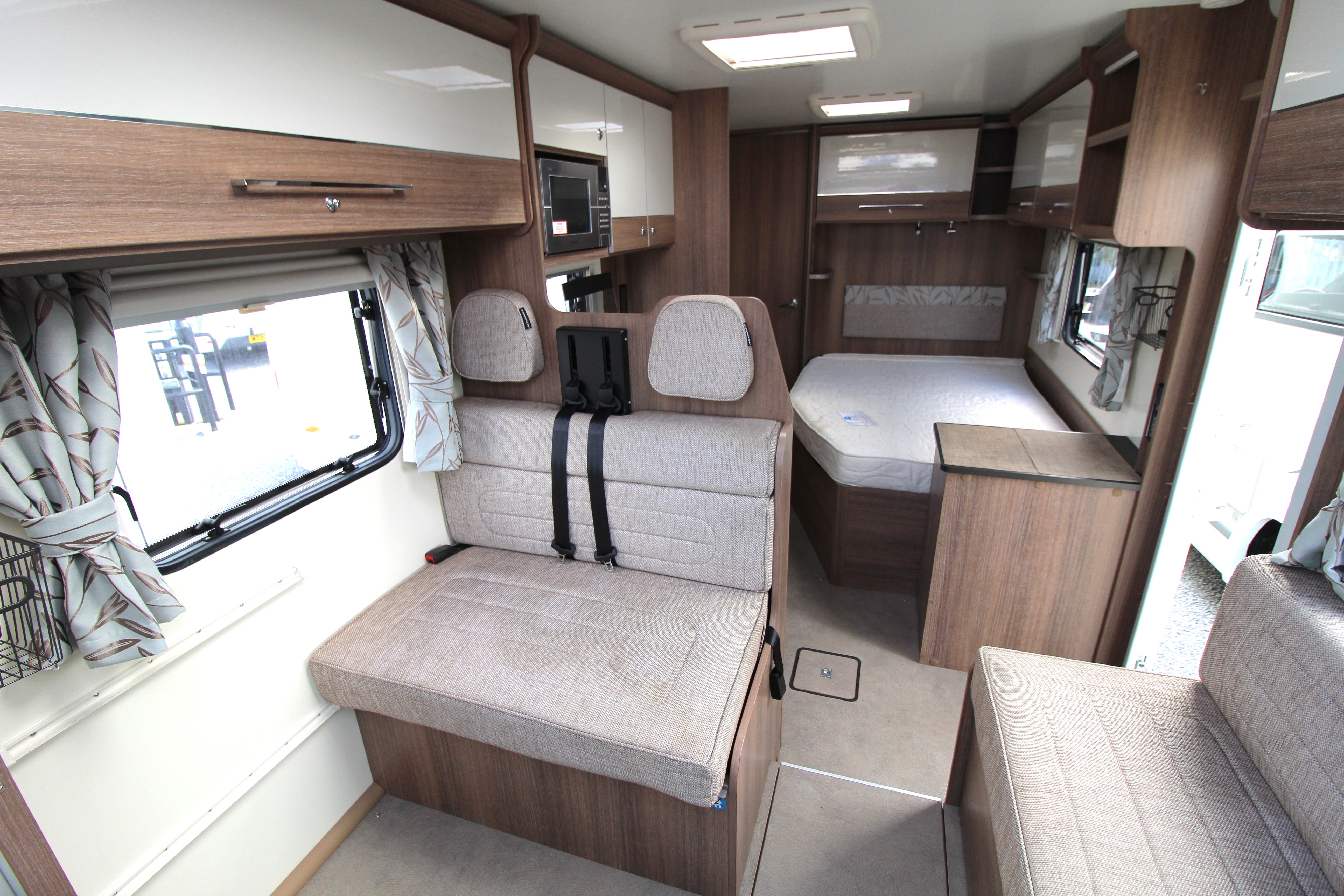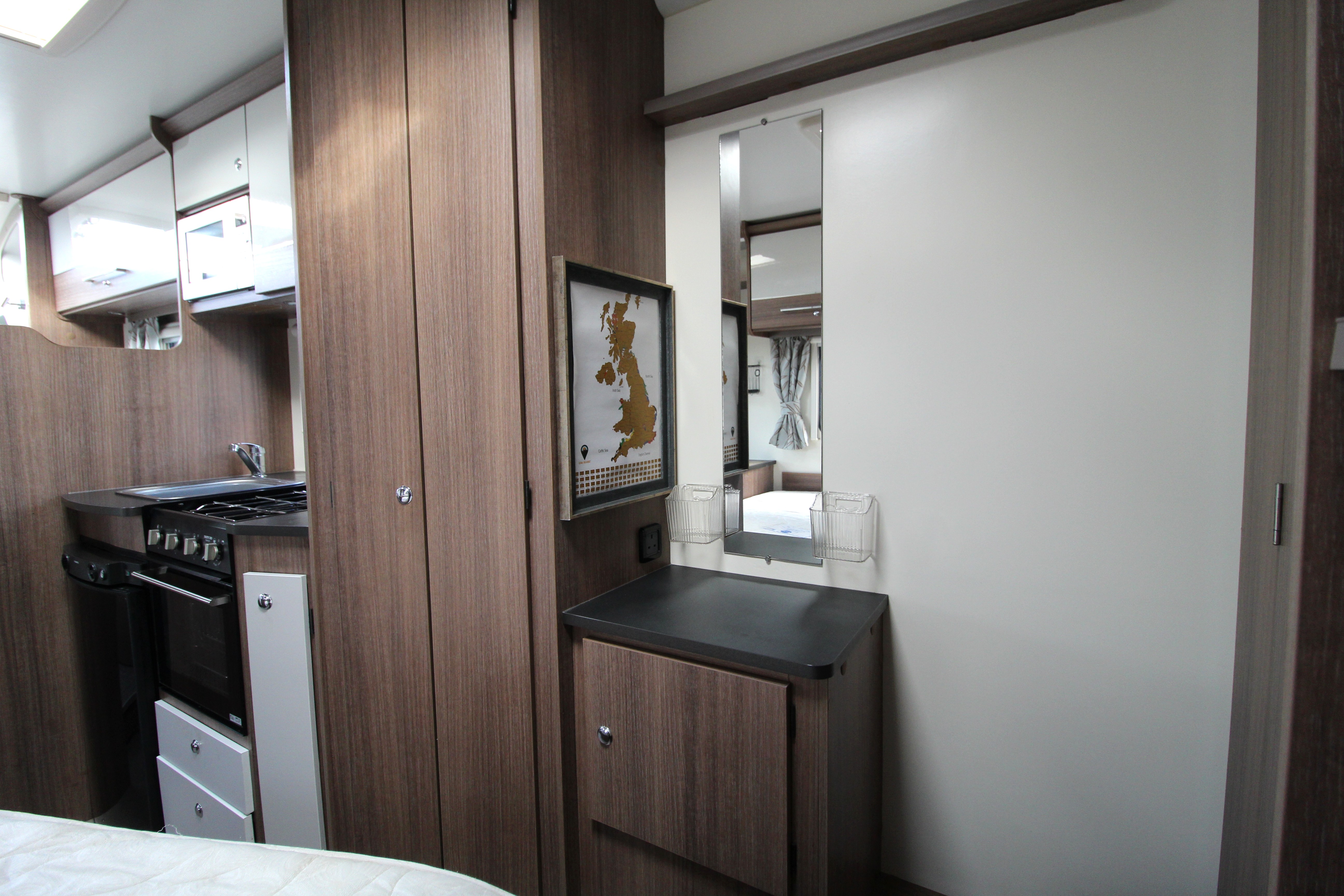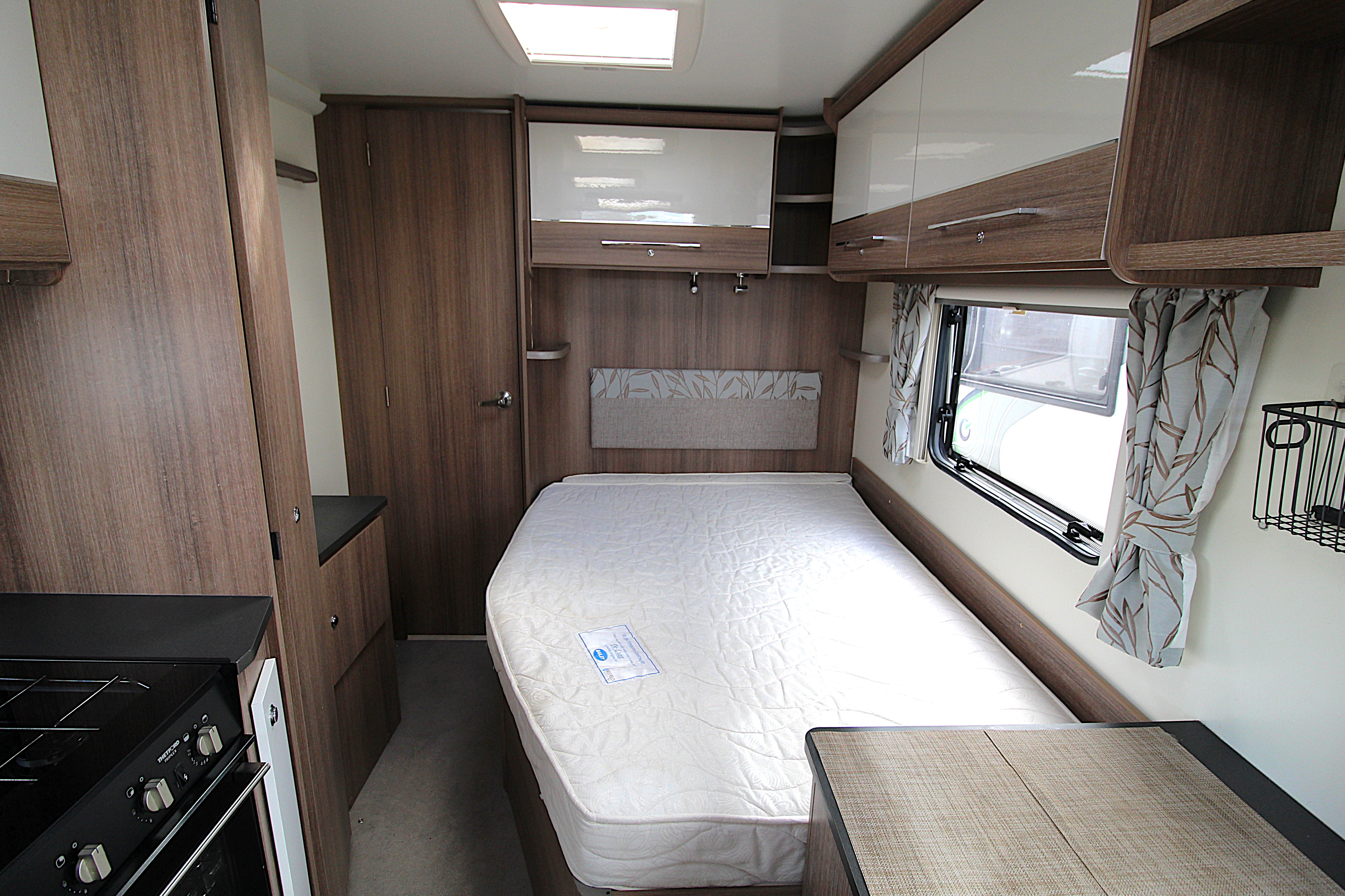 Moving through to the main bedroom area you will find a corner bed, with lockers overhead, a vanity mirror, wardrobe storage and access to your full width end washroom. Comfort facilities include a vanity sink, cassette toilet and shower cubicle.