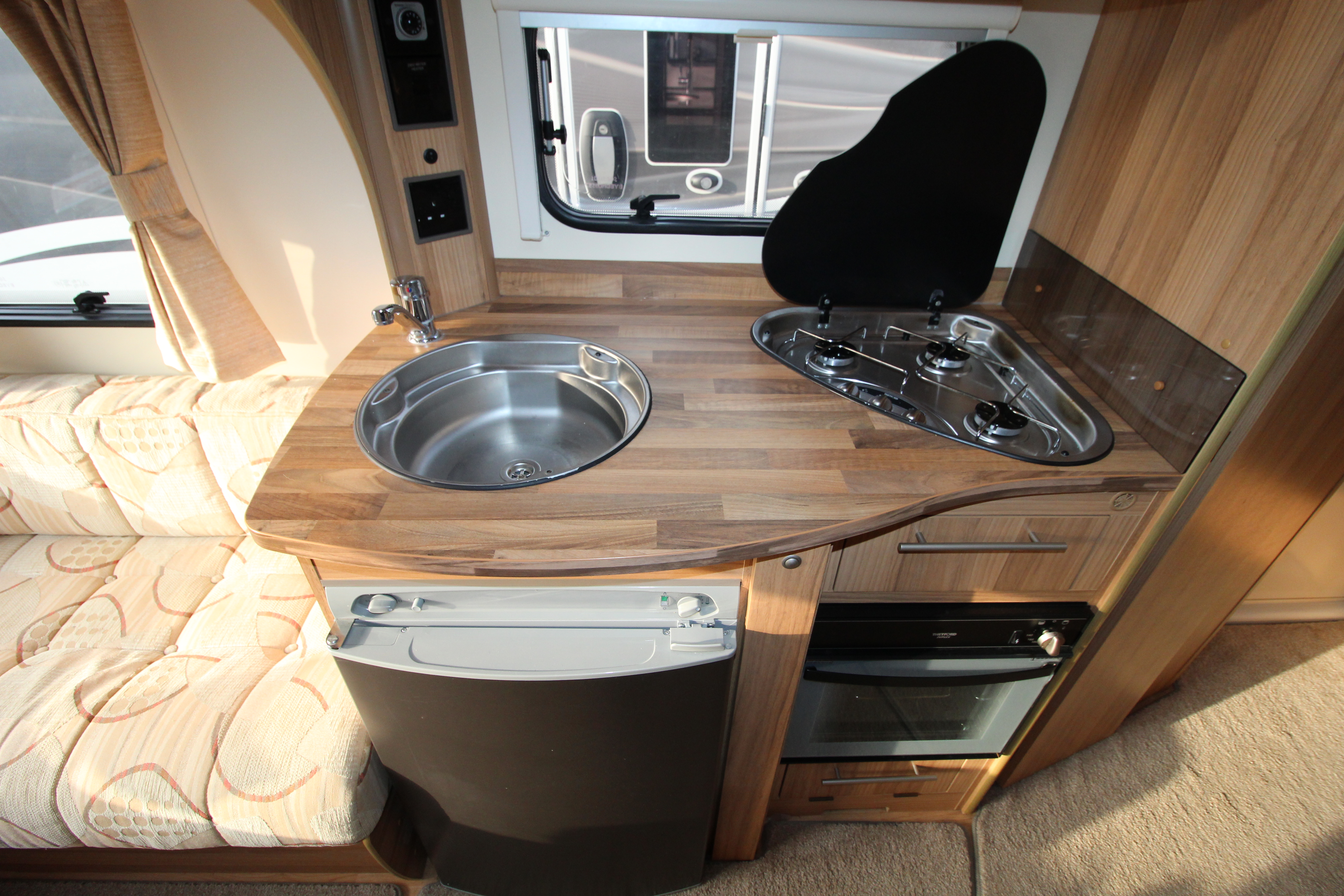 Thetford Duplex combination oven and grill with 3-burner gas hob incorporating flush fitting glass hinged lid and conveniently located controls